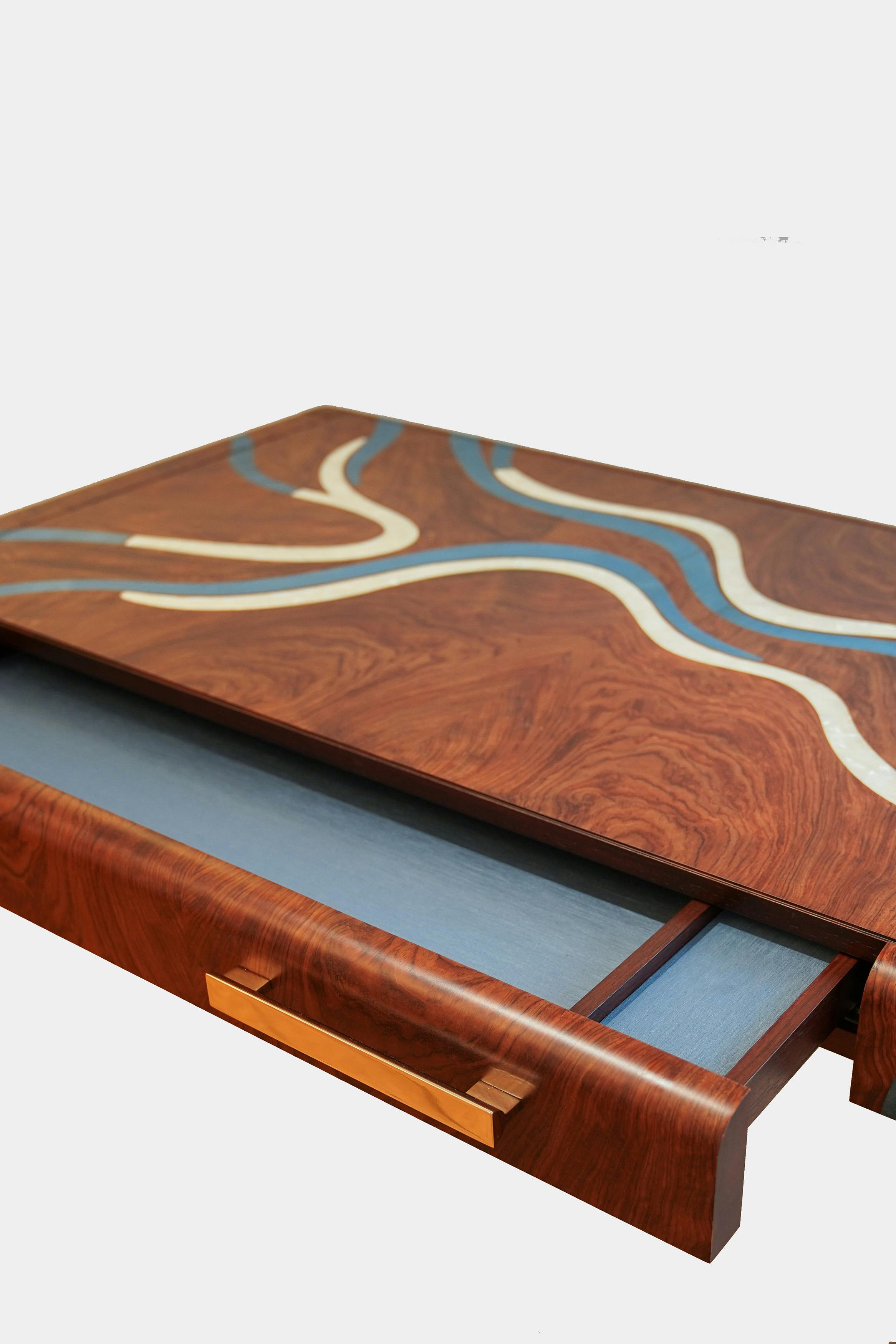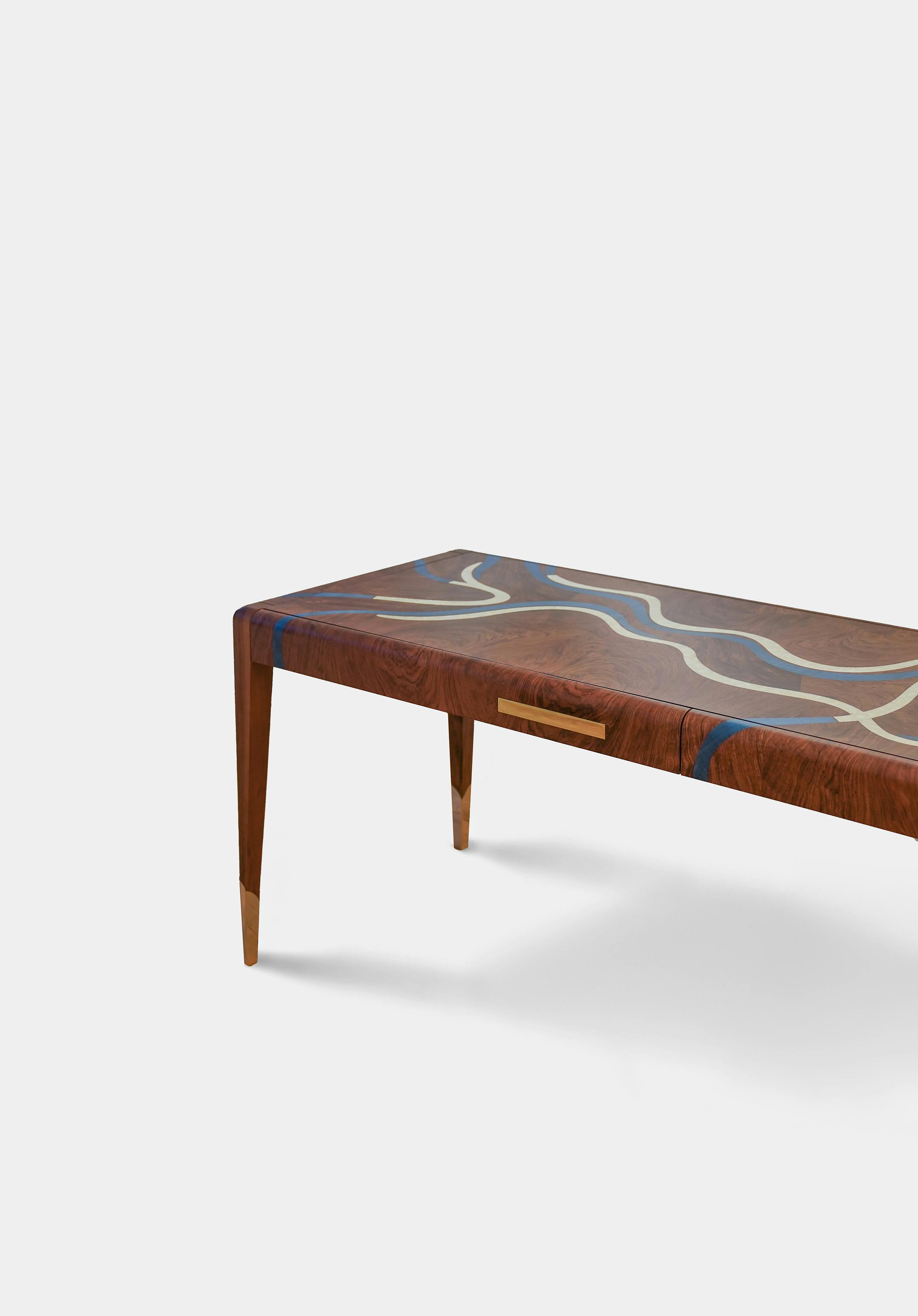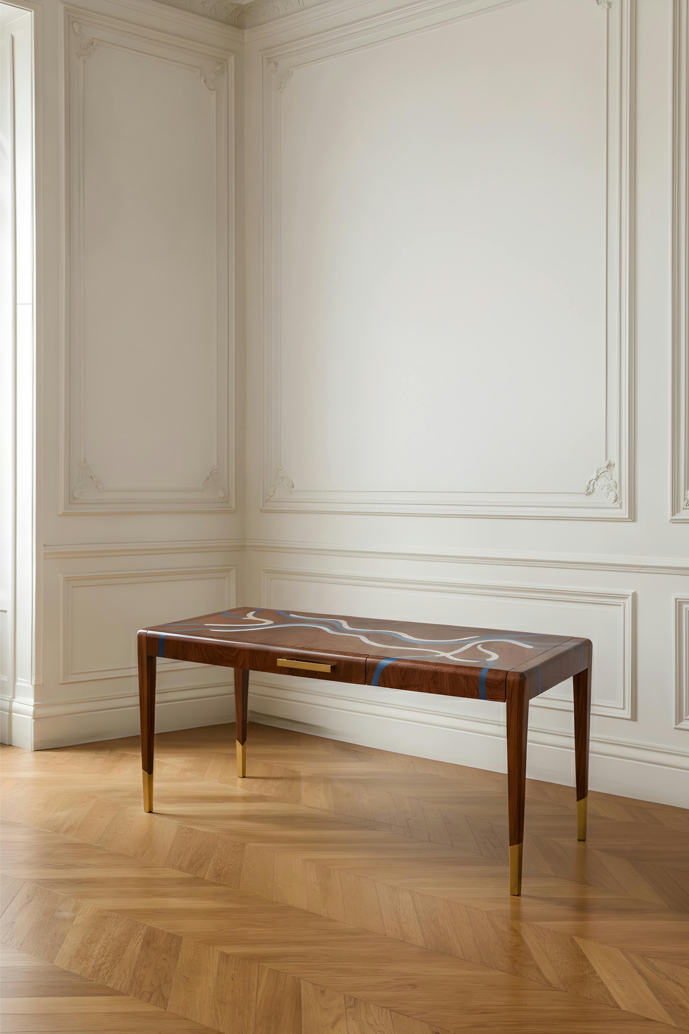 With its fluid lines and turquoise marquetry inlaid with mother-of-pearl, the Nereus desk extends the visual language of the collection. The patterns across the top follow the flow of an invisible current, forming a subtle relief that catches the light. Patinated in a moongold shade, the bronze details highlight the elegance of the structure. Both graphic and organic, this piece brings materials into dialogue, shaping a contemporary design inspired by the marine world.