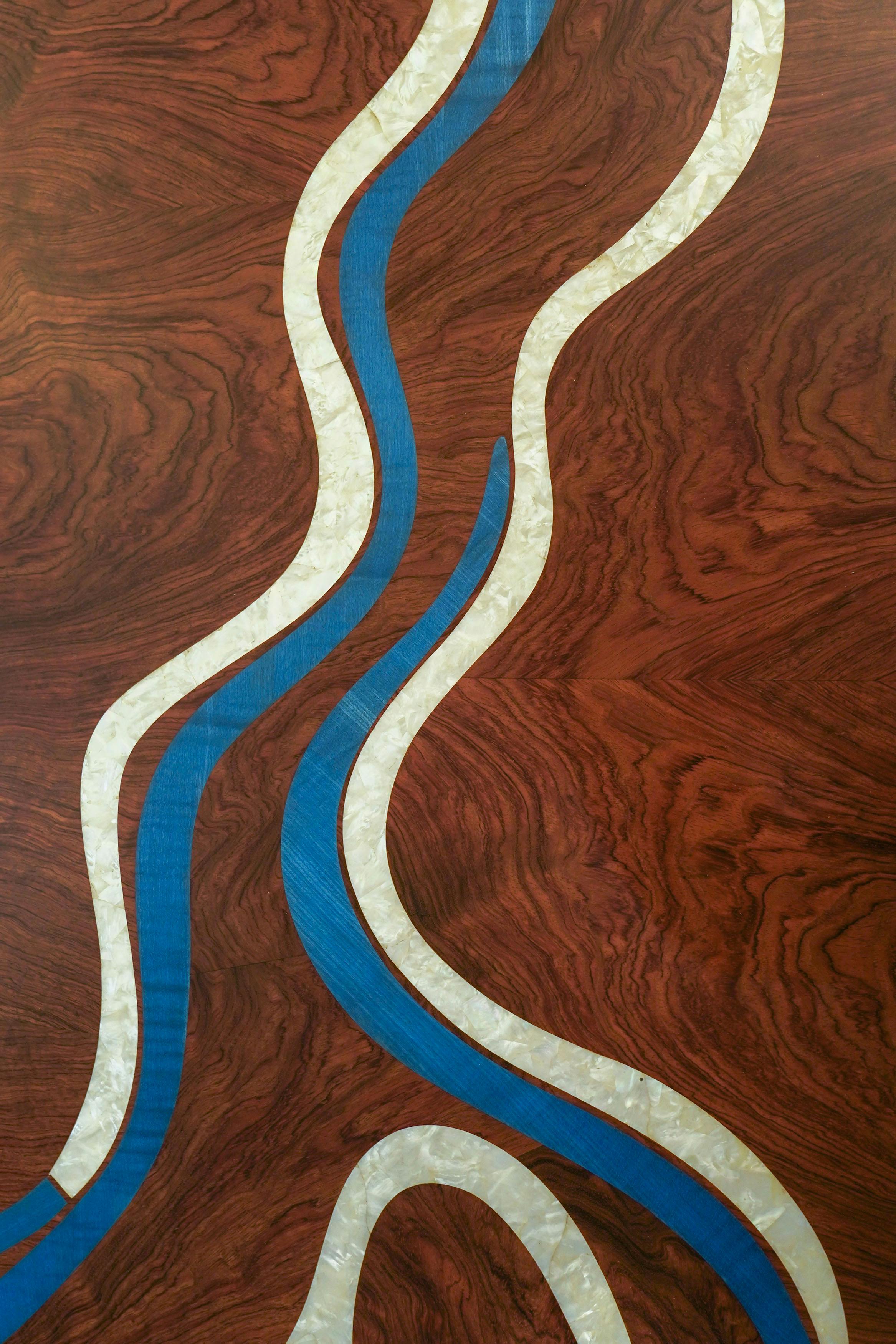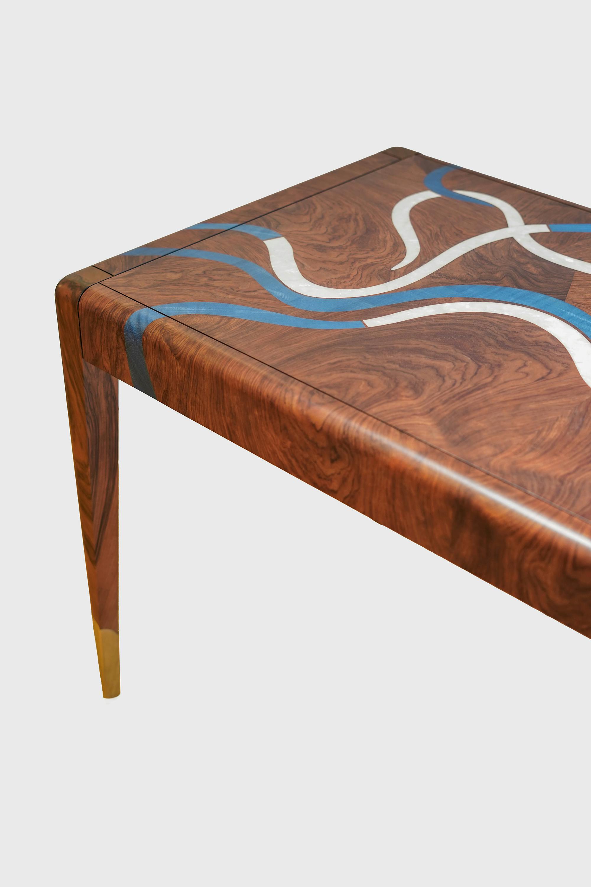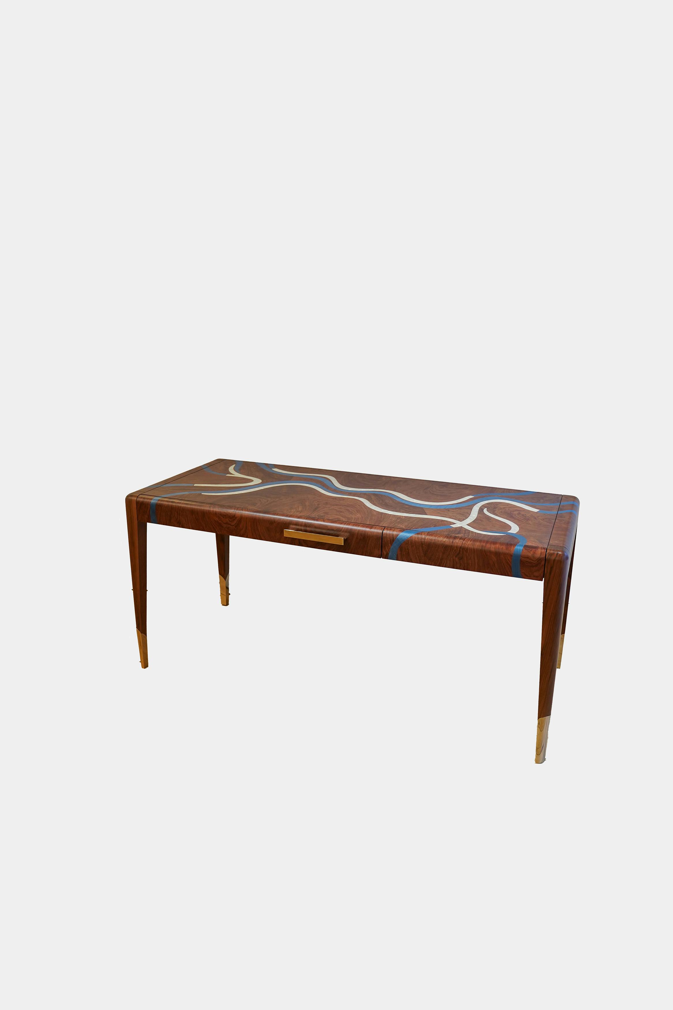 With its fluid lines and turquoise marquetry inlaid with mother-of-pearl, the Nereus desk extends the visual language of the collection. The patterns across the top follow the flow of an invisible current, forming a subtle relief that catches the light. Patinated in a moongold shade, the bronze details highlight the elegance of the structure. Both graphic and organic, this piece brings materials into dialogue, shaping a contemporary design inspired by the marine world.