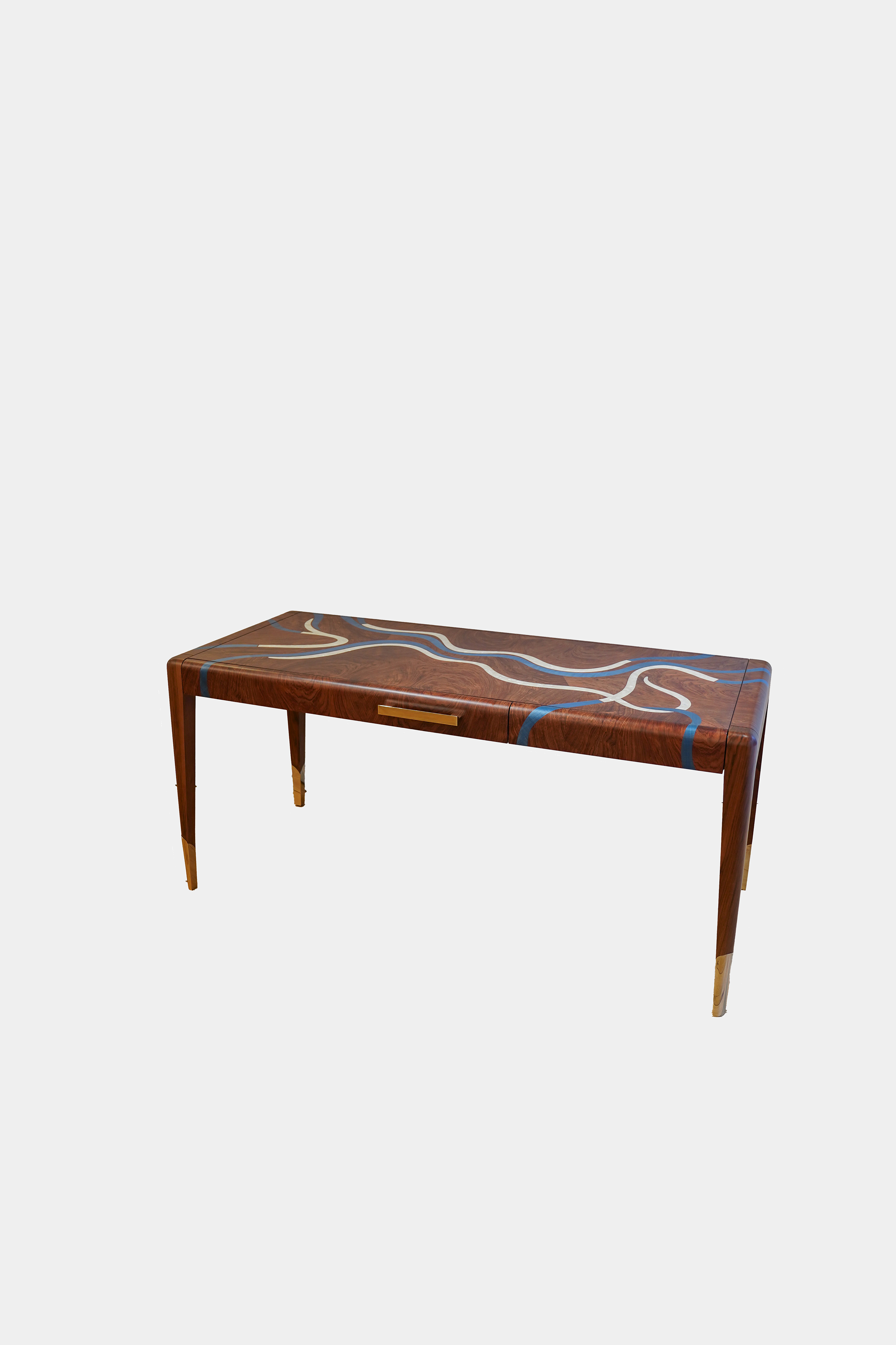 With its fluid lines and turquoise marquetry inlaid with mother-of-pearl, the Nereus desk extends the visual language of the collection. The patterns across the top follow the flow of an invisible current, forming a subtle relief that catches the light. Patinated in a moongold shade, the bronze details highlight the elegance of the structure. Both graphic and organic, this piece brings materials into dialogue, shaping a contemporary design inspired by the marine world.