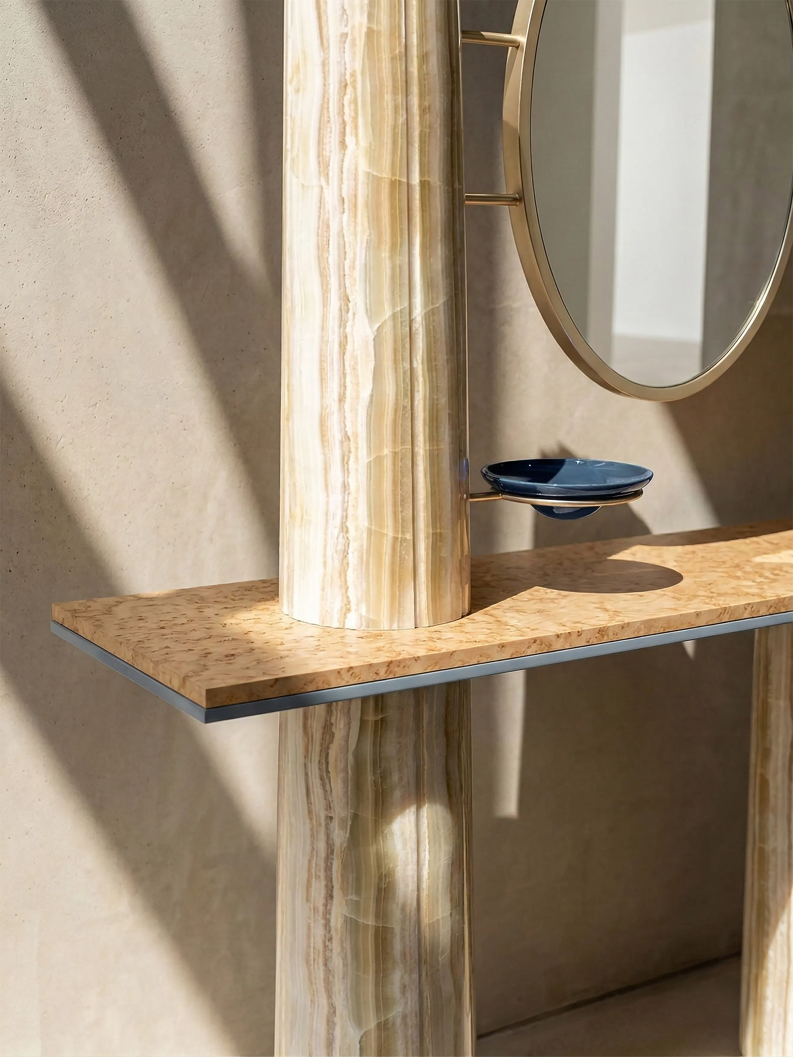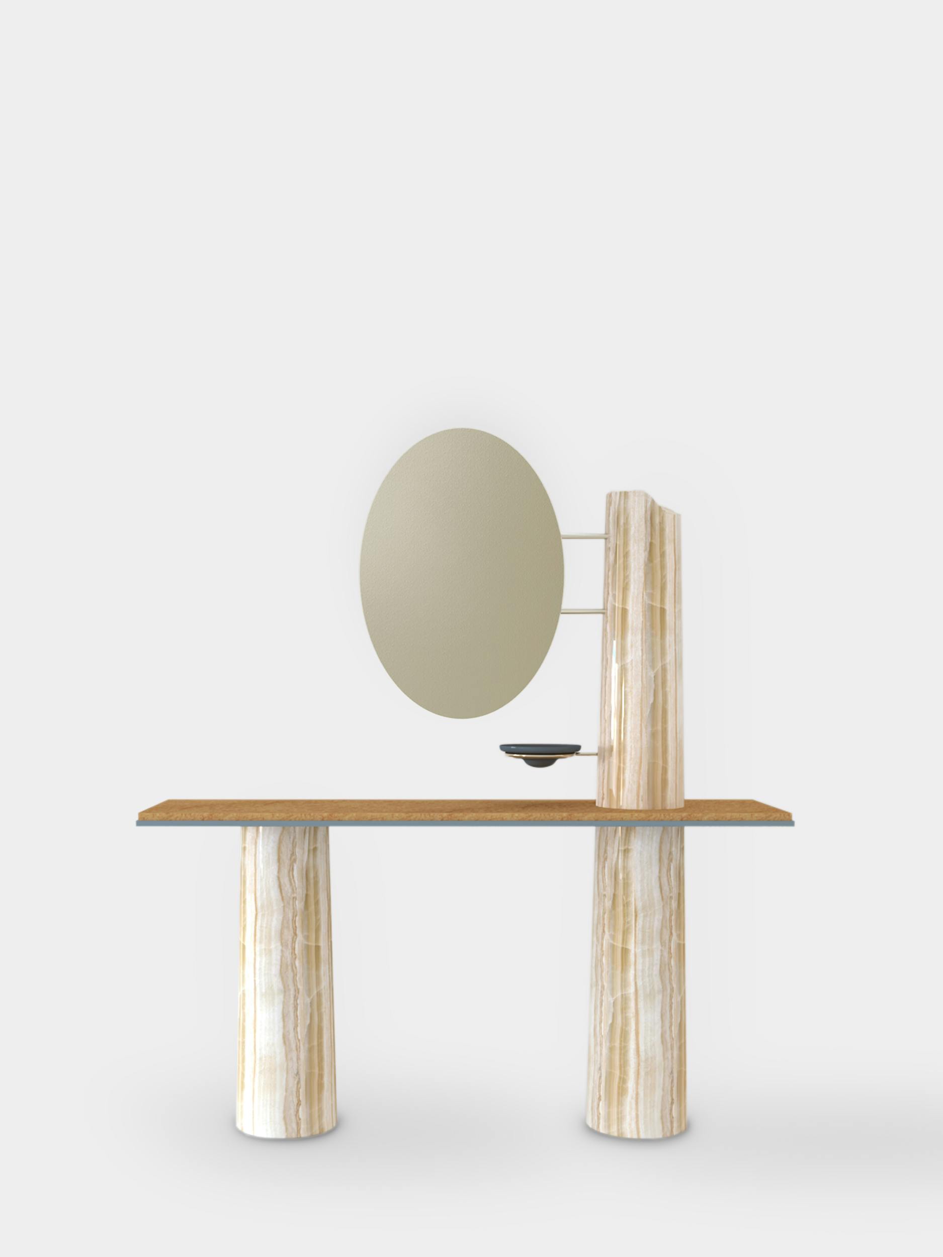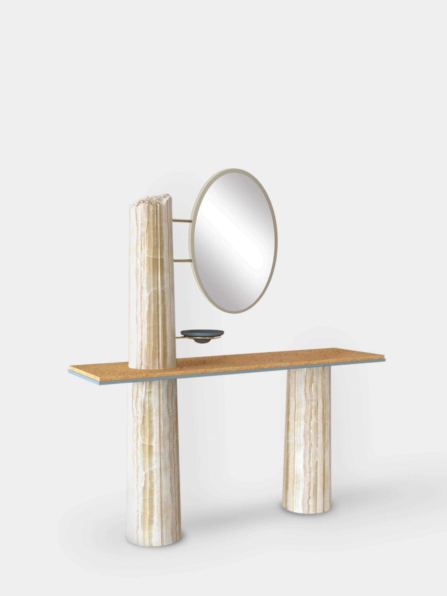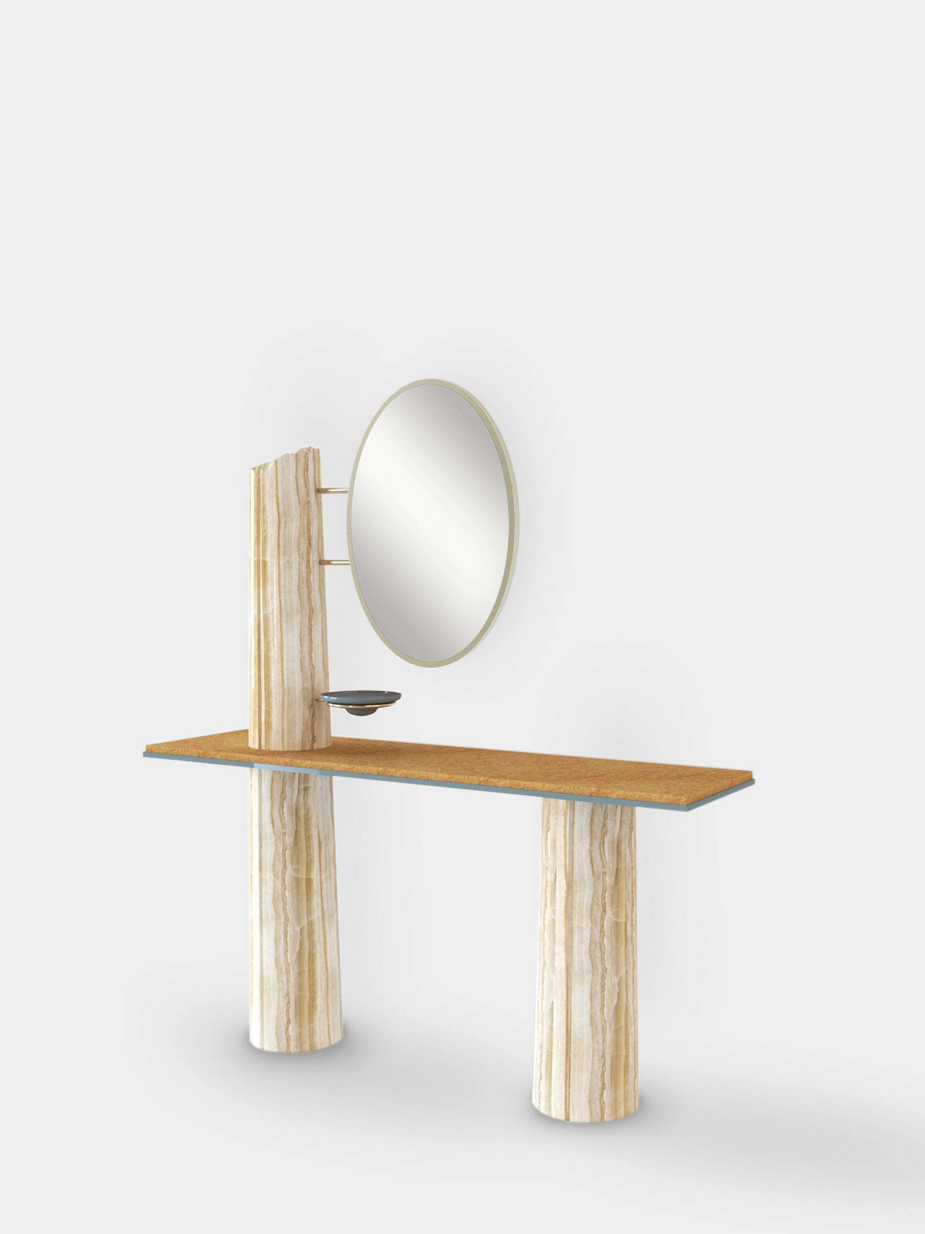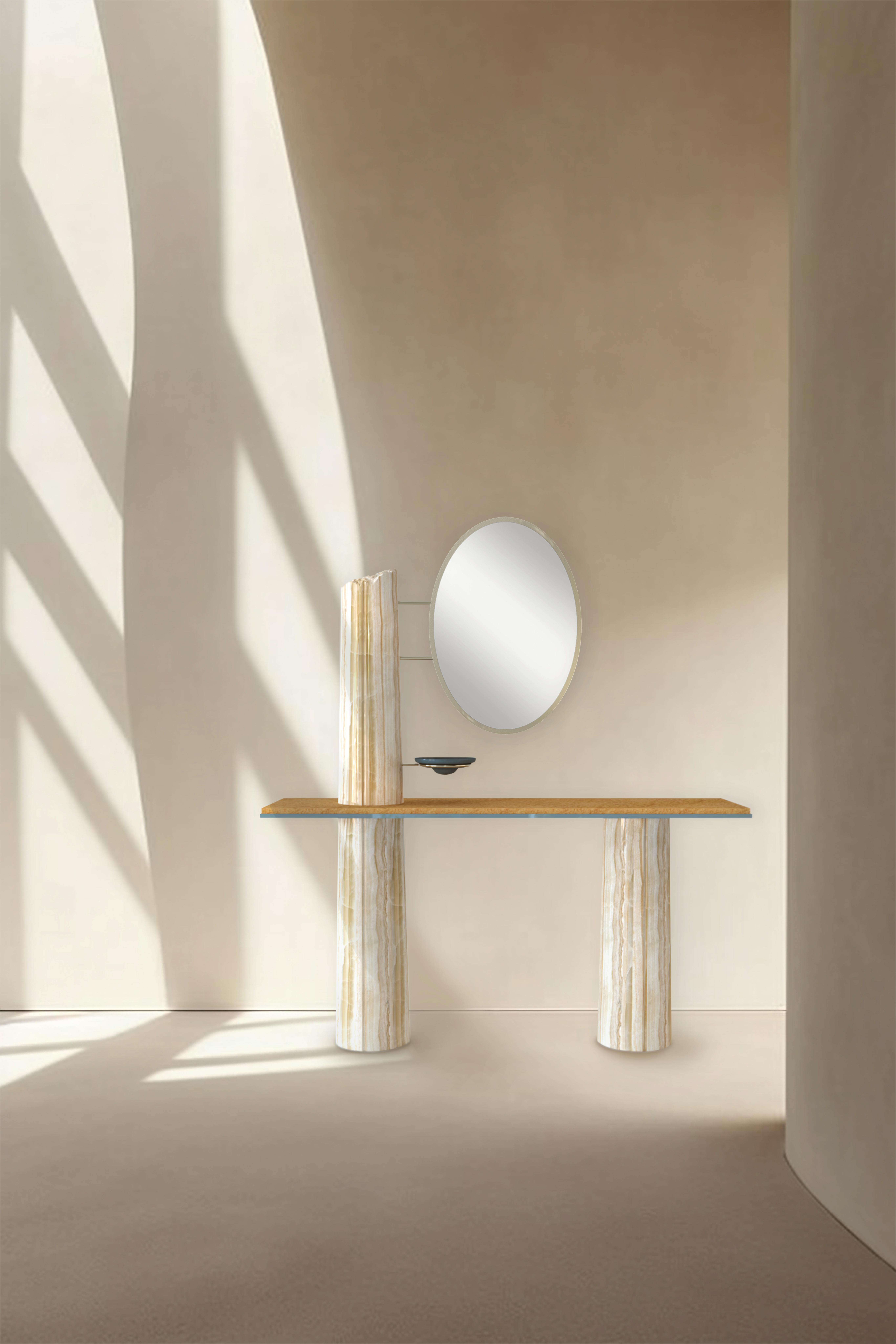 The Passage collection’s console table, as imagined by Rinck’s design experts, is an uncommon interpretation of the ravages of time as seen in a pair of antique-inspired columns that are made to appear aged and worn. With its two-tone tabletop in bird’s eye maple and colored lacquer, this piece serves a dual purpose, functioning as both furniture for everyday use, such as in a mudroom or bedroom, and a work of art in its own right.