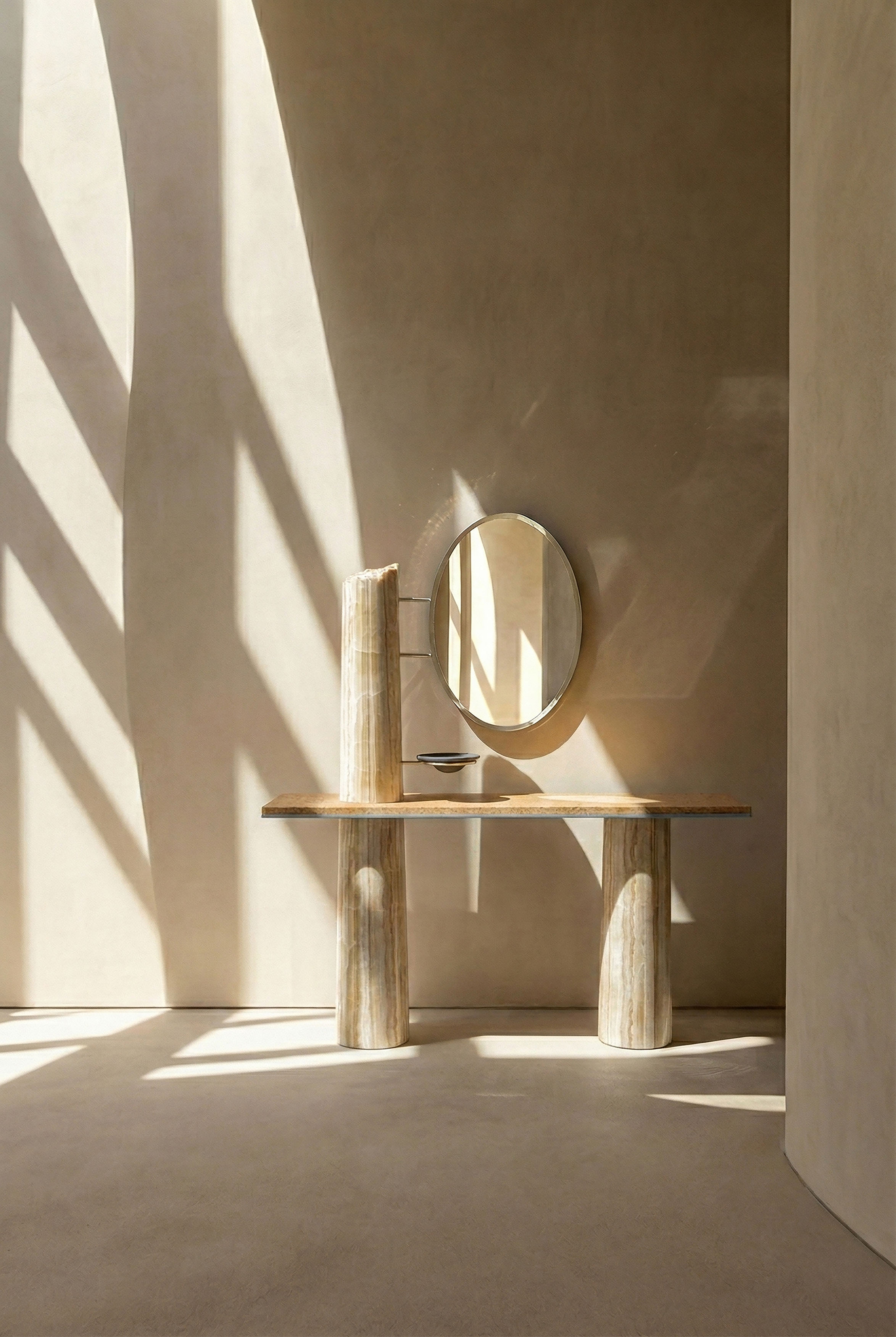 The Passage collection’s console table, as imagined by Rinck’s design experts, is an uncommon interpretation of the ravages of time as seen in a pair of antique-inspired columns that are made to appear aged and worn. With its two-tone tabletop in bird’s eye maple and colored lacquer, this piece serves a dual purpose, functioning as both furniture for everyday use, such as in a mudroom or bedroom, and a work of art in its own right.