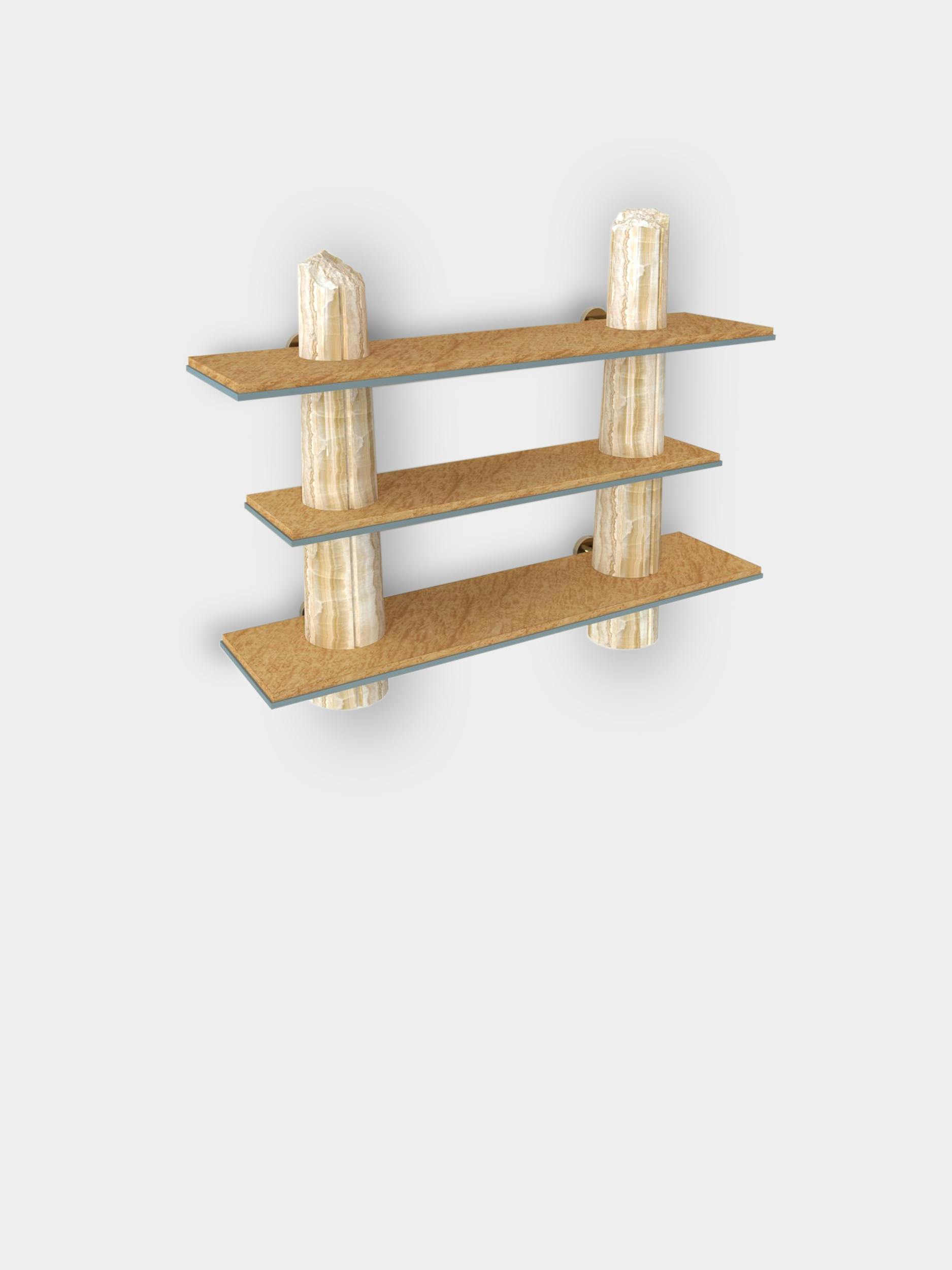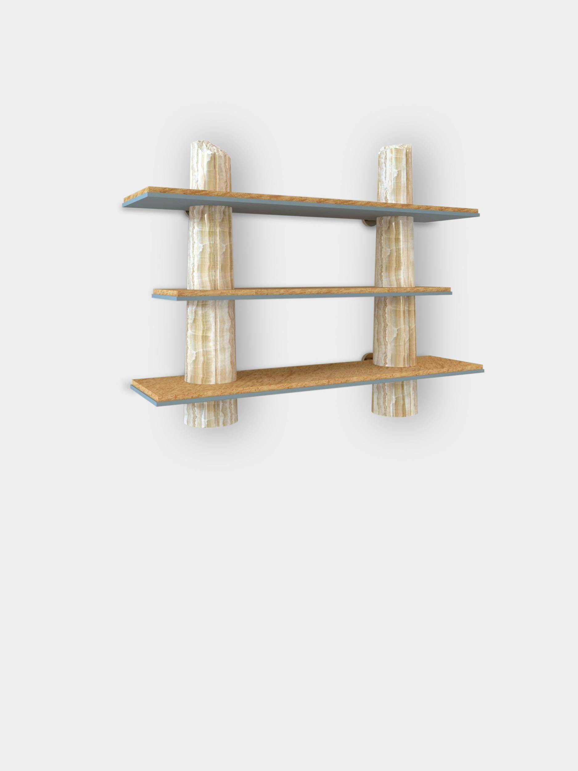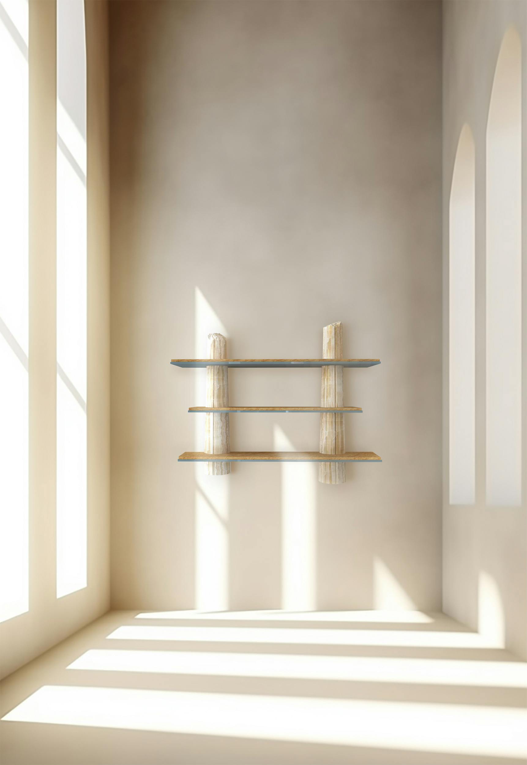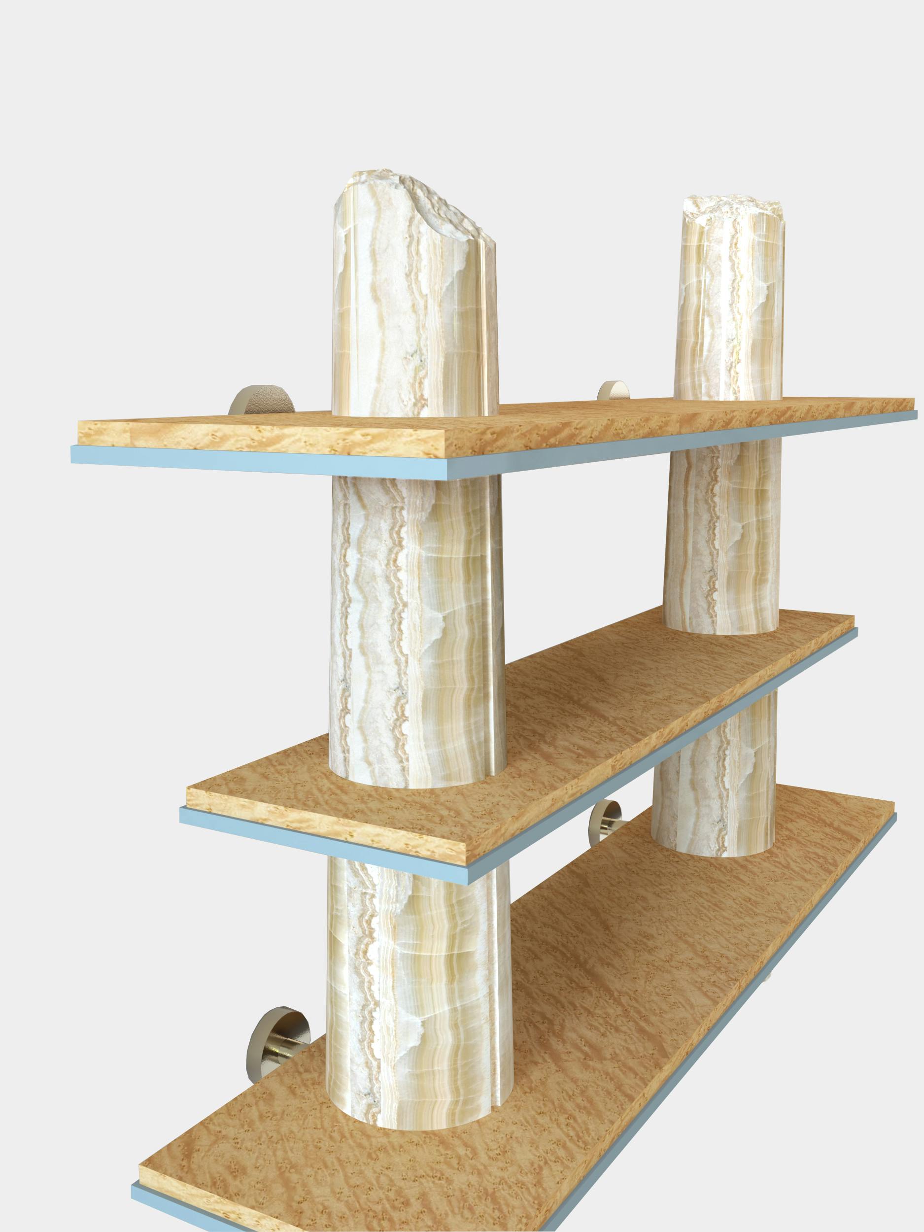 Though the shelves designed for the Passage collection were intended for home use, they also form a sculpture, featuring very precise, deliberate artistic work on the columns that makes them appear broken. This trompe l'oeil is rendered more convincing still by decorative painting that impeccably imitates onyx. A discreet commentary on the environmental footprint left by overconsumption of rare marbles in the décor world.