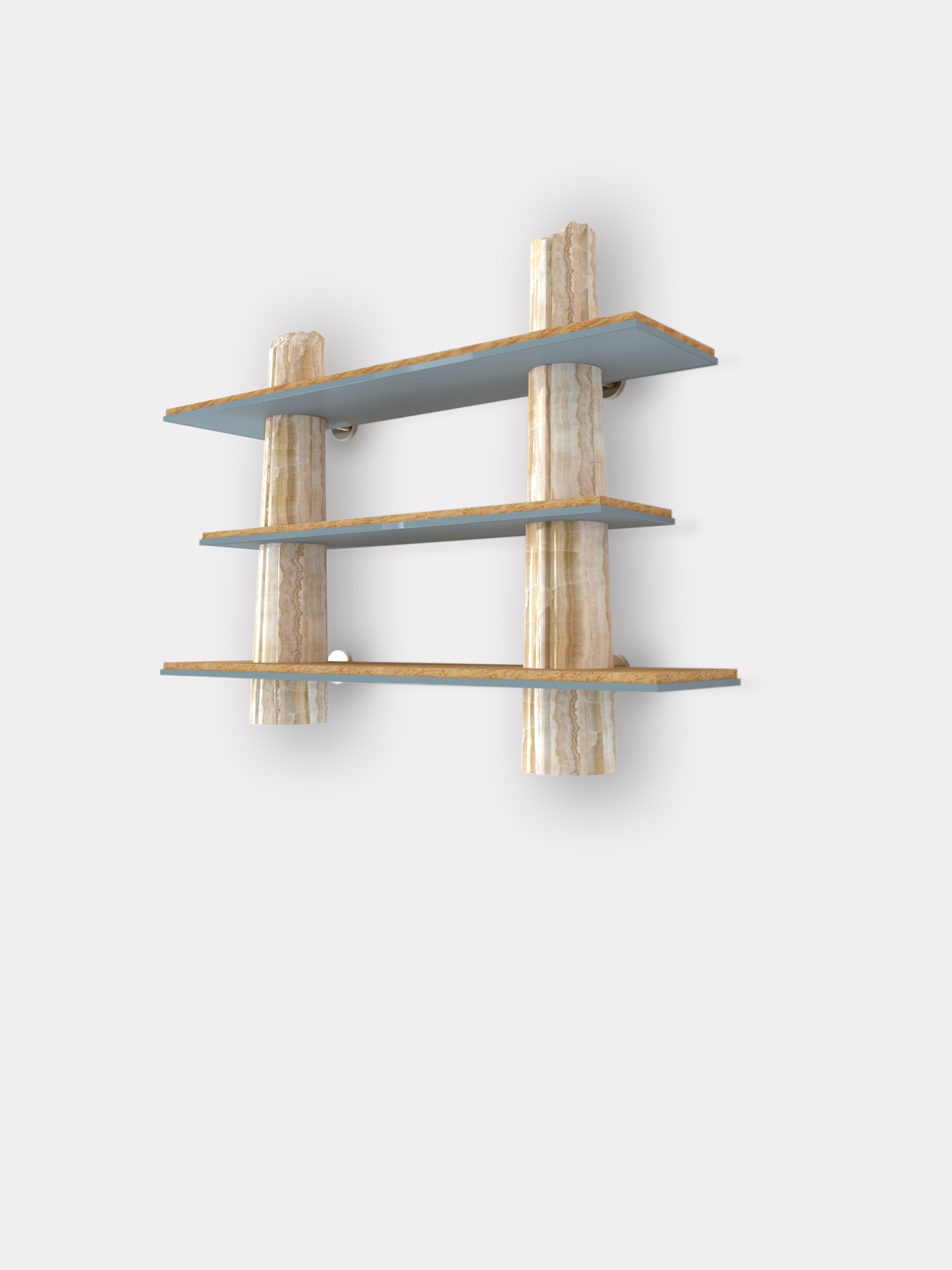 Though the shelves designed for the Passage collection were intended for home use, they also form a sculpture, featuring very precise, deliberate artistic work on the columns that makes them appear broken. This trompe l'oeil is rendered more convincing still by decorative painting that impeccably imitates onyx. A discreet commentary on the environmental footprint left by overconsumption of rare marbles in the décor world.