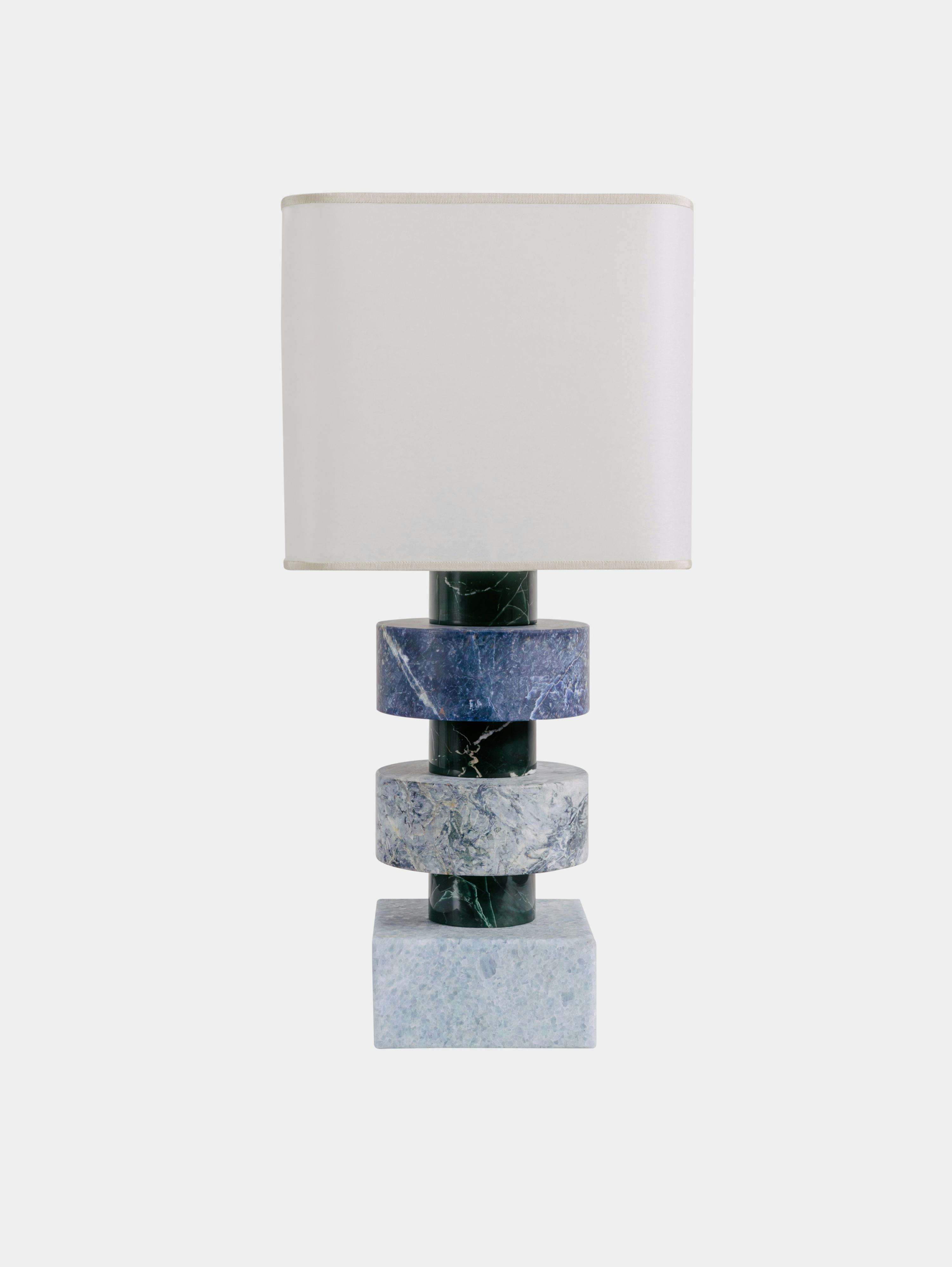 This table lamp strikes a delicate balance between pri-mitive nature and contemporary design, rising up from a stacked base of different-sized gemstones. Each stone is carefully chosen for its texture, unique shape, and co-lor, the whole forming a natural sculpture in harmonious contrast with the soft light glowing through the minima-list lampshade. This juxtaposition of rough and refined materials brings to mind the timeless beauty of the earth in a design that melds perfectly with contemporary interiors.