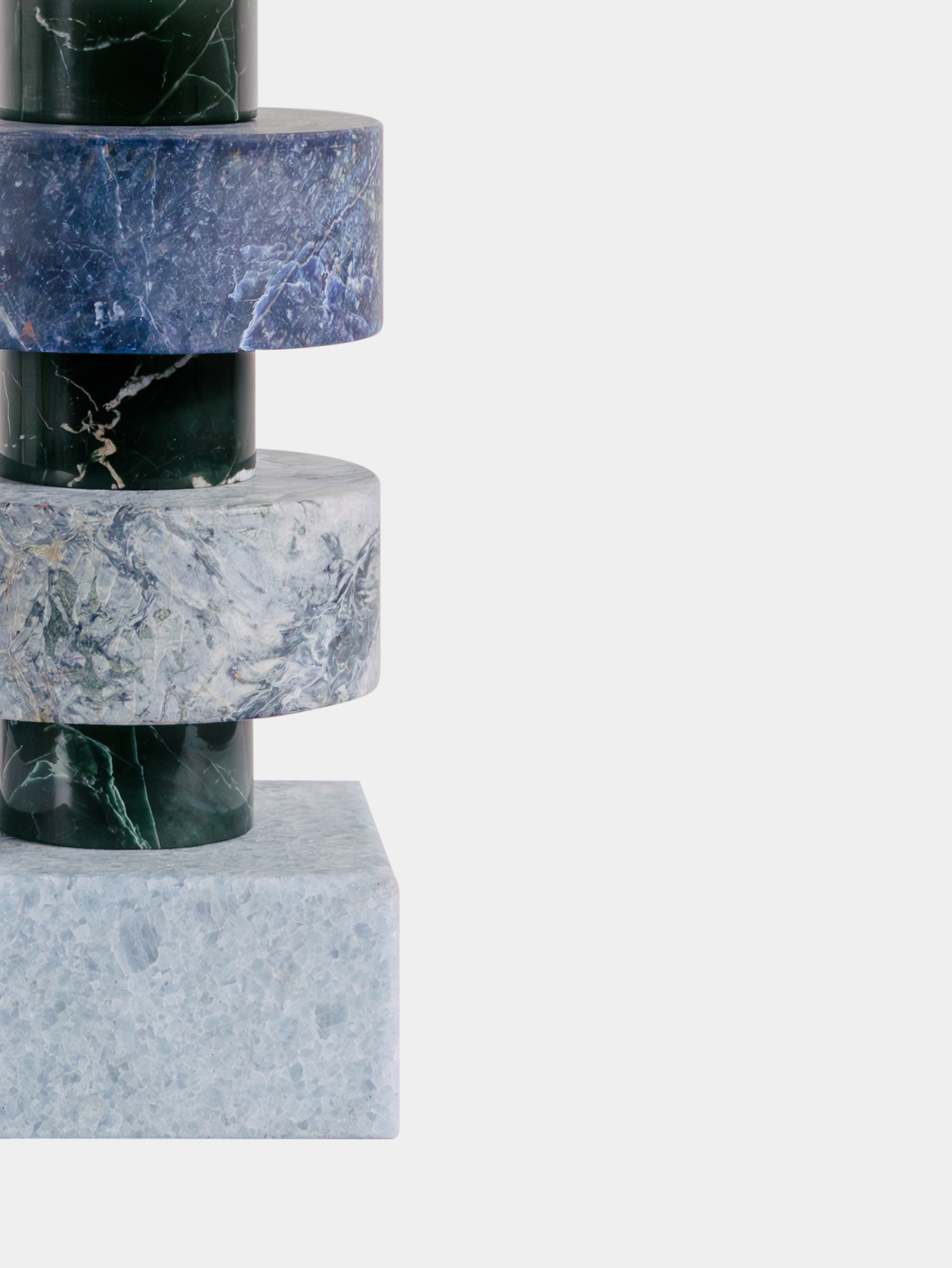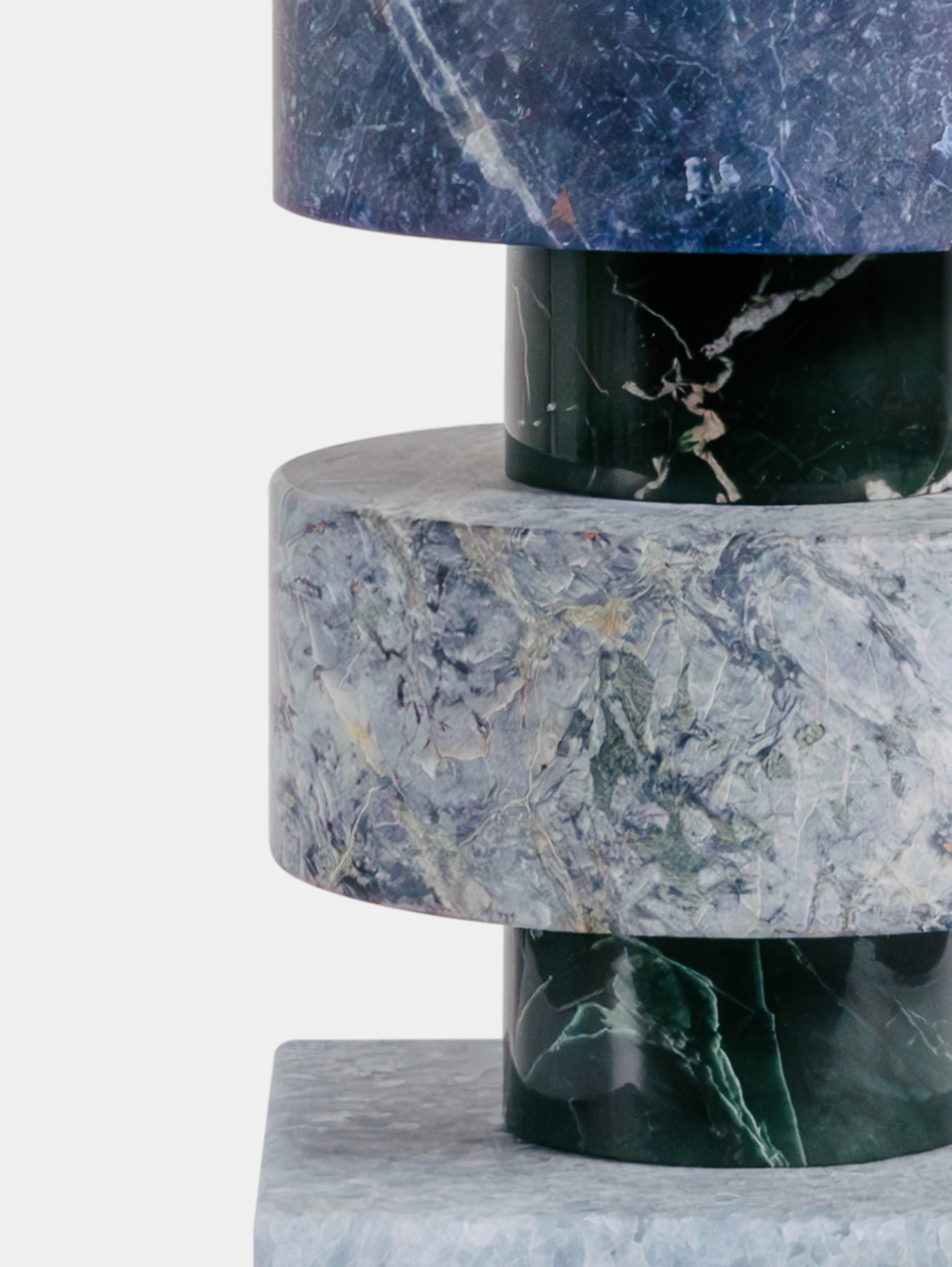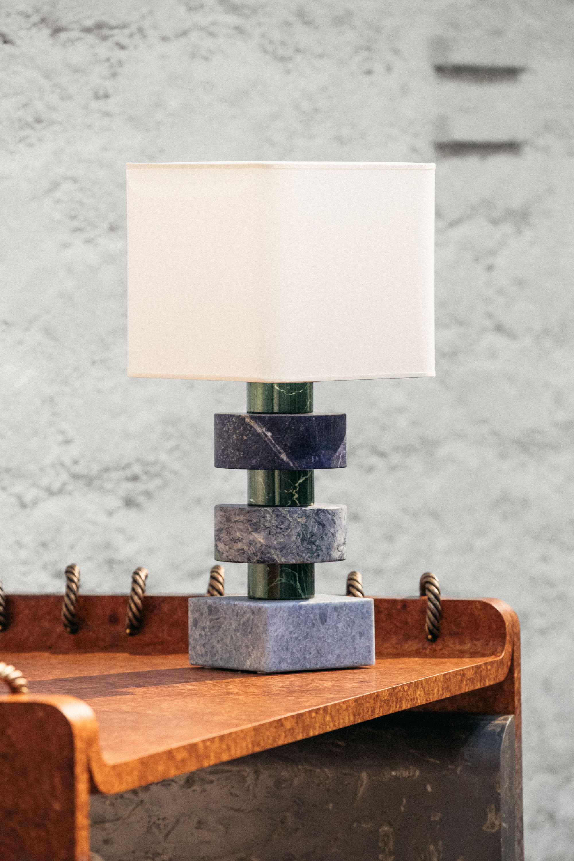 This table lamp strikes a delicate balance between pri-mitive nature and contemporary design, rising up from a stacked base of different-sized gemstones. Each stone is carefully chosen for its texture, unique shape, and co-lor, the whole forming a natural sculpture in harmonious contrast with the soft light glowing through the minima-list lampshade. This juxtaposition of rough and refined materials brings to mind the timeless beauty of the earth in a design that melds perfectly with contemporary interiors.