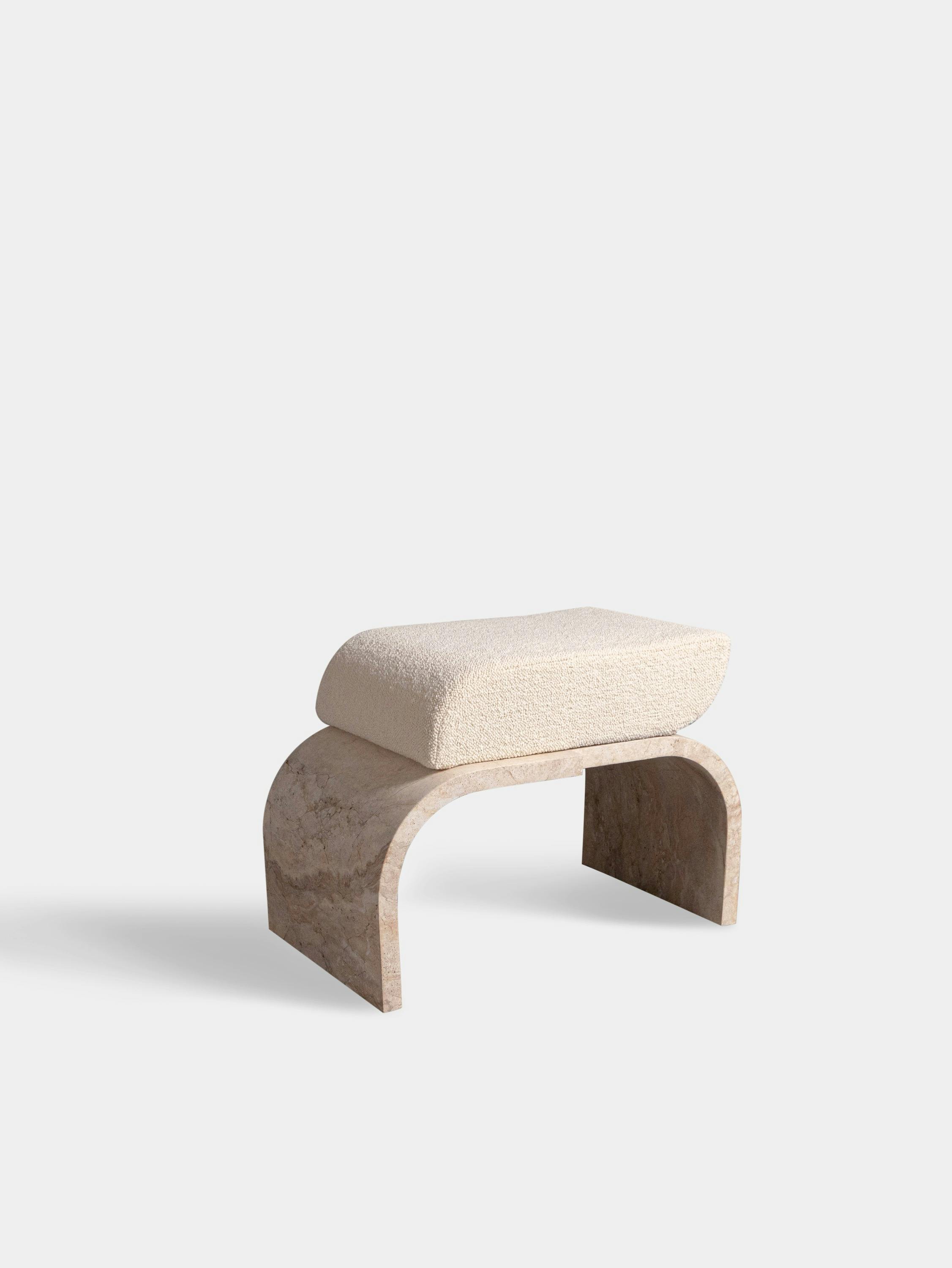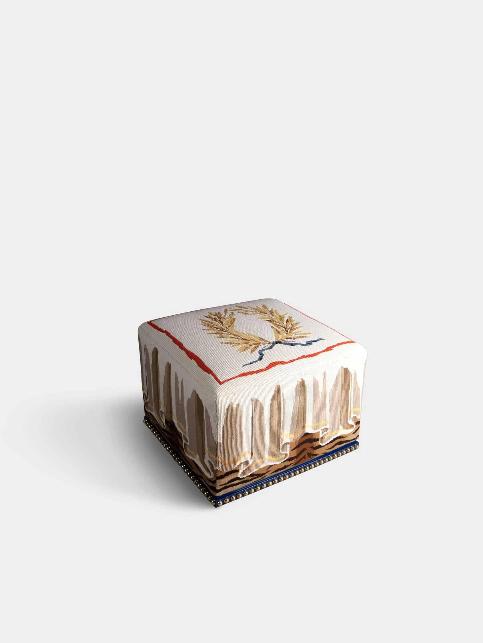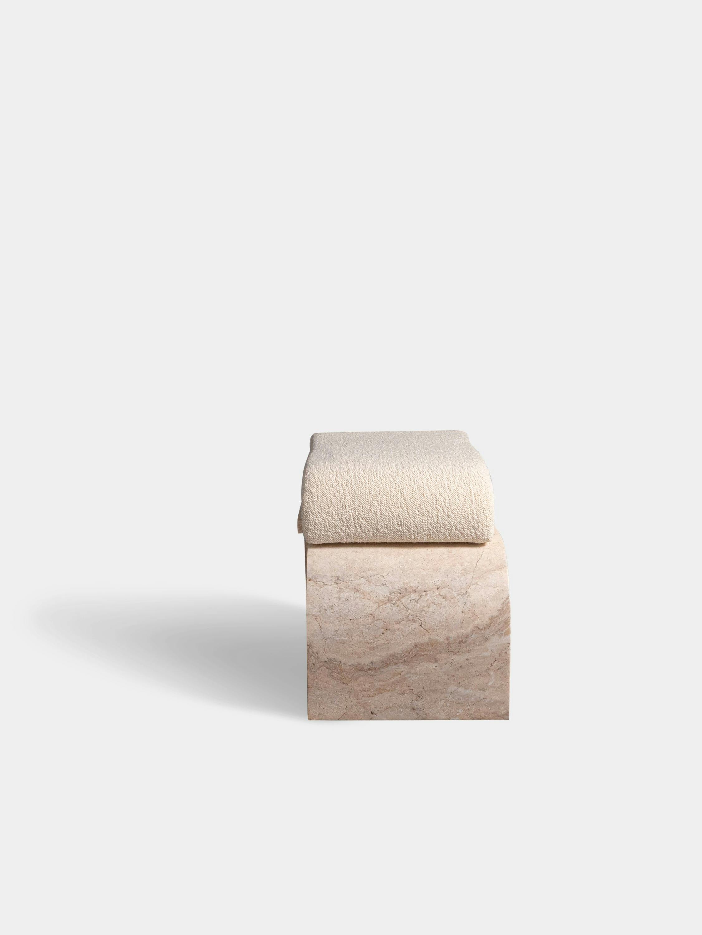 A work of curves and rounded lines, the ottoman of the Amarante collection invites you to relax and daydream. While the base resembles the Perlato d’Olympe marble chosen for the Amarante collection’s desk, it is, in fact, a «trompe l’oeil» hand painted on wood, so the piece can be easily lifted and moved about the room. The thick cushioning ensures tremendous comfort, whether used as a convenient seat or as a footrest for stretching out your legs. It is upholstered in Eveil fabric from Rinck’s first textile collection.