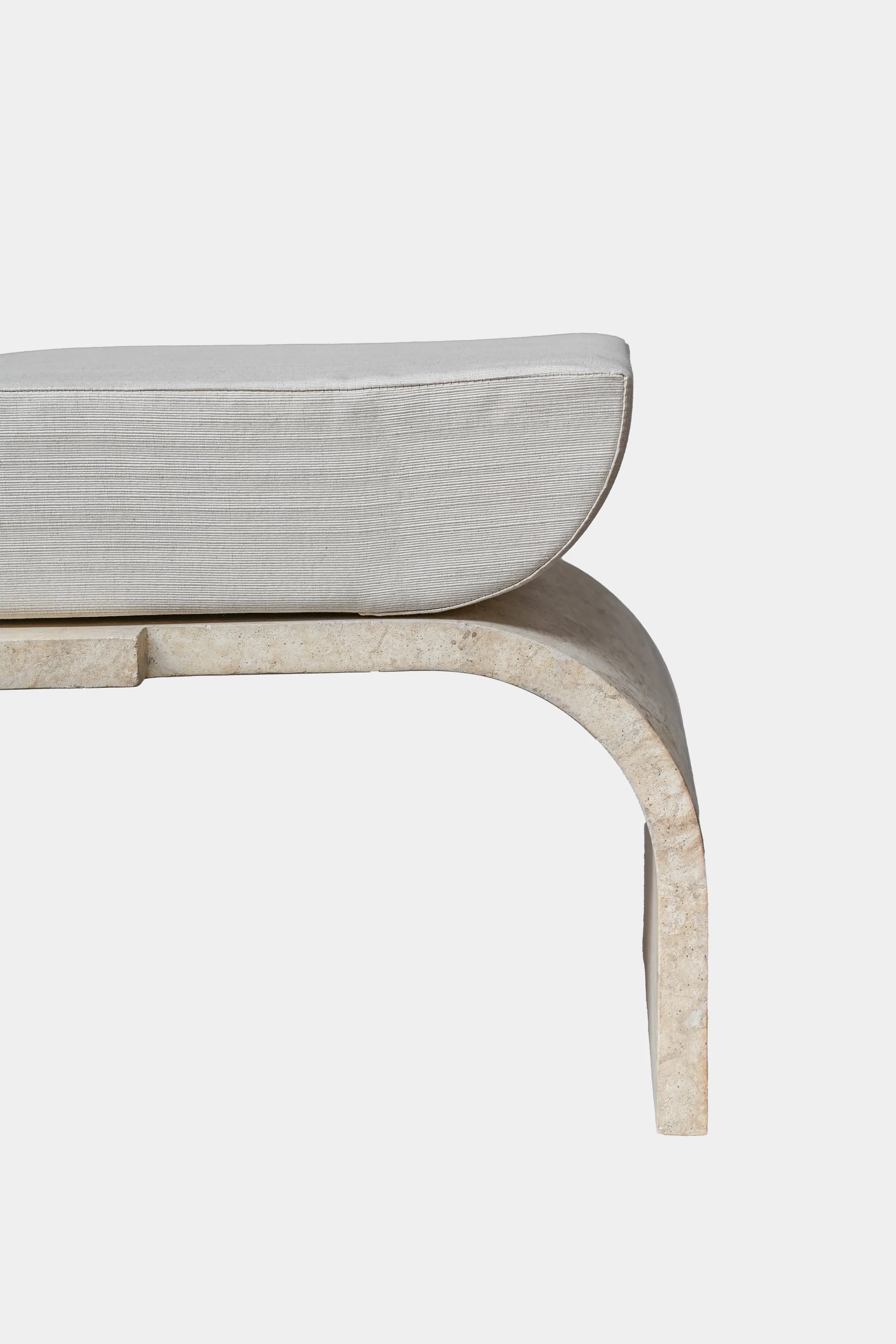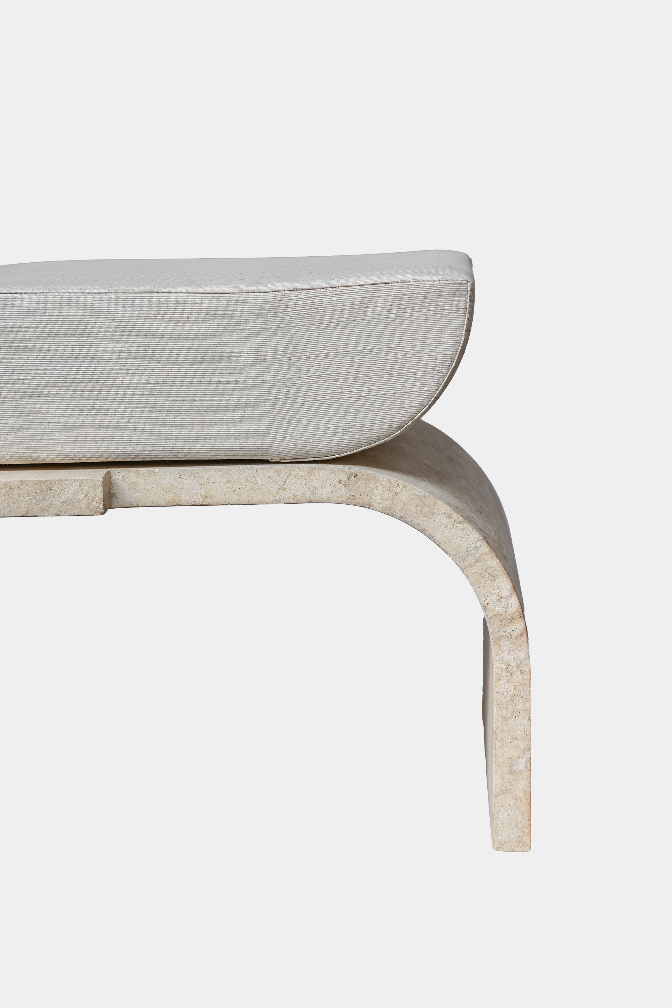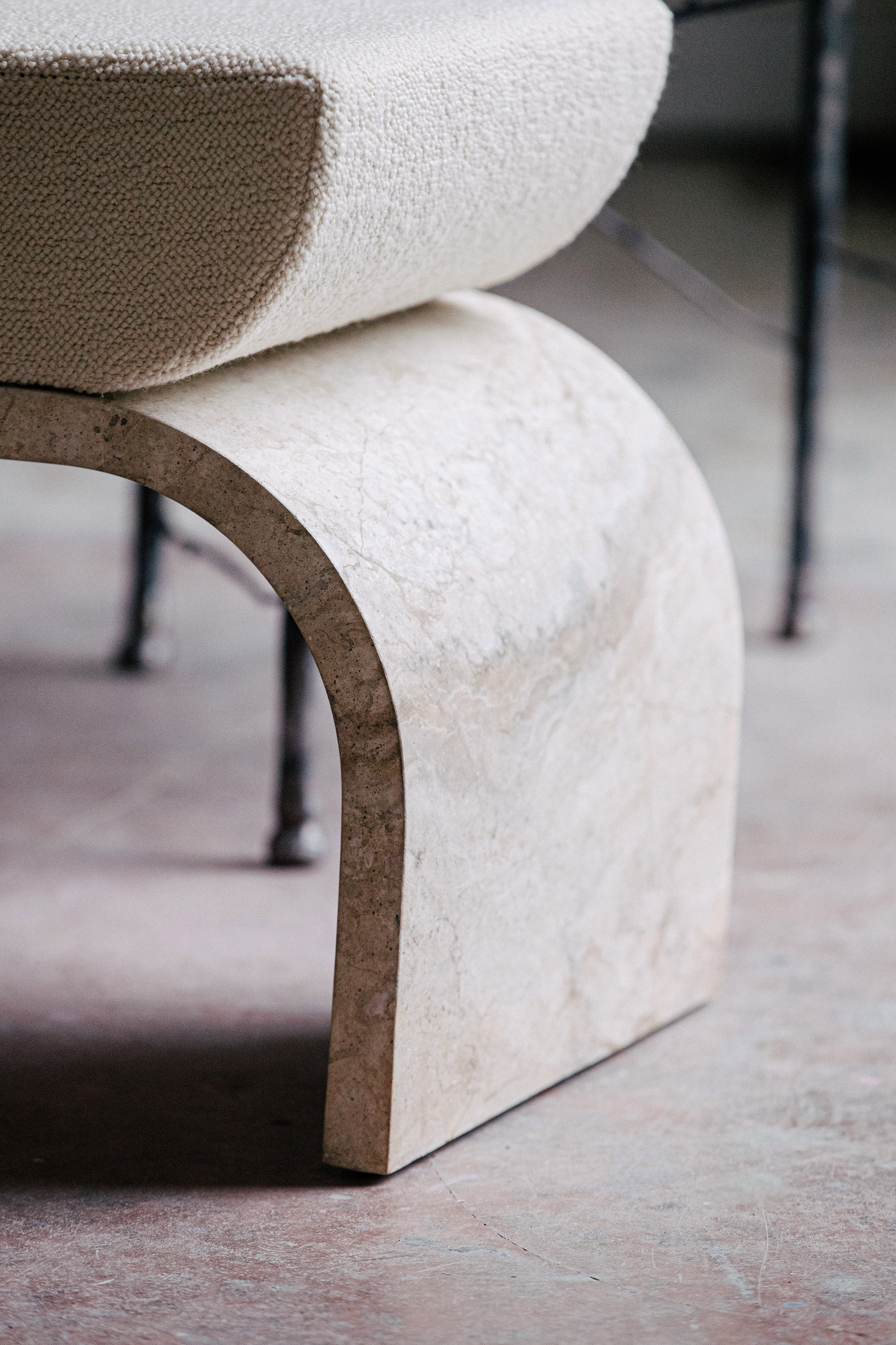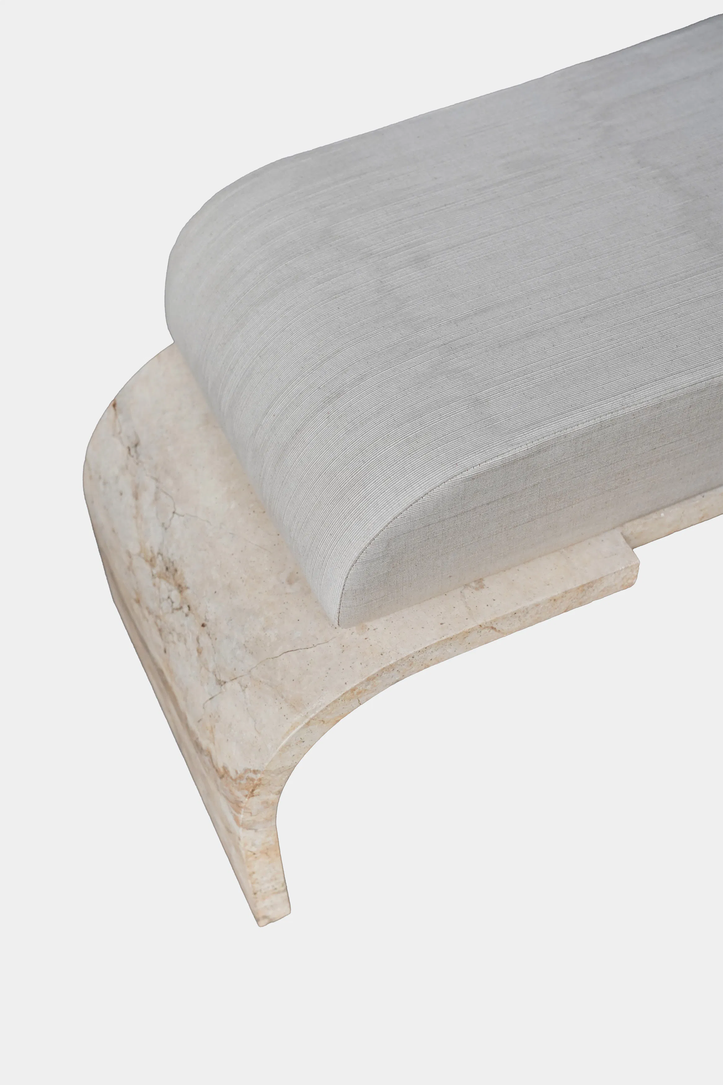 A work of curves and rounded lines, the ottoman of the Amarante collection invites you to relax and daydream. While the base resembles the Perlato d’Olympe marble chosen for the Amarante collection’s desk, it is, in fact, a «trompe l’oeil» hand painted on wood, so the piece can be easily lifted and moved about the room. The thick cushioning ensures tremendous comfort, whether used as a convenient seat or as a footrest for stretching out your legs. It is upholstered in Eveil fabric from Rinck’s first textile collection.