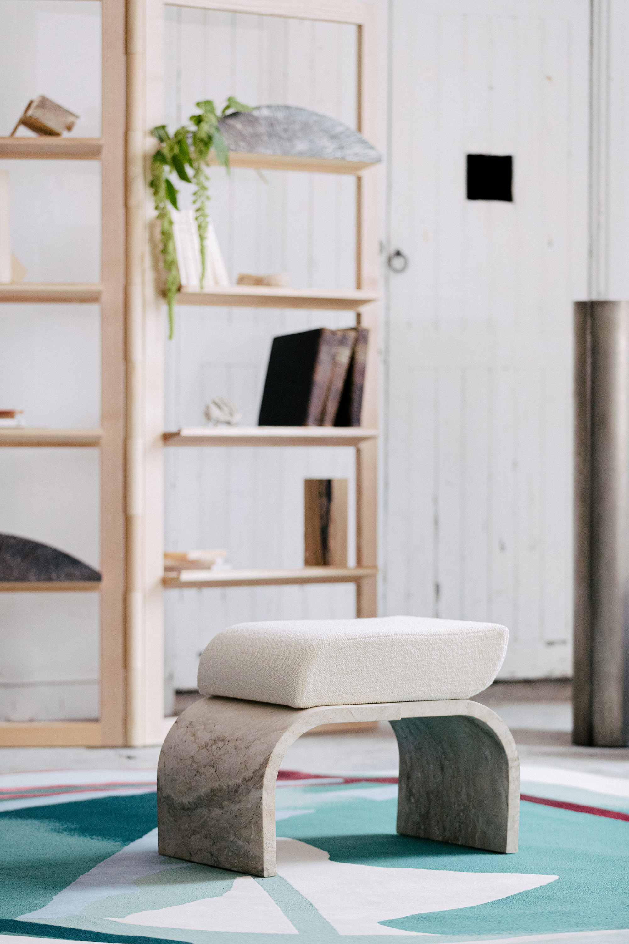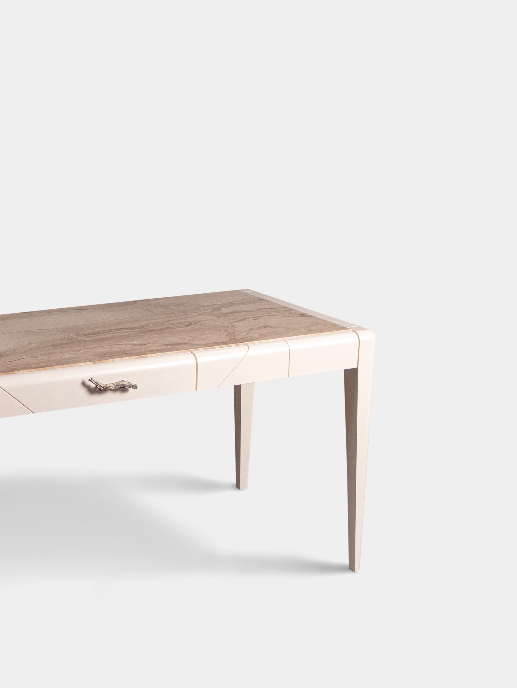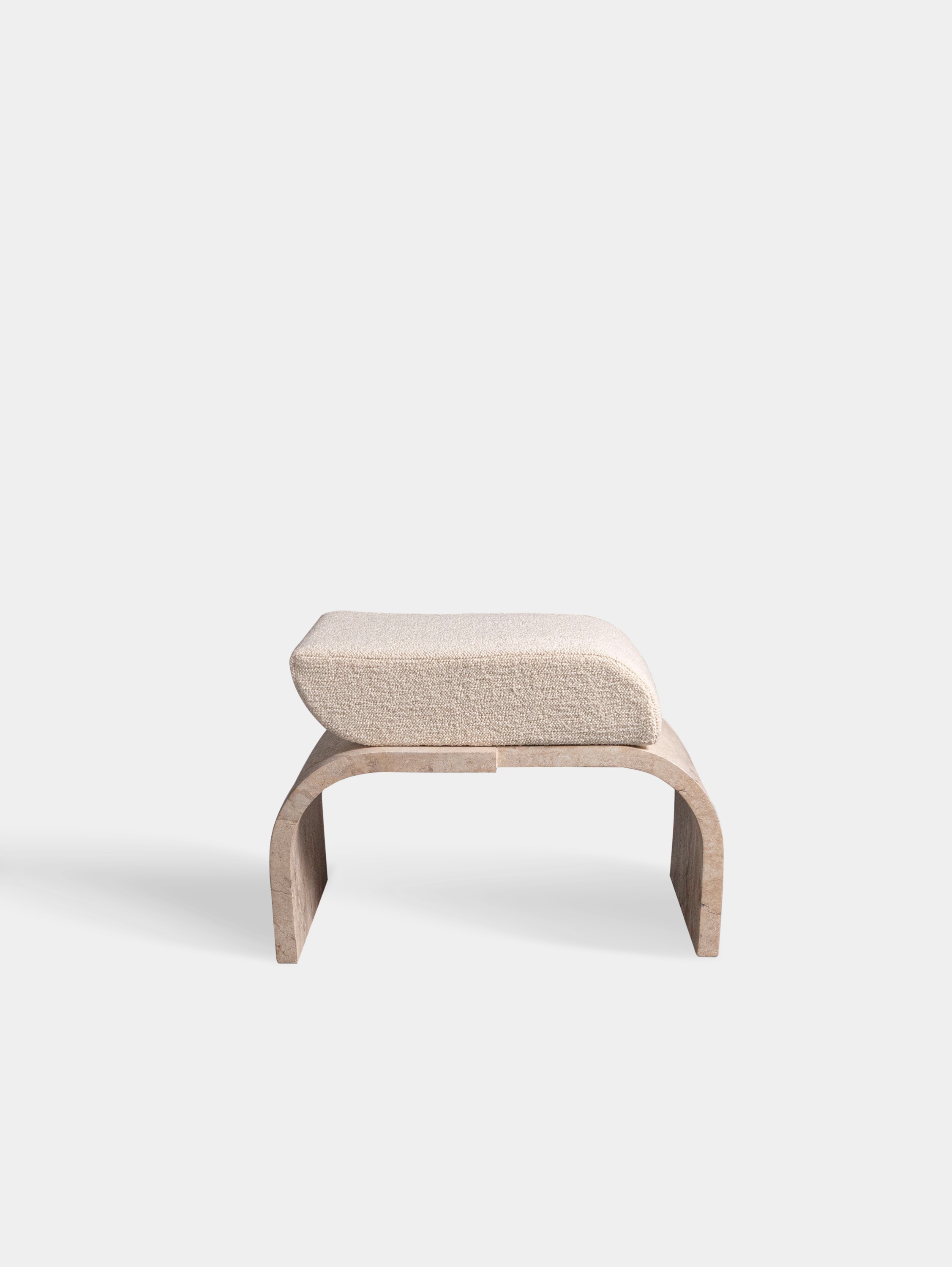 A work of curves and rounded lines, the ottoman of the Amarante collection invites you to relax and daydream. While the base resembles the Perlato d’Olympe marble chosen for the Amarante collection’s desk, it is, in fact, a «trompe l’oeil» hand painted on wood, so the piece can be easily lifted and moved about the room. The thick cushioning ensures tremendous comfort, whether used as a convenient seat or as a footrest for stretching out your legs. It is upholstered in Eveil fabric from Rinck’s first textile collection.