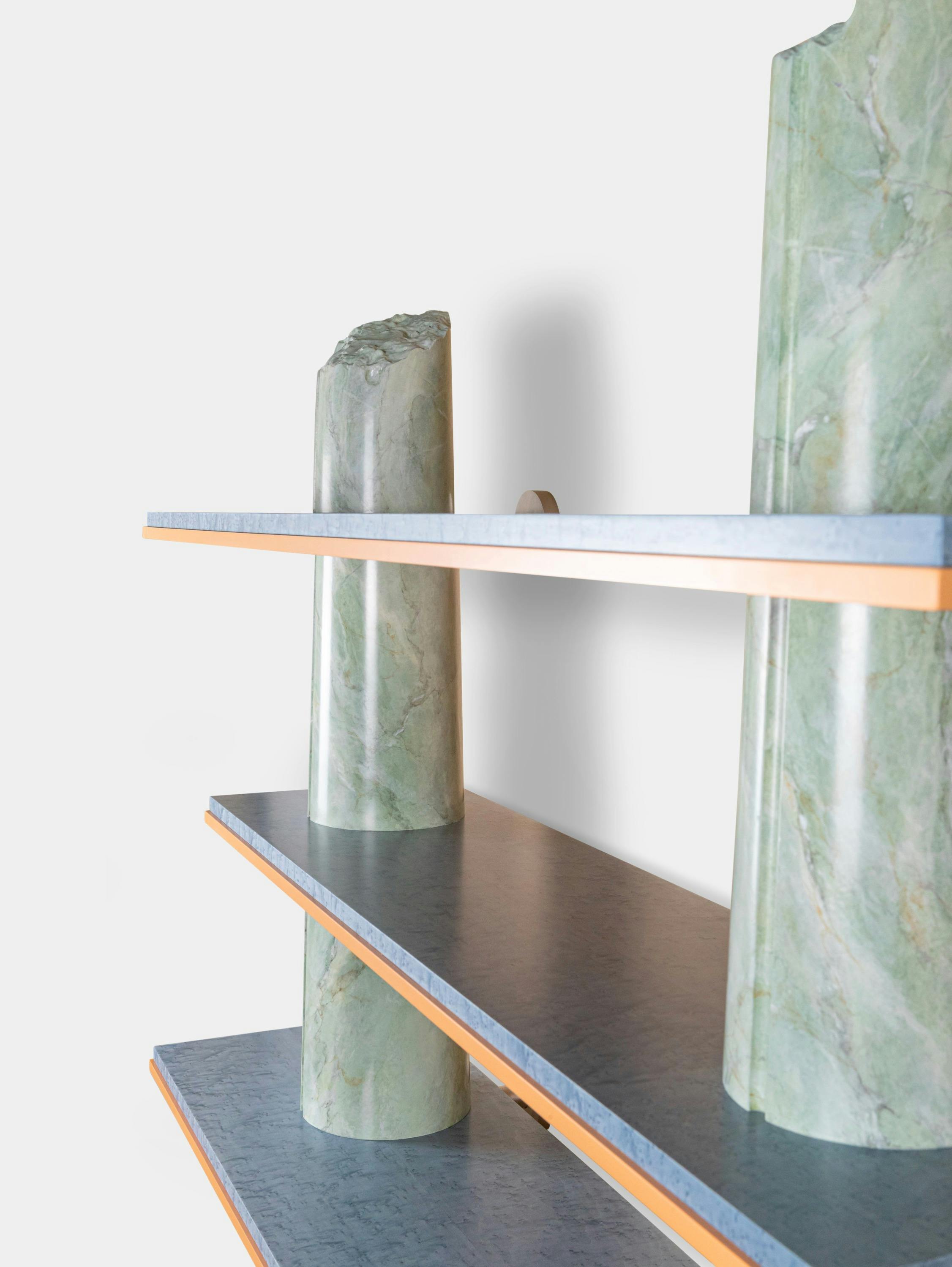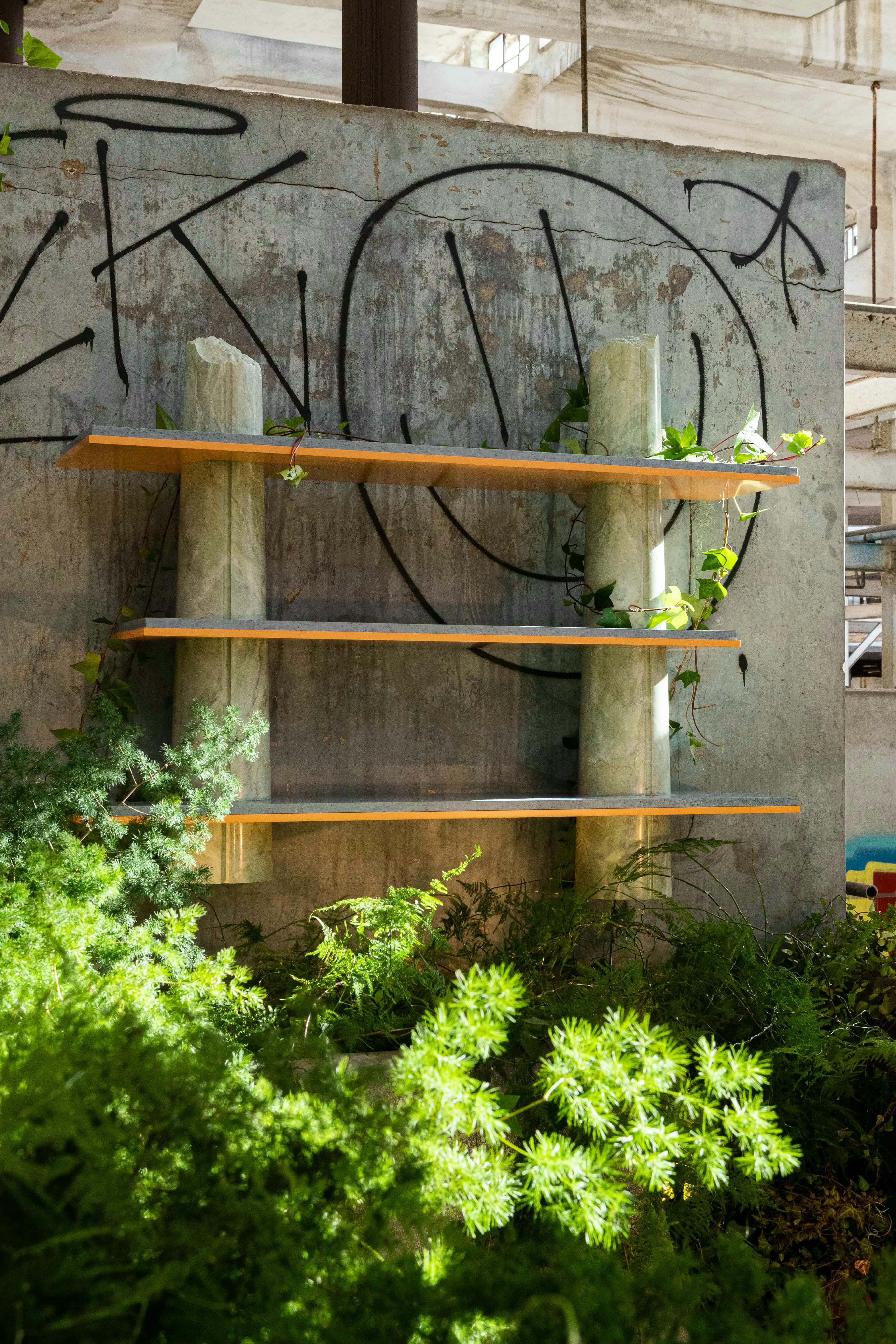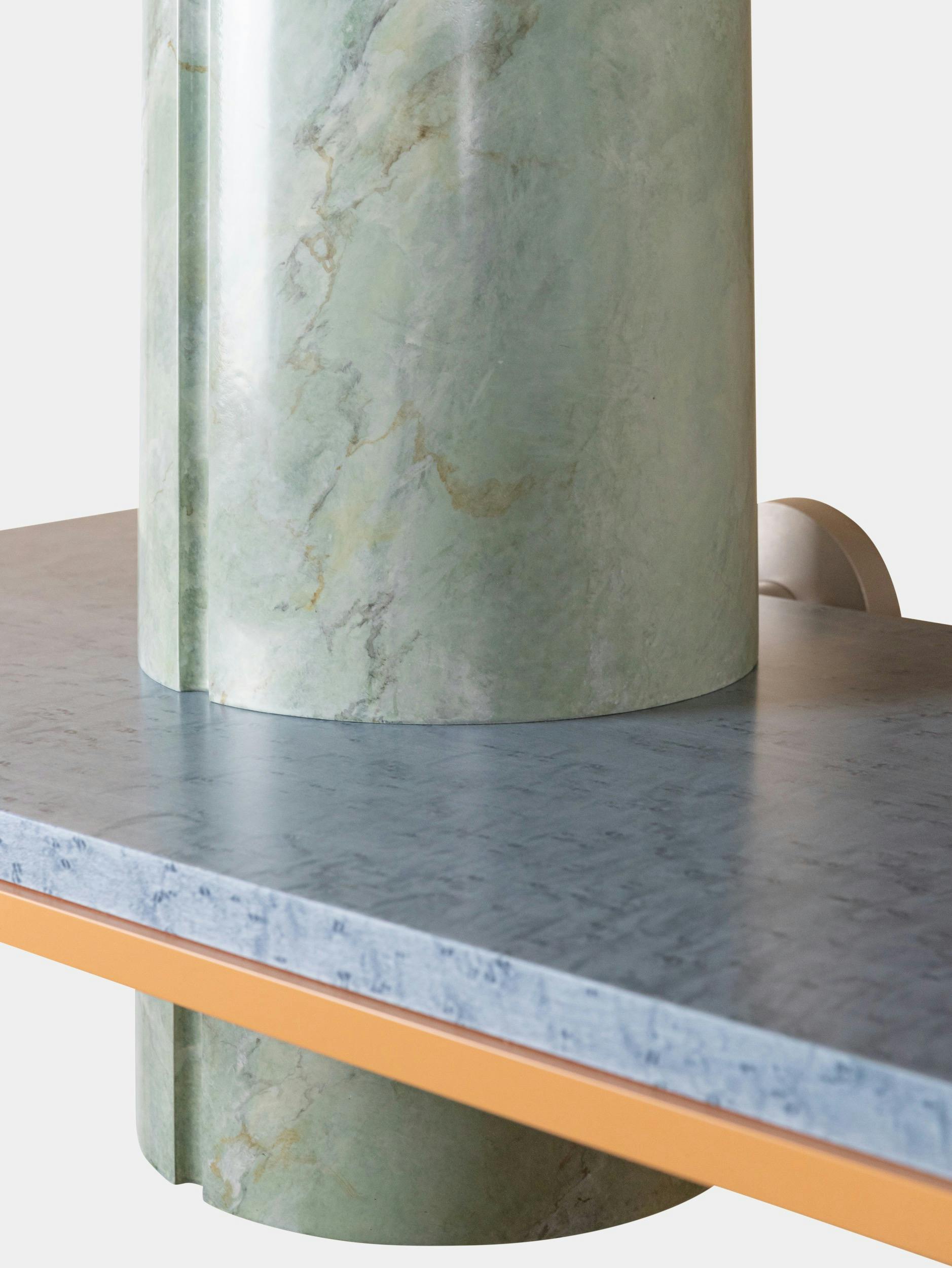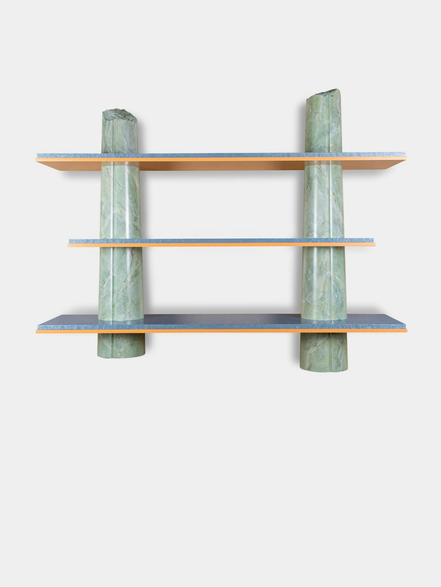 Though the shelves designed for the Passage collection were intended for home use, they also form a sculpture, featuring very precise, deliberate artistic work on the columns that makes them appear broken. This trompe l'oeil is rendered more convincing still by decorative painting that impeccably imitates onyx. A discreet commentary on the environmental footprint left by overconsumption of rare marbles in the décor world.