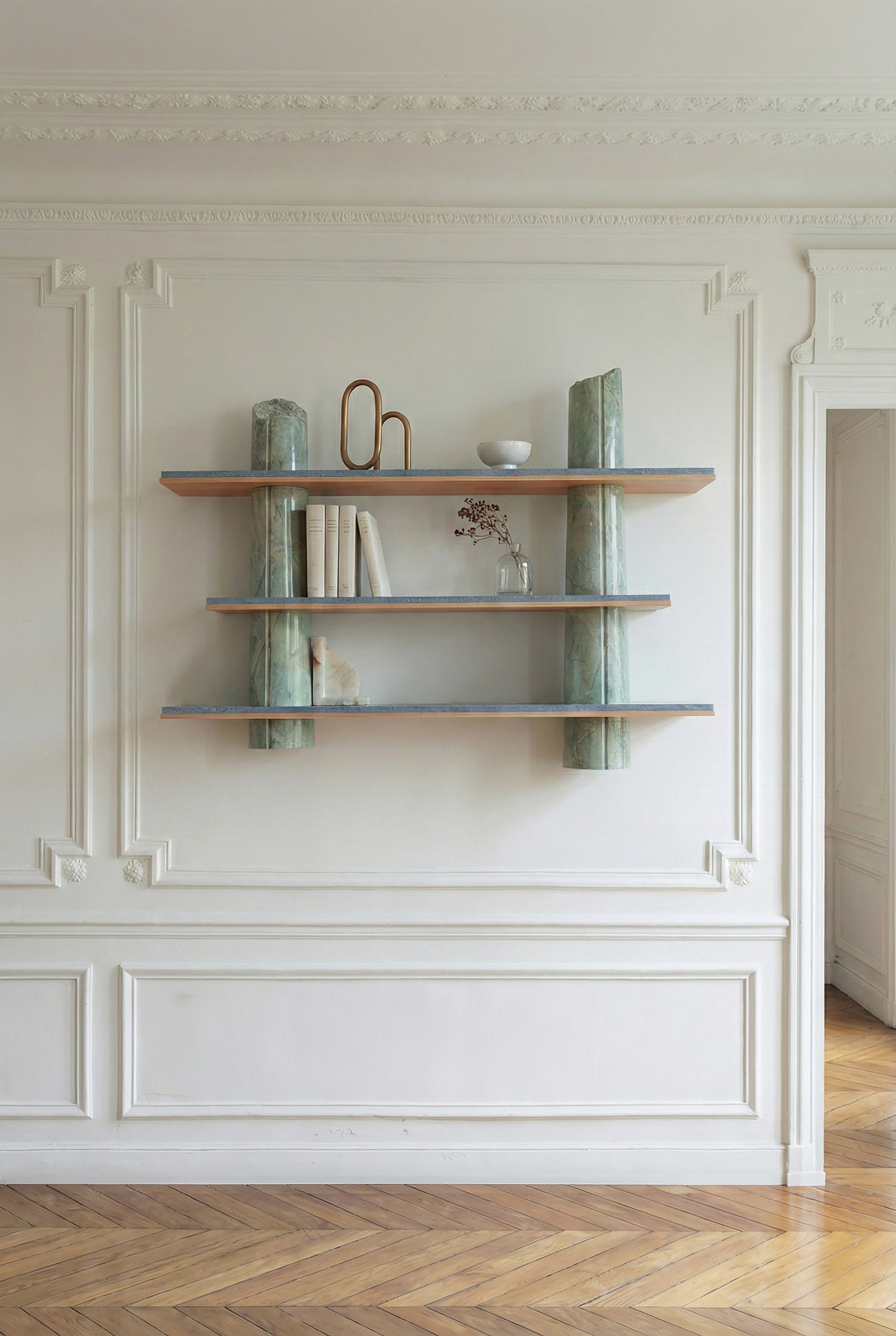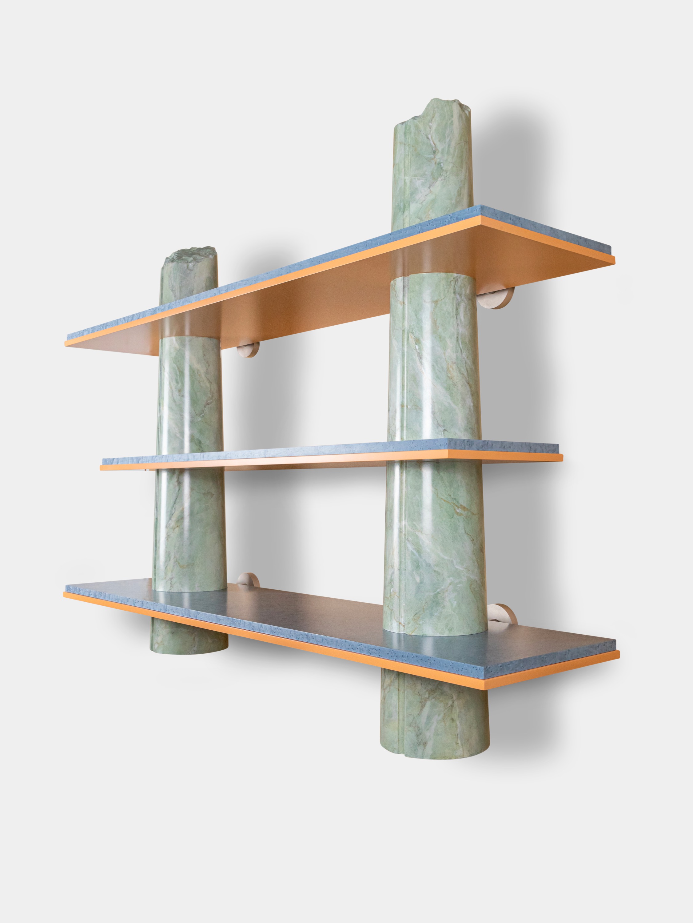 Though the shelves designed for the Passage collection were intended for home use, they also form a sculpture, featuring very precise, deliberate artistic work on the columns that makes them appear broken. This trompe l'oeil is rendered more convincing still by decorative painting that impeccably imitates onyx. A discreet commentary on the environmental footprint left by overconsumption of rare marbles in the décor world.