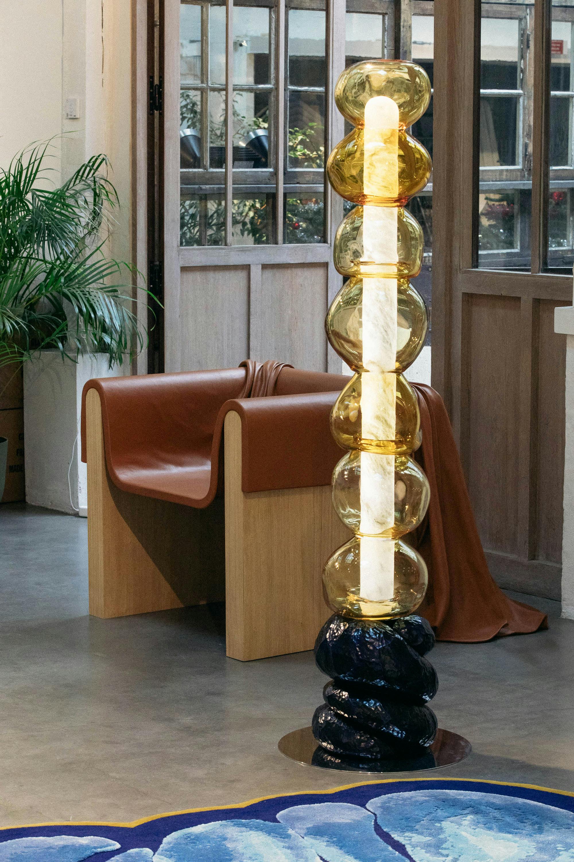 The totem lamp, incorporates the collection’s signature feature, the rope motif, into its base, echoing the traditions of master artisans. Irregularly shaped Murano glass beads are stacked to enclose a backlit alabaster tube, creating contrasts of both volume and light, casting delicate shadows in an exquisite balance of raw and refined materials. This softly curved, glowing tube, implanted in the minimalist architecture, sheds a warm light that adds grace and modern panache to any room.