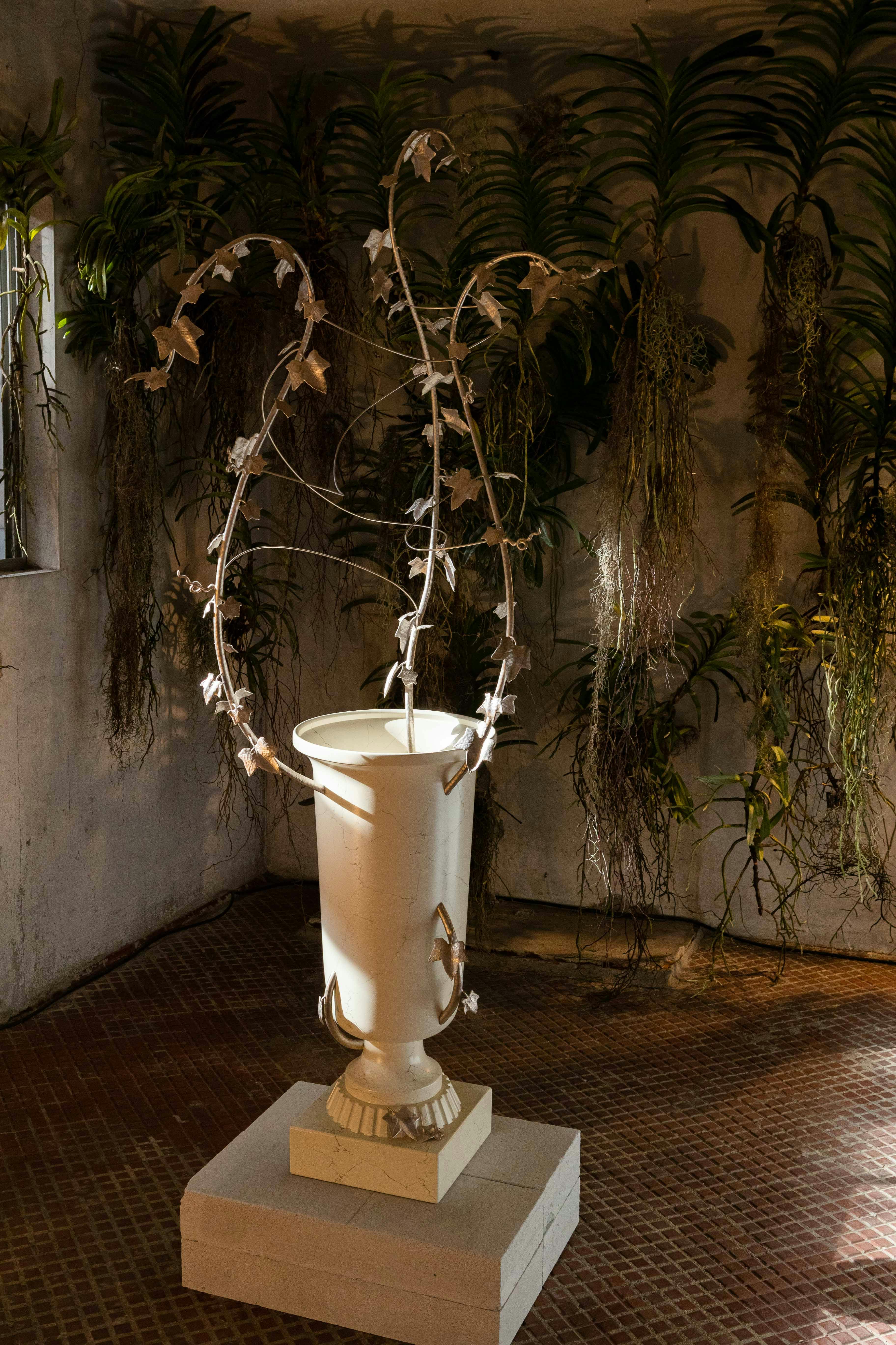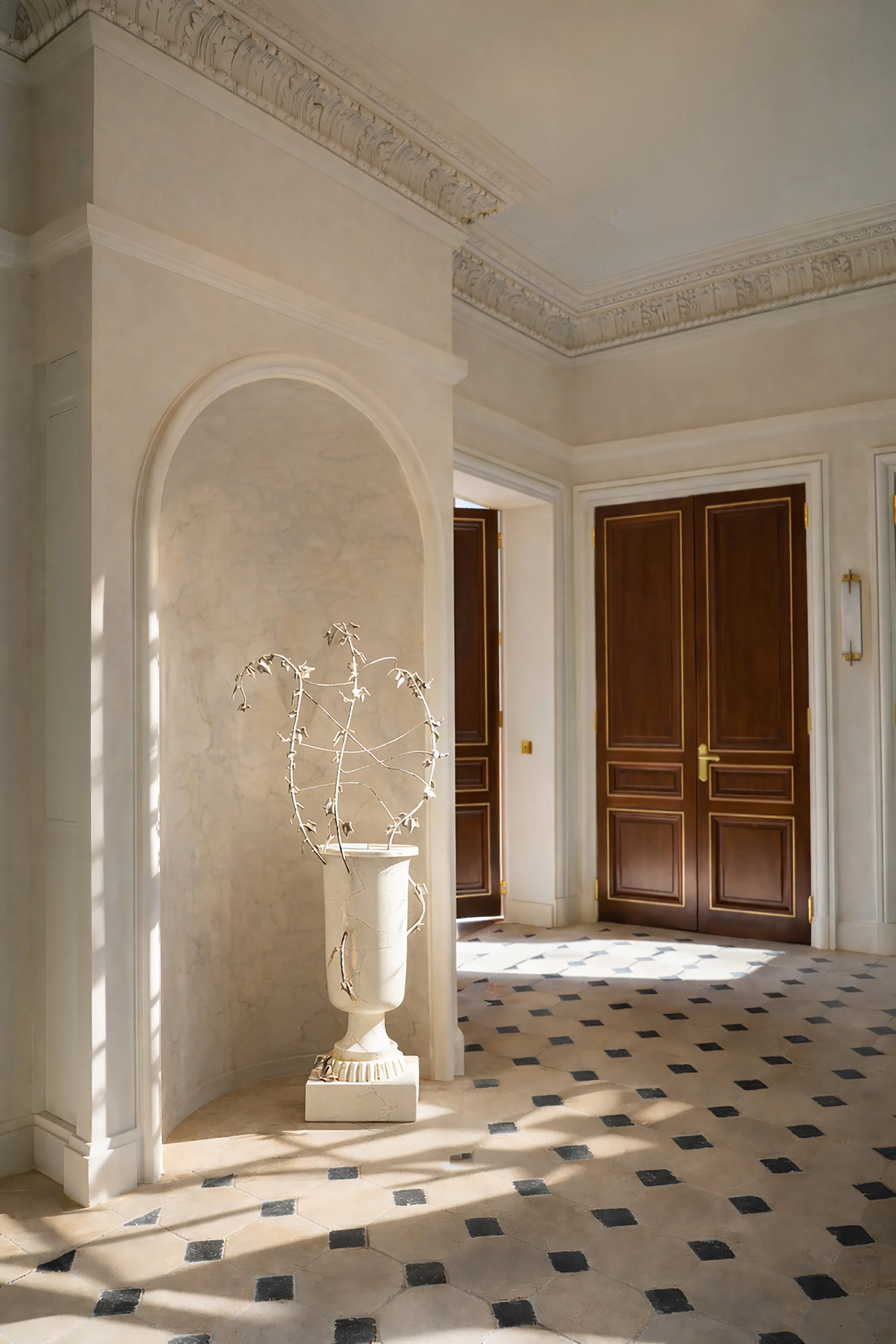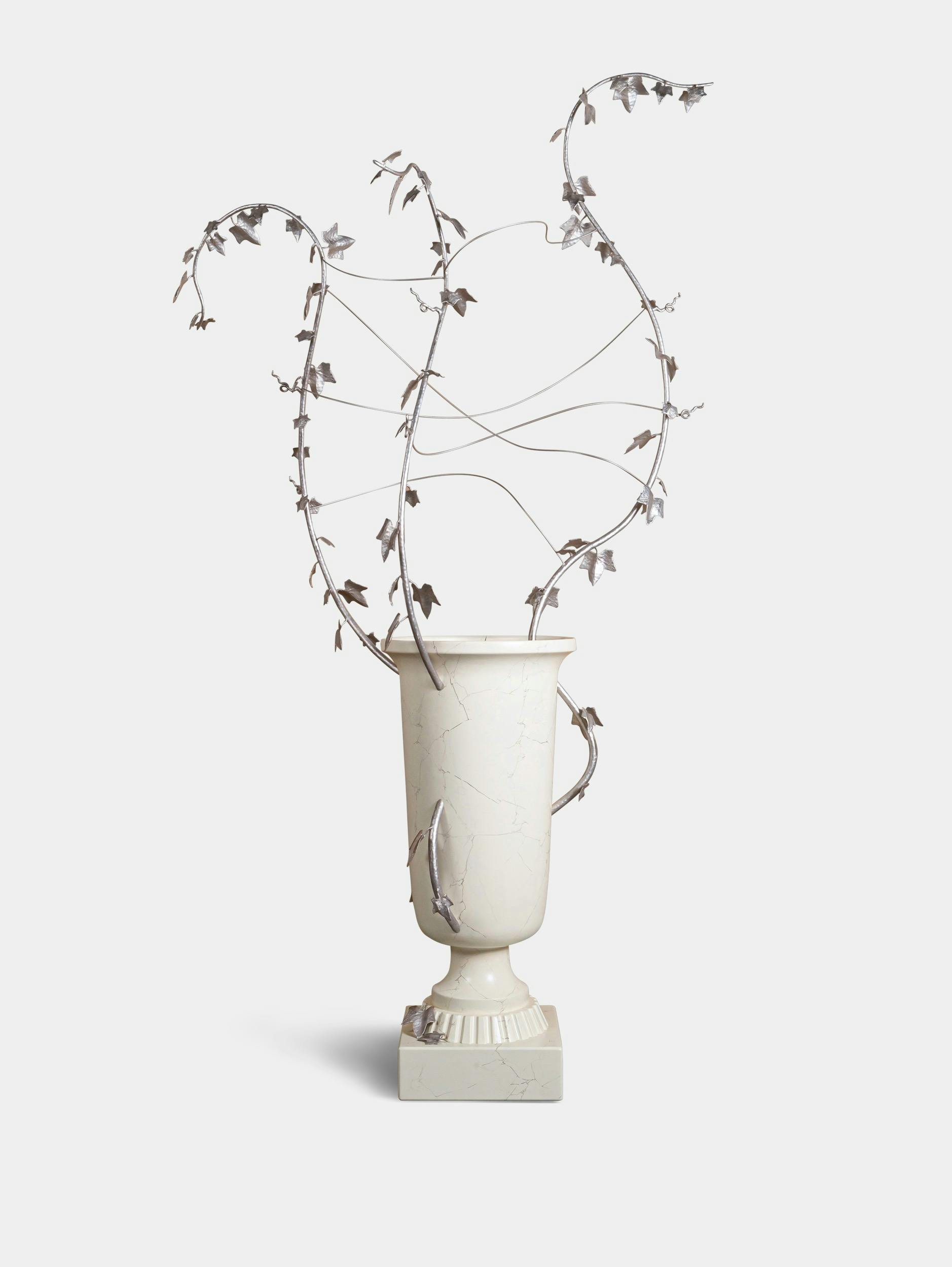 The umbrella stand is the ultimate sculptural piece, and the one designed for the Passage collection explores untamed nature’s invasion of human-built structures. The stand’s vase is painted to imitate chipped porcelain, whence emerge climbing ivy stems in hand-chased bronze, for a visually striking and distinctly useful object.