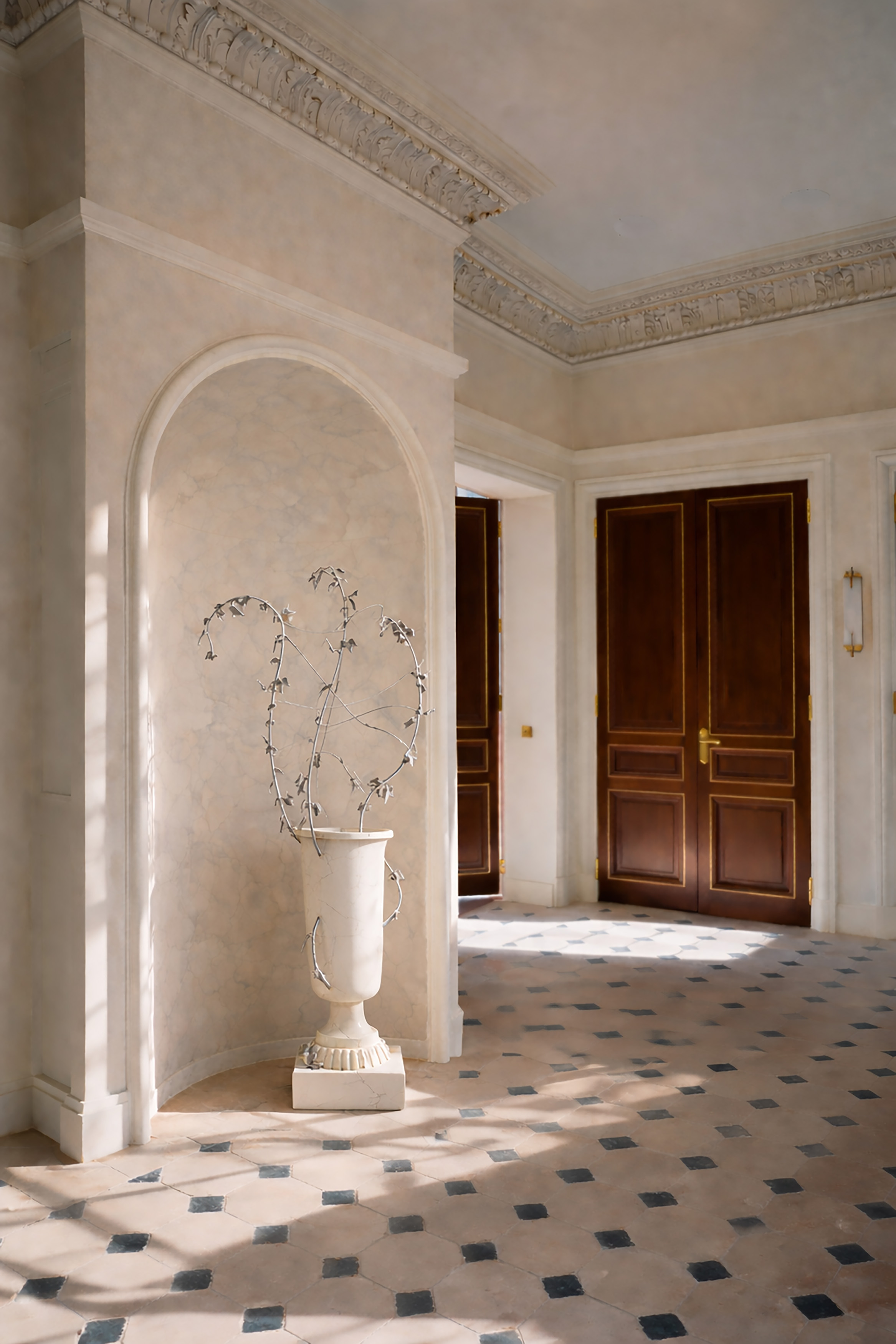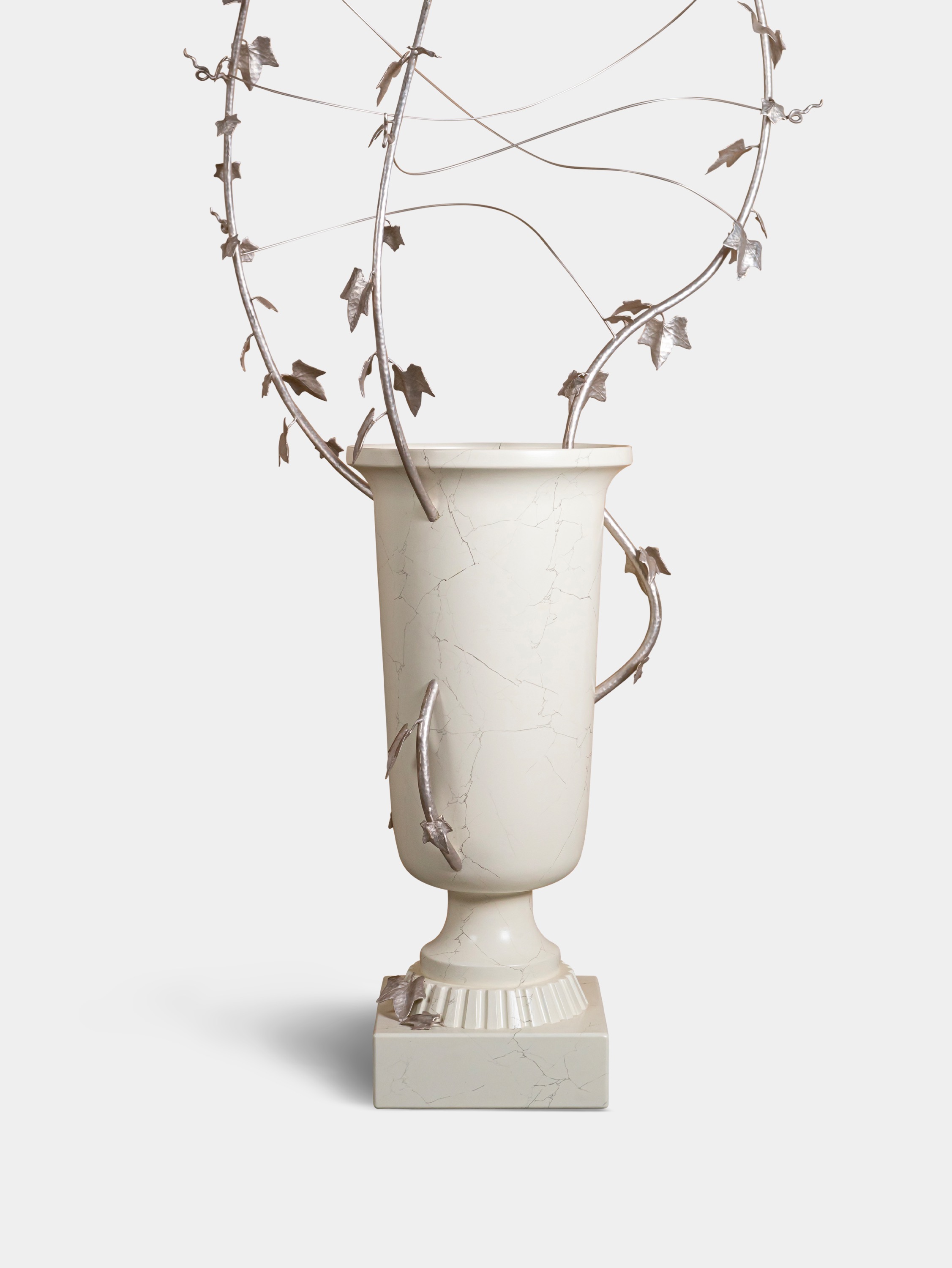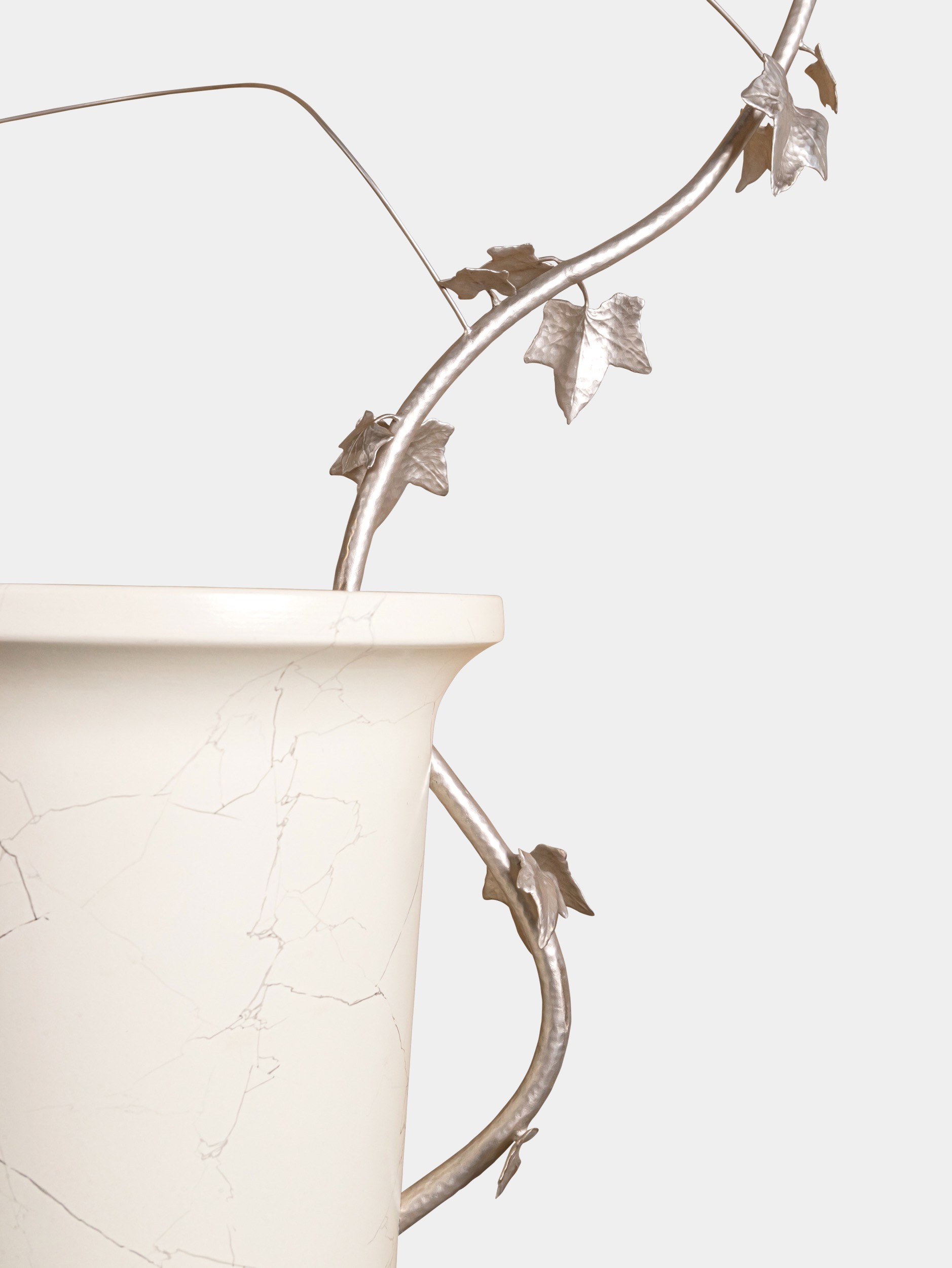The umbrella stand is the ultimate sculptural piece, and the one designed for the Passage collection explores untamed nature’s invasion of human-built structures. The stand’s vase is painted to imitate chipped porcelain, whence emerge climbing ivy stems in hand-chased bronze, for a visually striking and distinctly useful object.