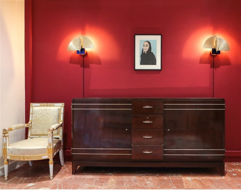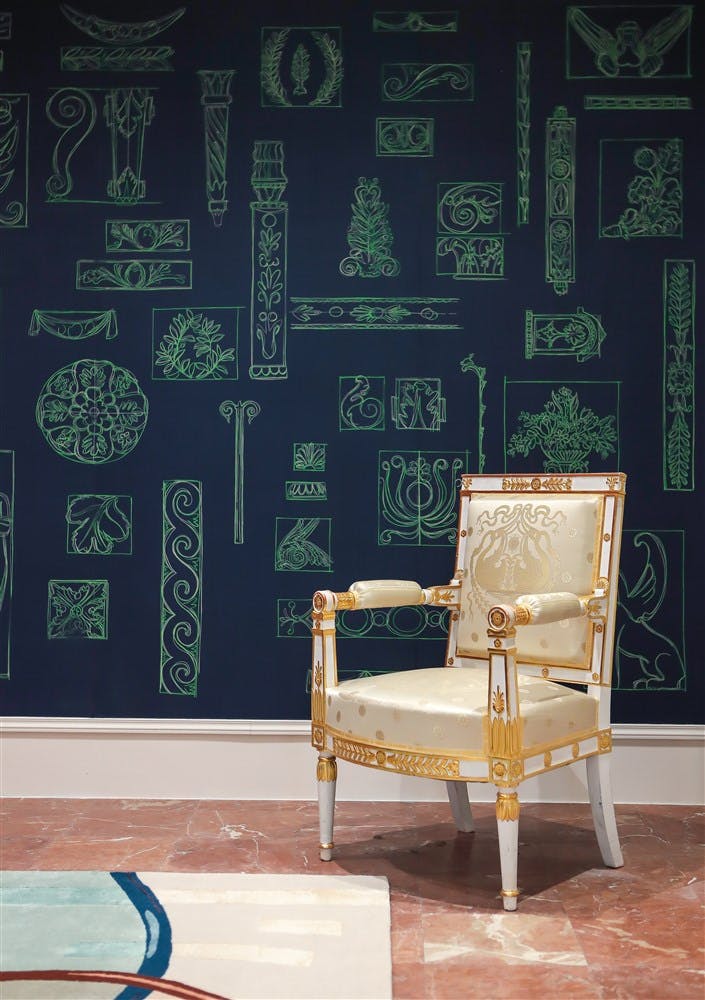 Rinck dreamed up the colorful interior of an enthusiastic collector and introduces the new piece from the Félicité collection, a brass ceiling light, and its new collaboration with Fromental: the hand-painted silk wallcovering “The Classicist Sketchbook".