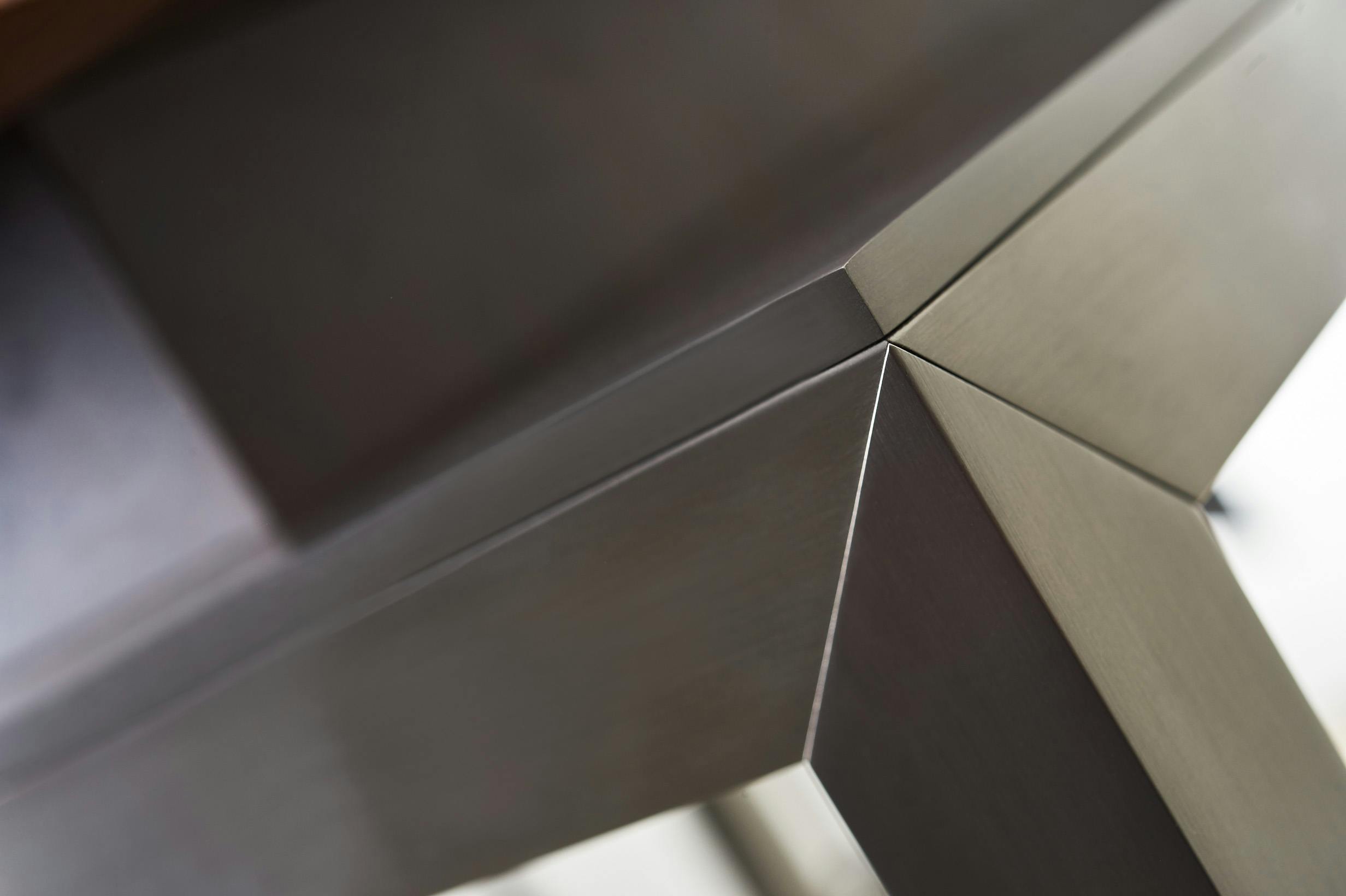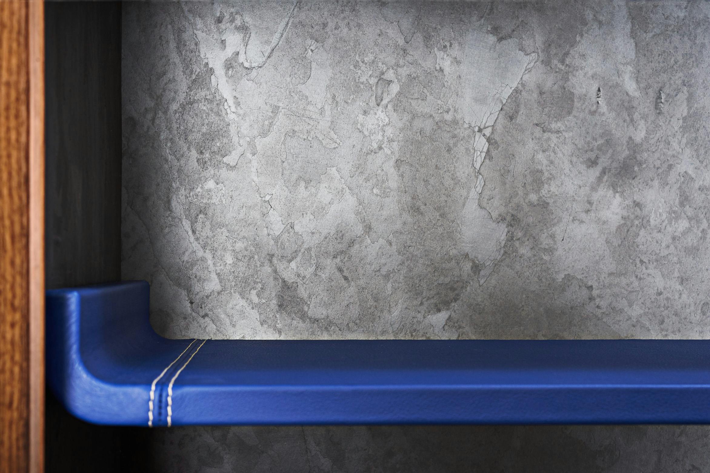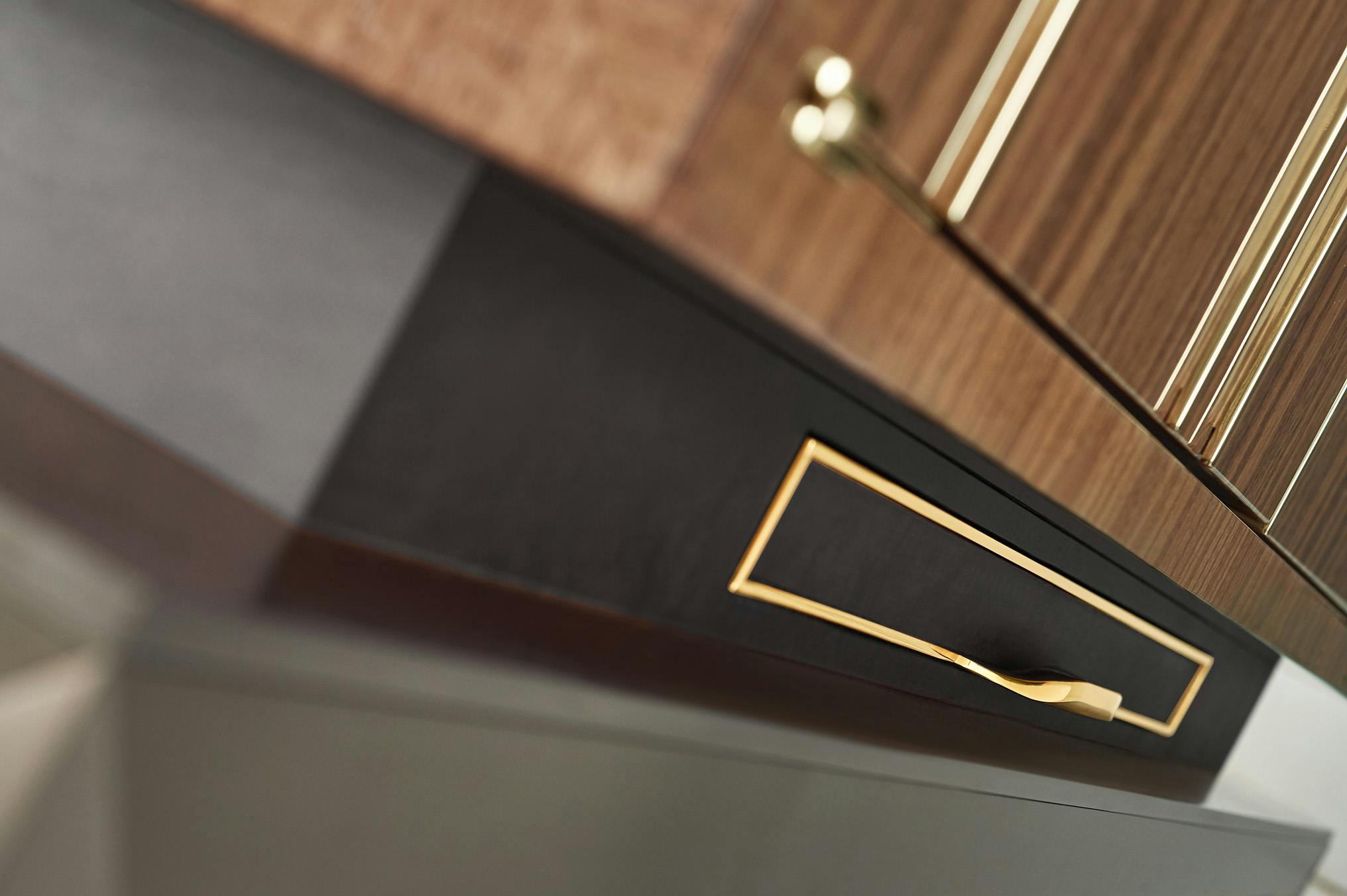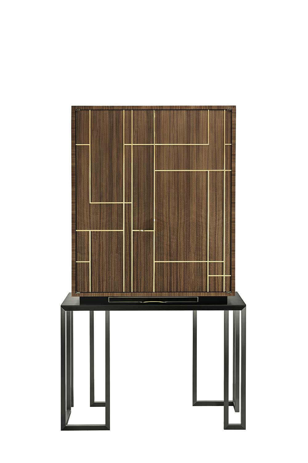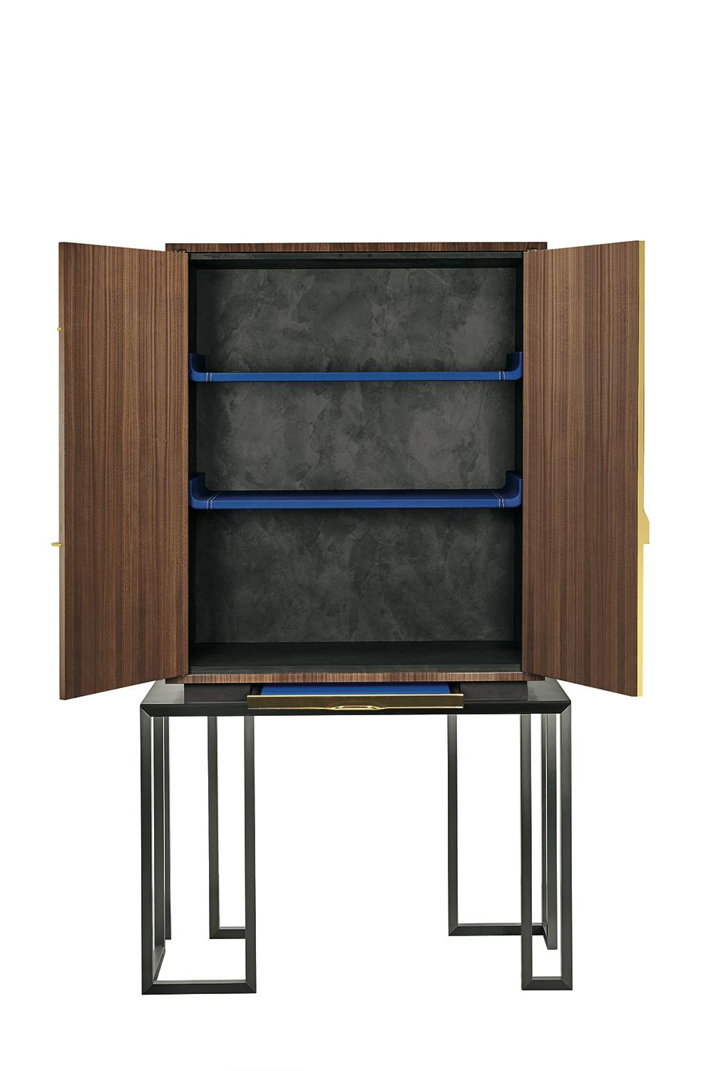 Cabinet in US walnut veneer, pore filler high gloss varnish and brass inlay. Interior box made in slate and grained leather.