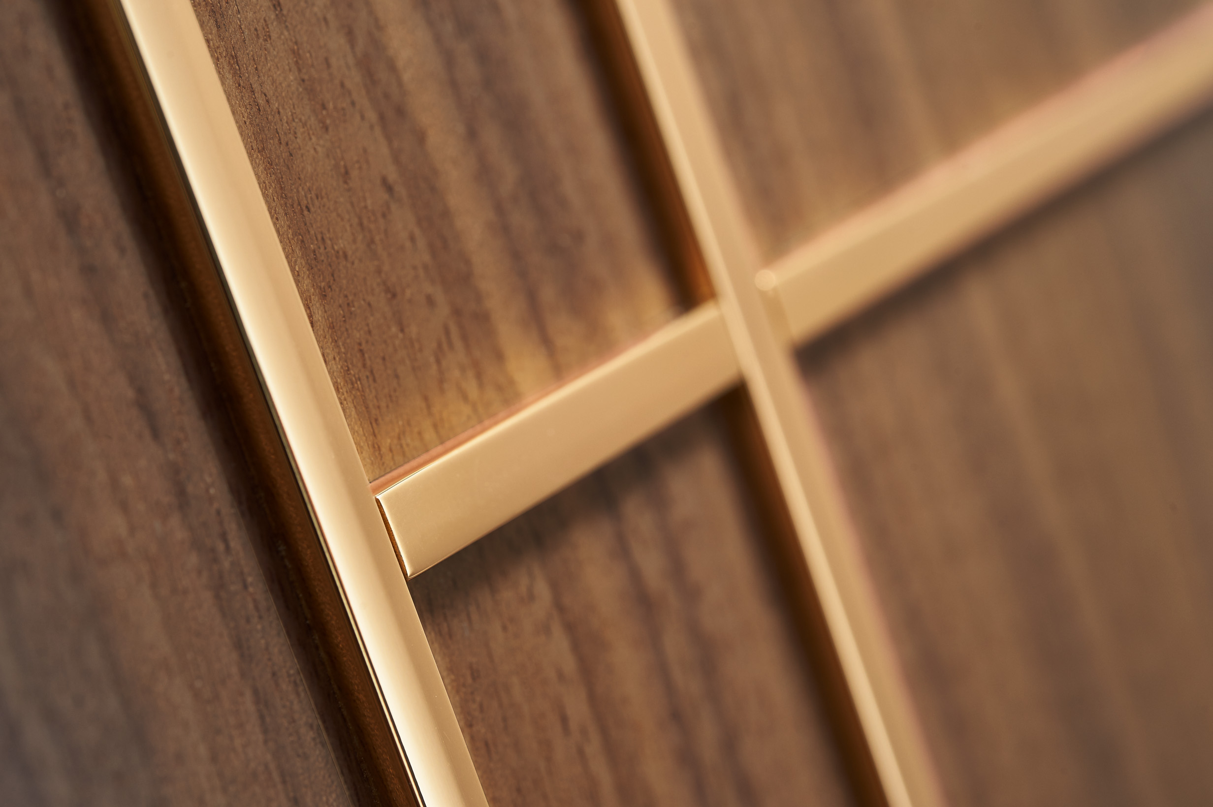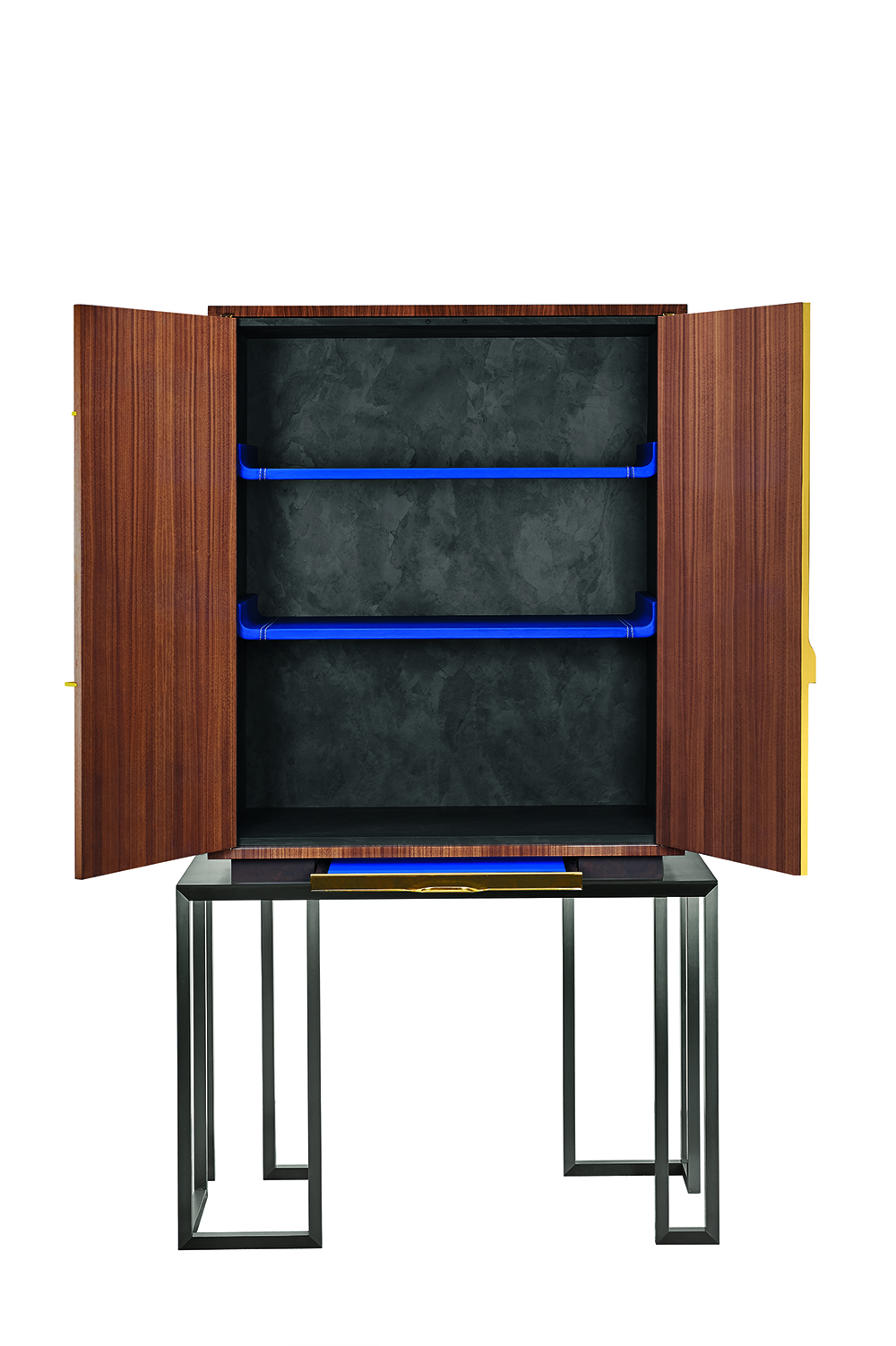 Cabinet in US walnut veneer, pore filler high gloss varnish and brass inlay. Interior box made in slate and grained leather.