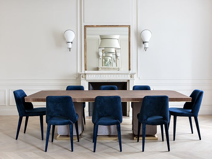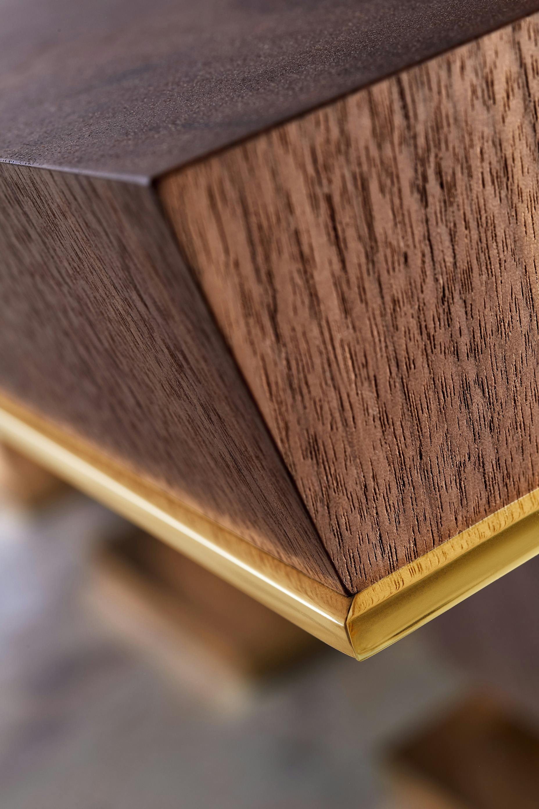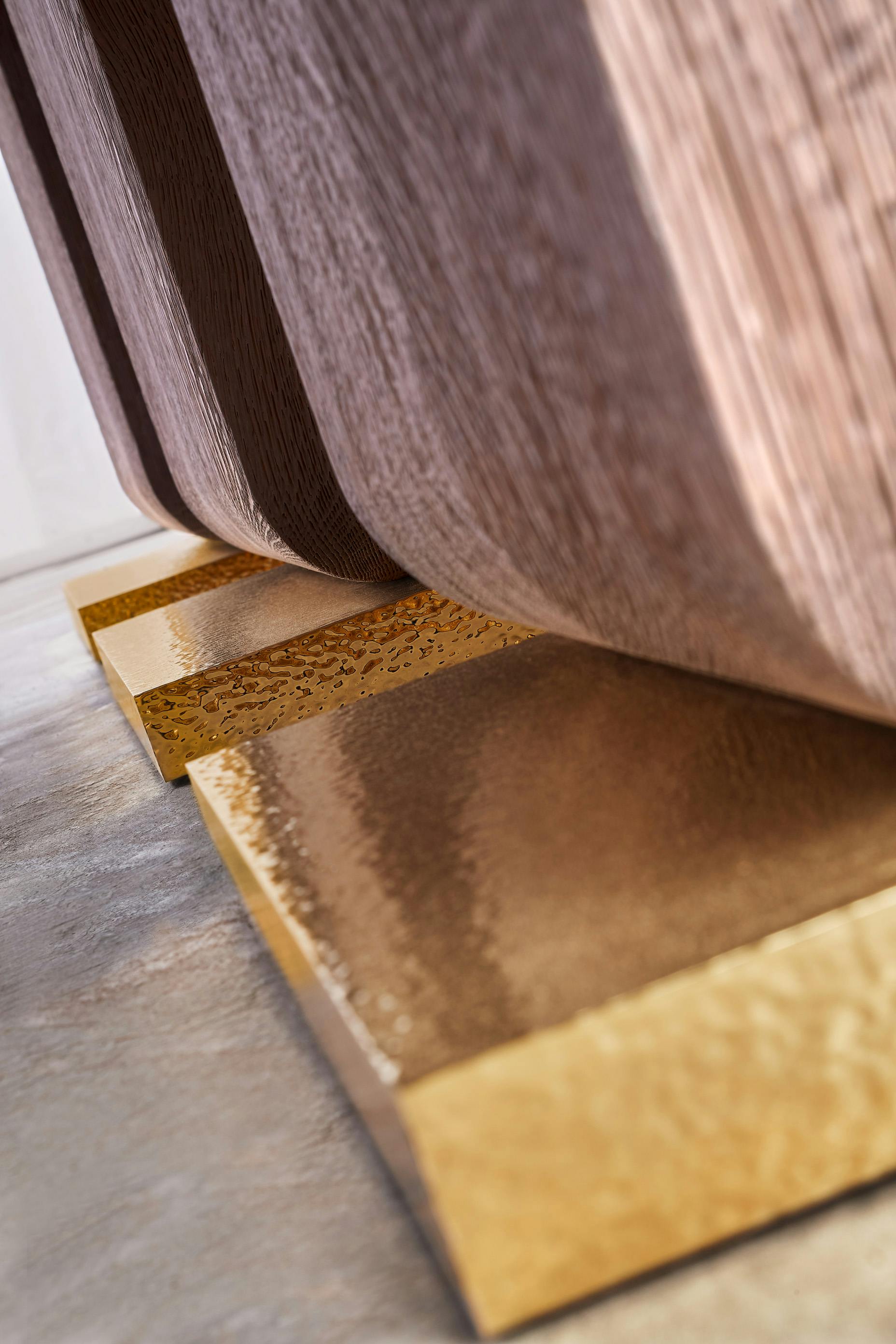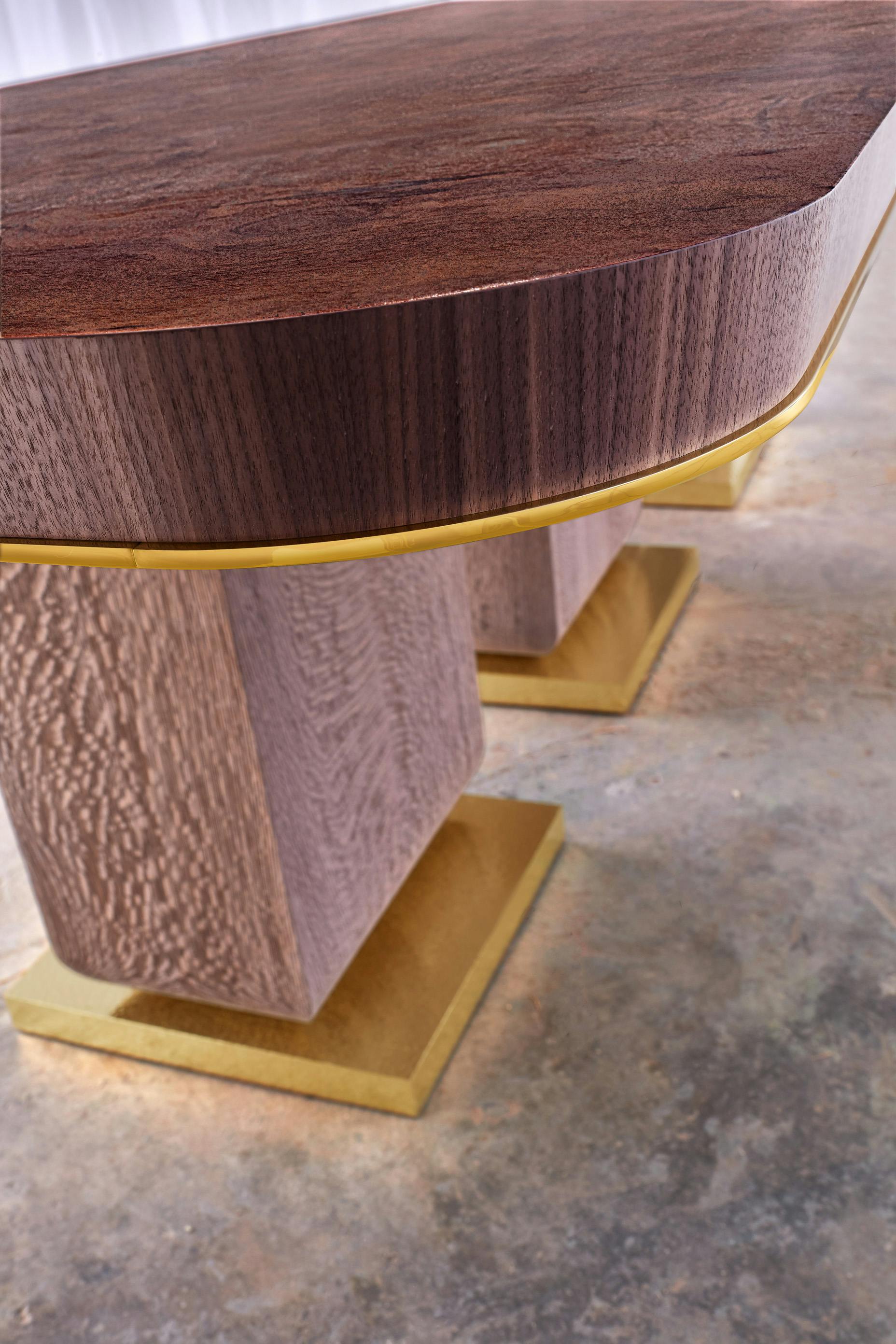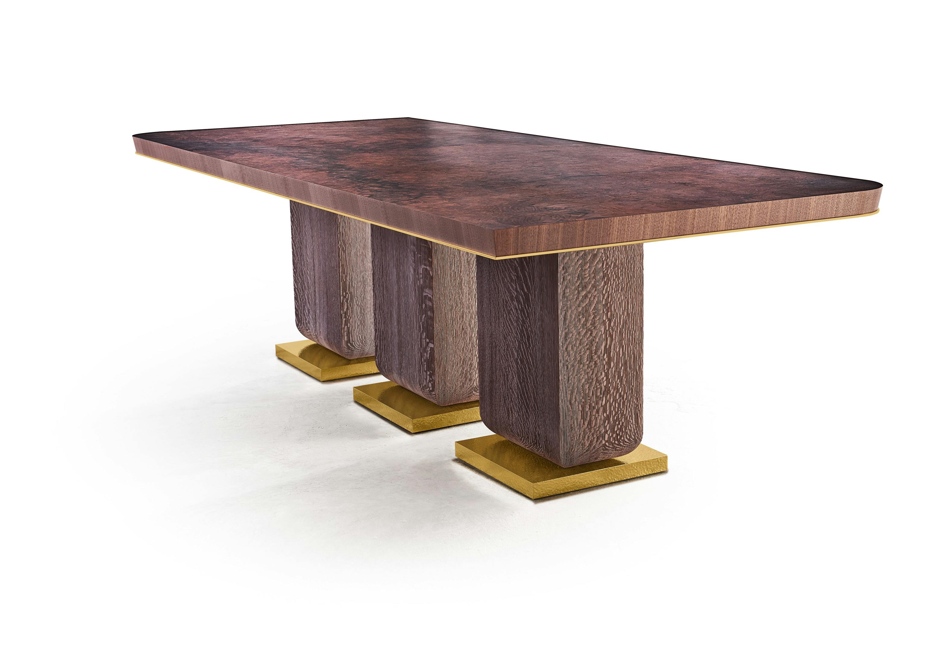 Dining table in walnut burl, sandblasted oak wood and hammered brass.
