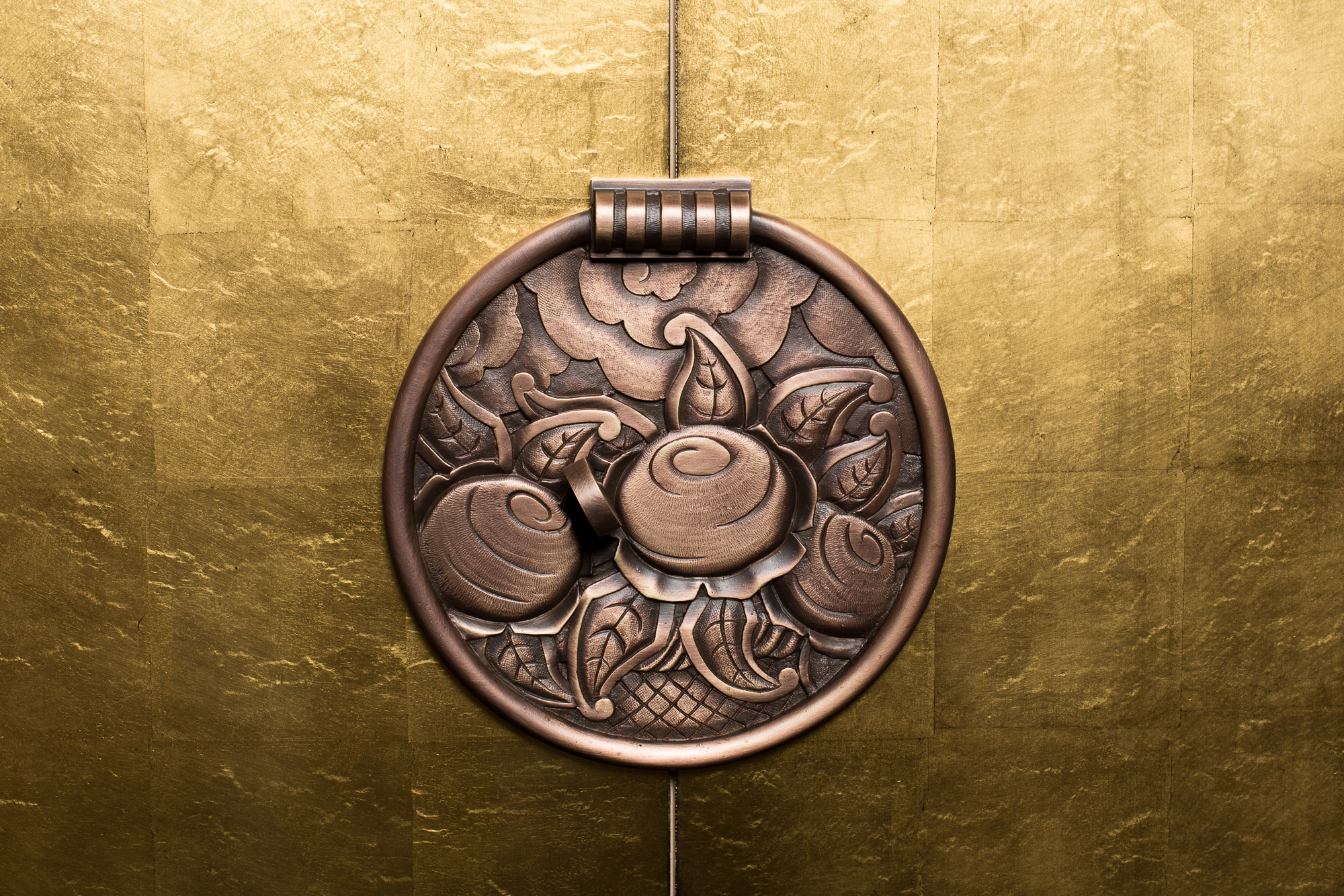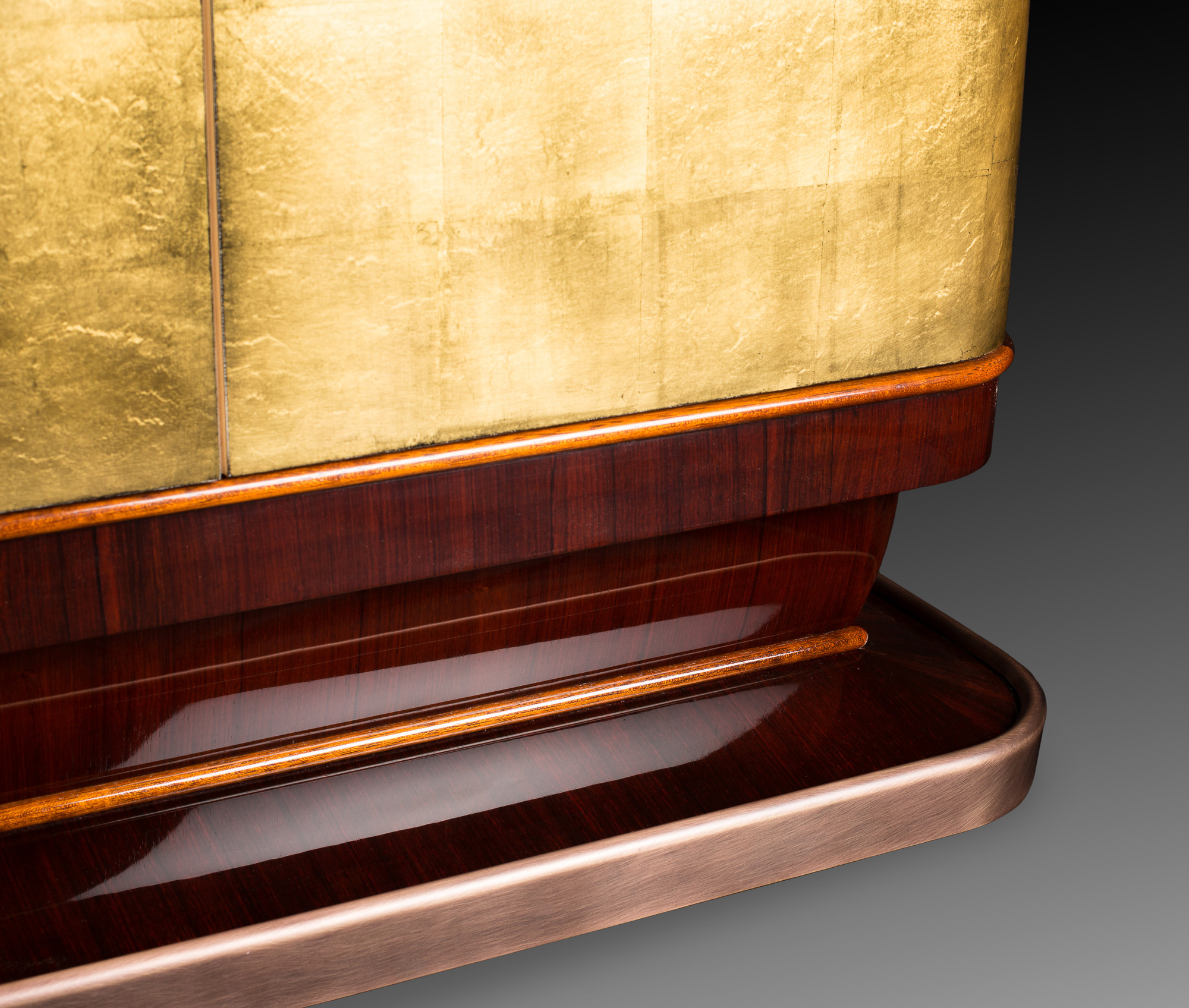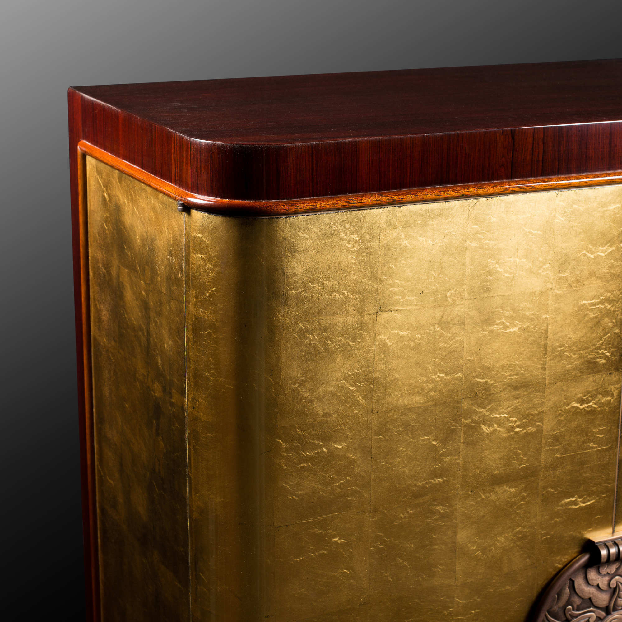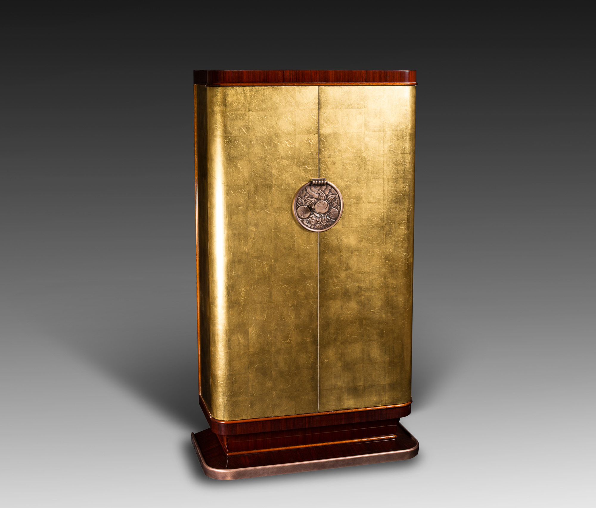 Cabinet in rosewood veneers, square gold leaves pattern and sand casted patina keyhole.