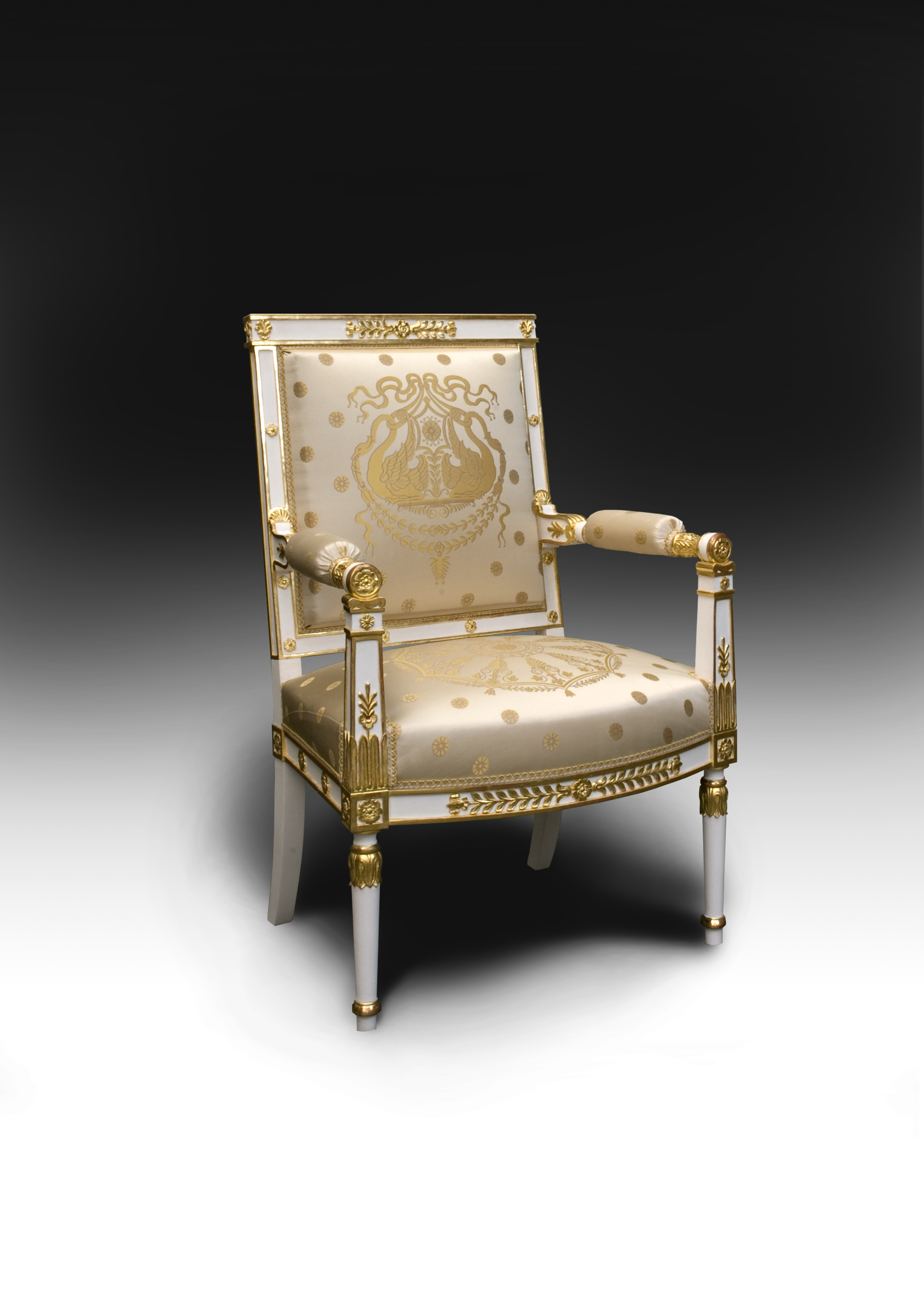 Marie-Antoinette style armchair with hand carved beechwood, gold leaf finishing, white lacquer and highlight gilding.