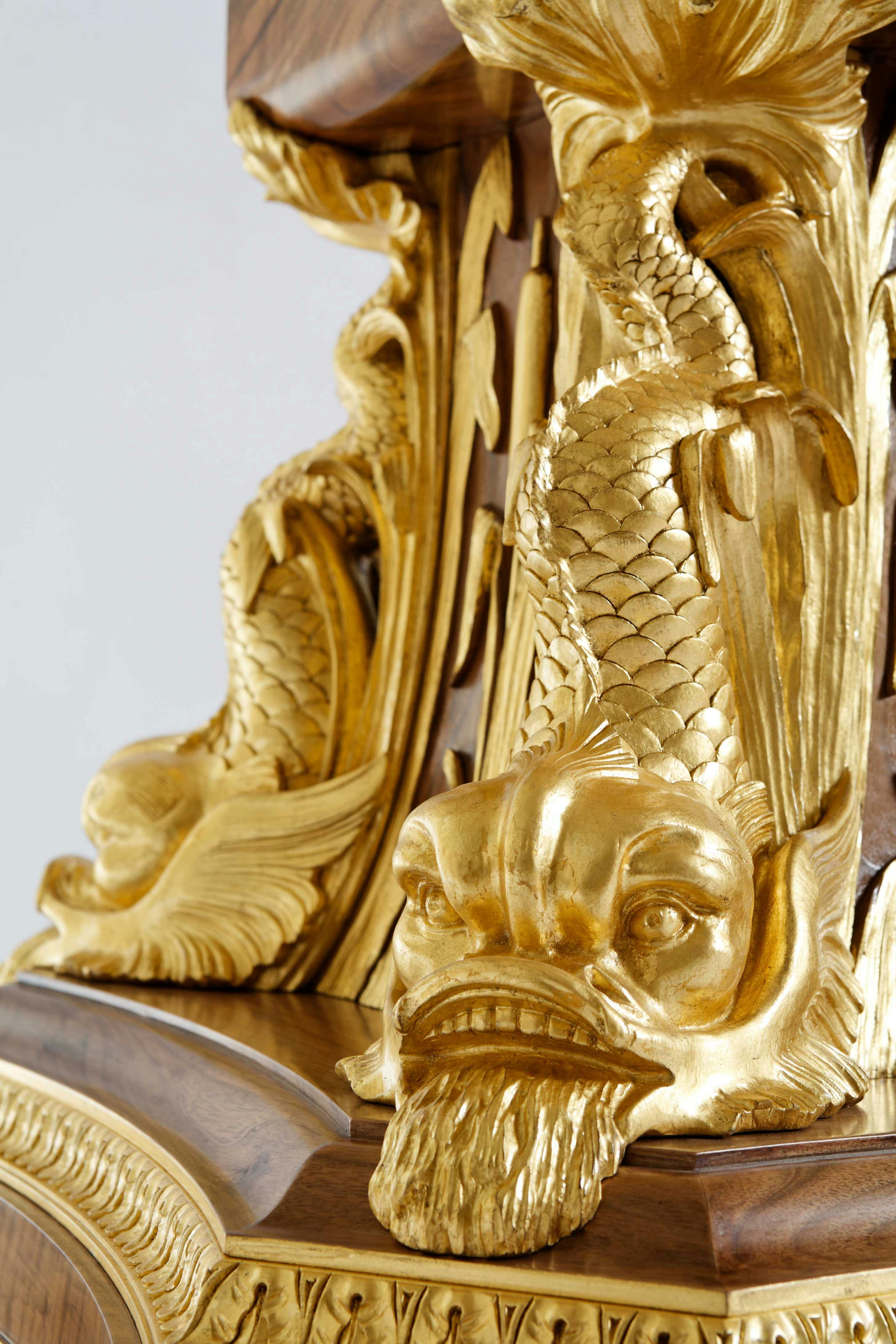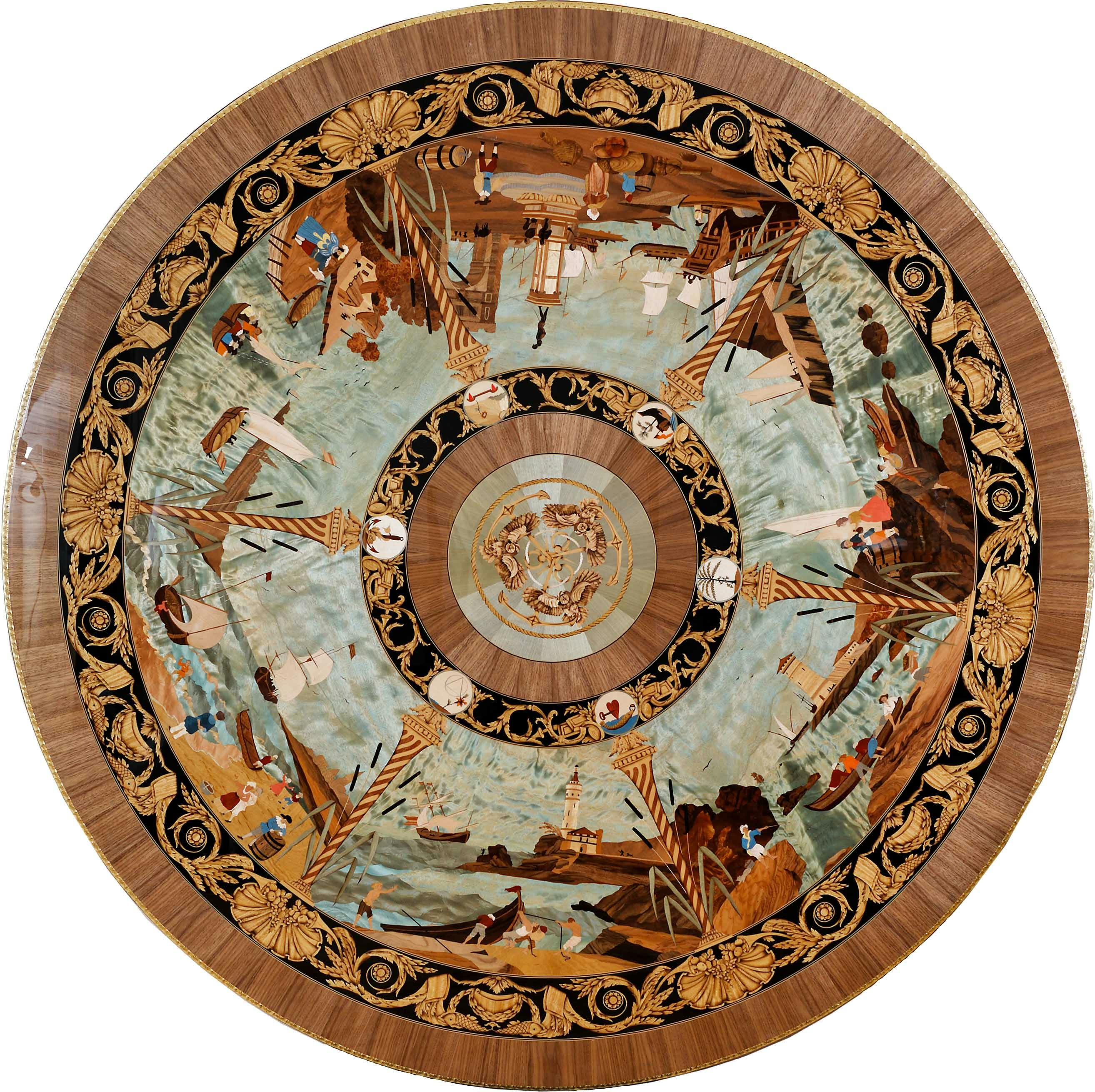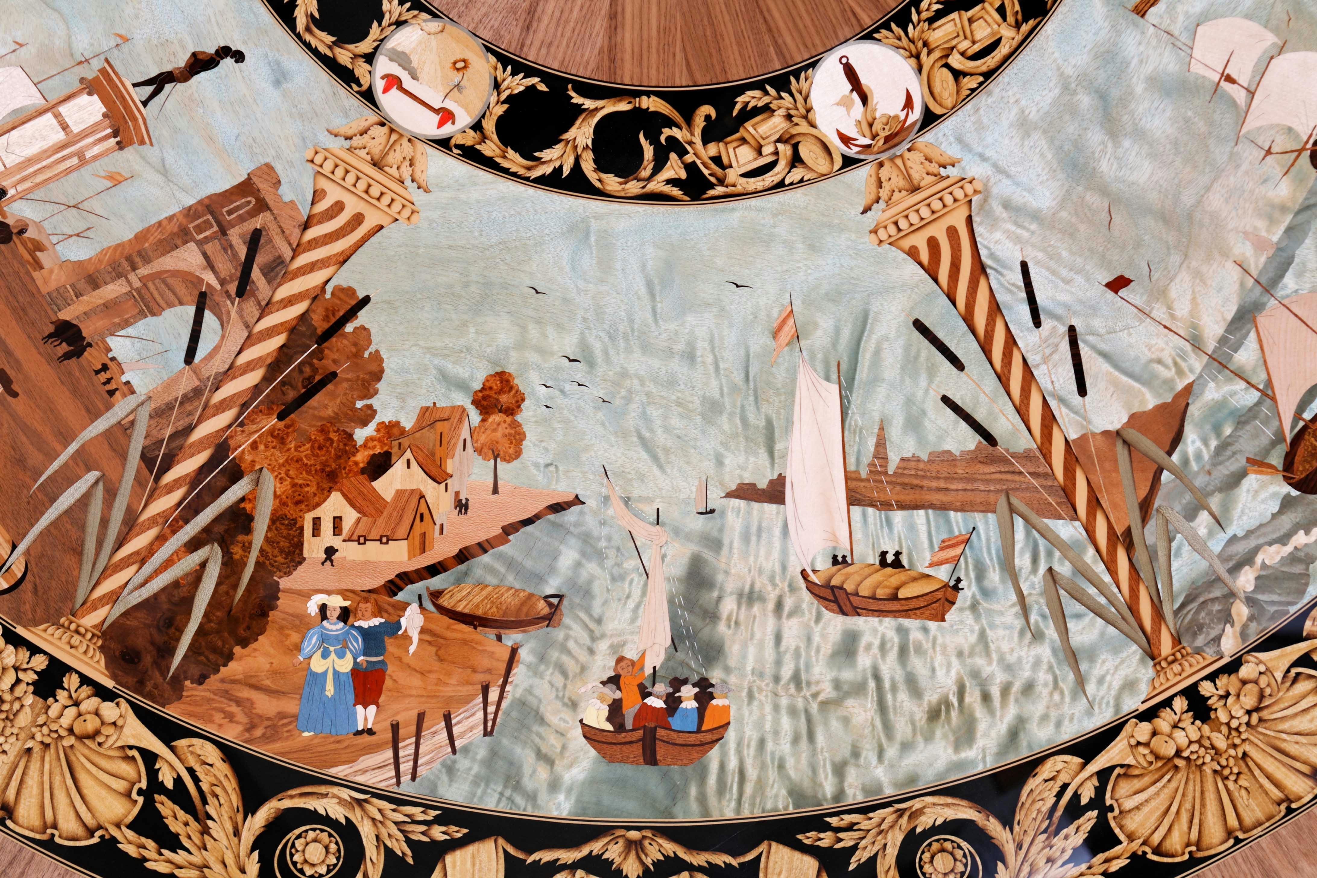 Table in solid walnut, gold leaf finishing and marquetry top inspired by 17th and 18th century French and Flemish paintings.