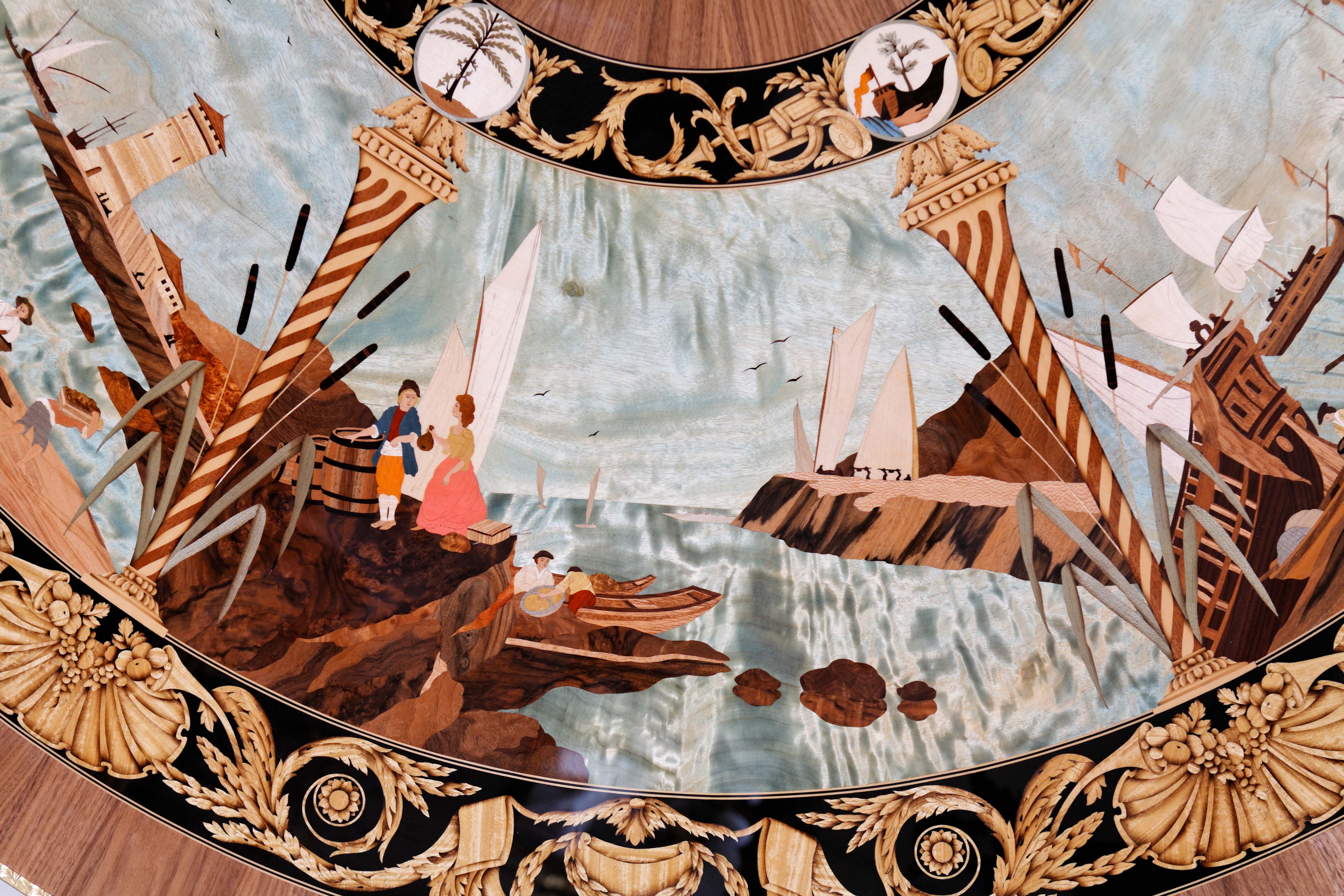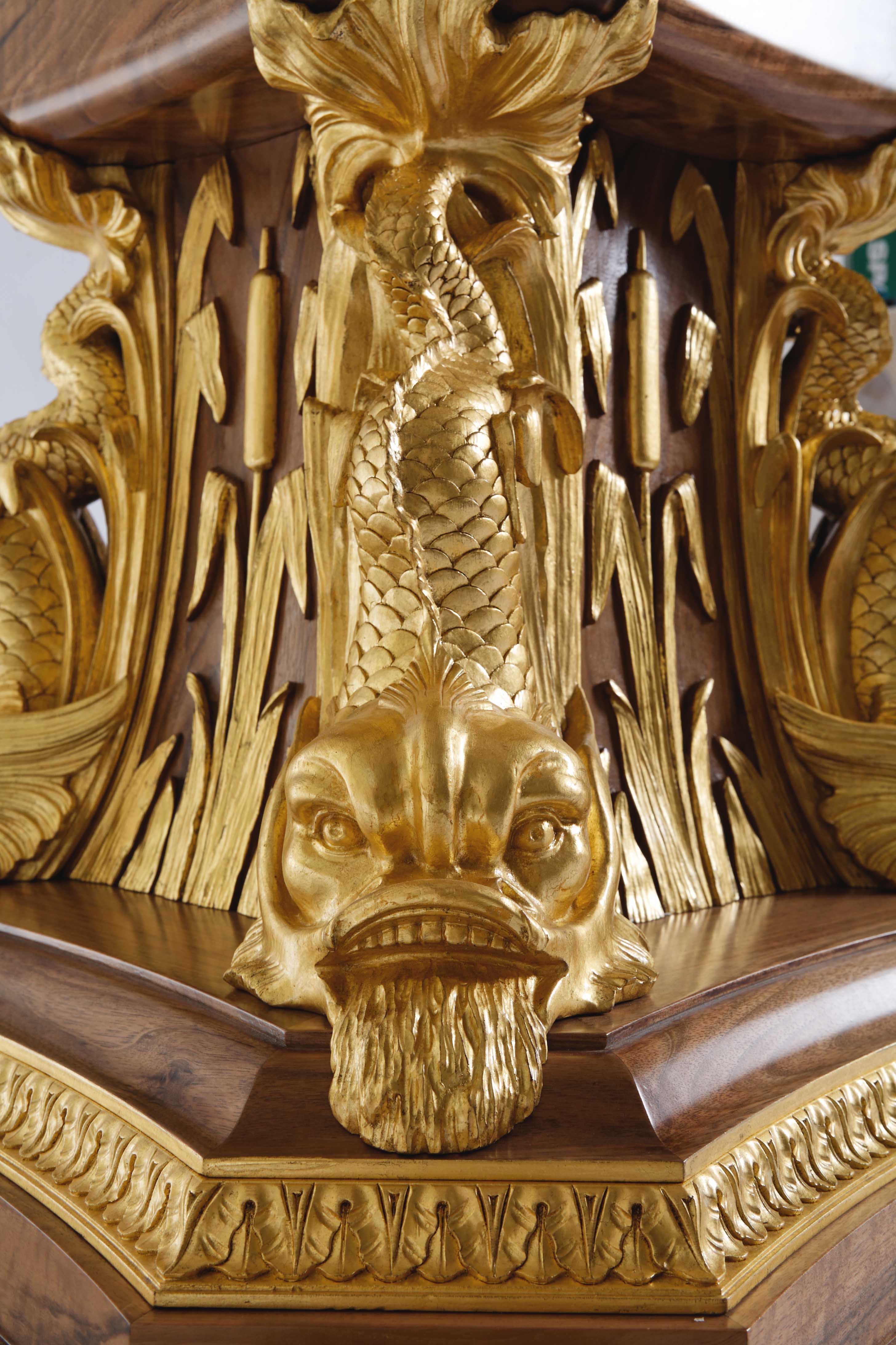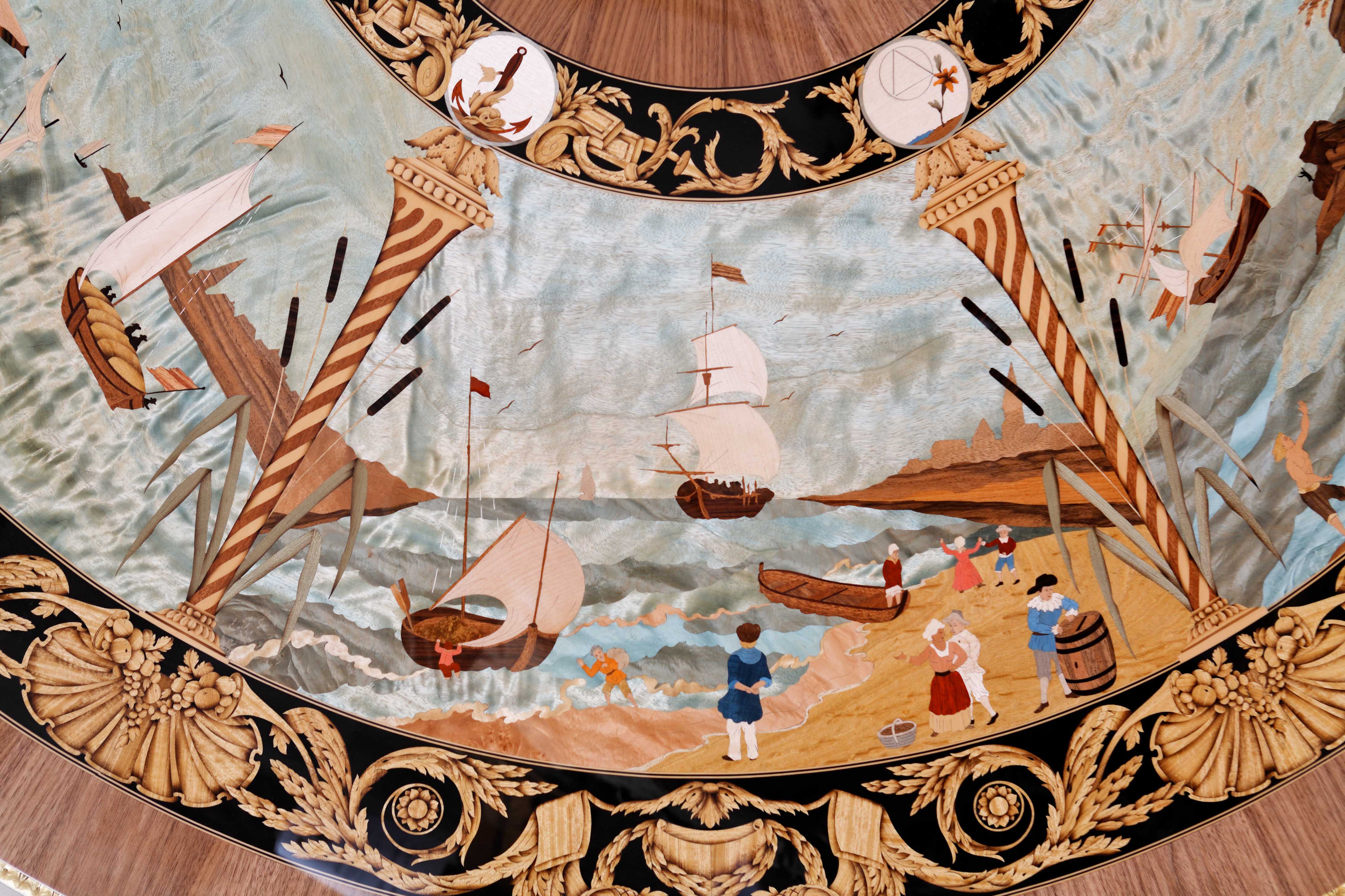 Table in solid walnut, gold leaf finishing and marquetry top inspired by 17th and 18th century French and Flemish paintings.