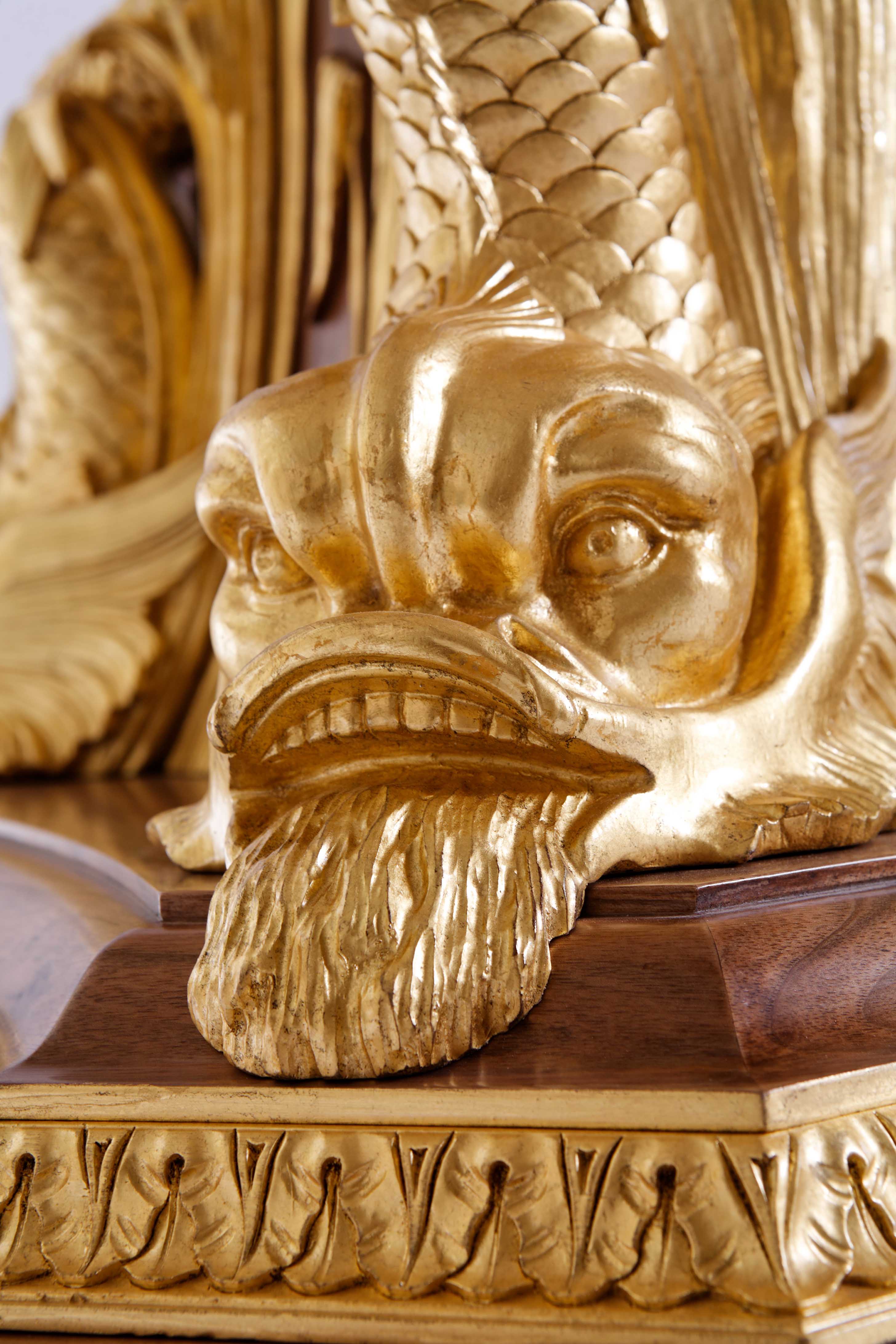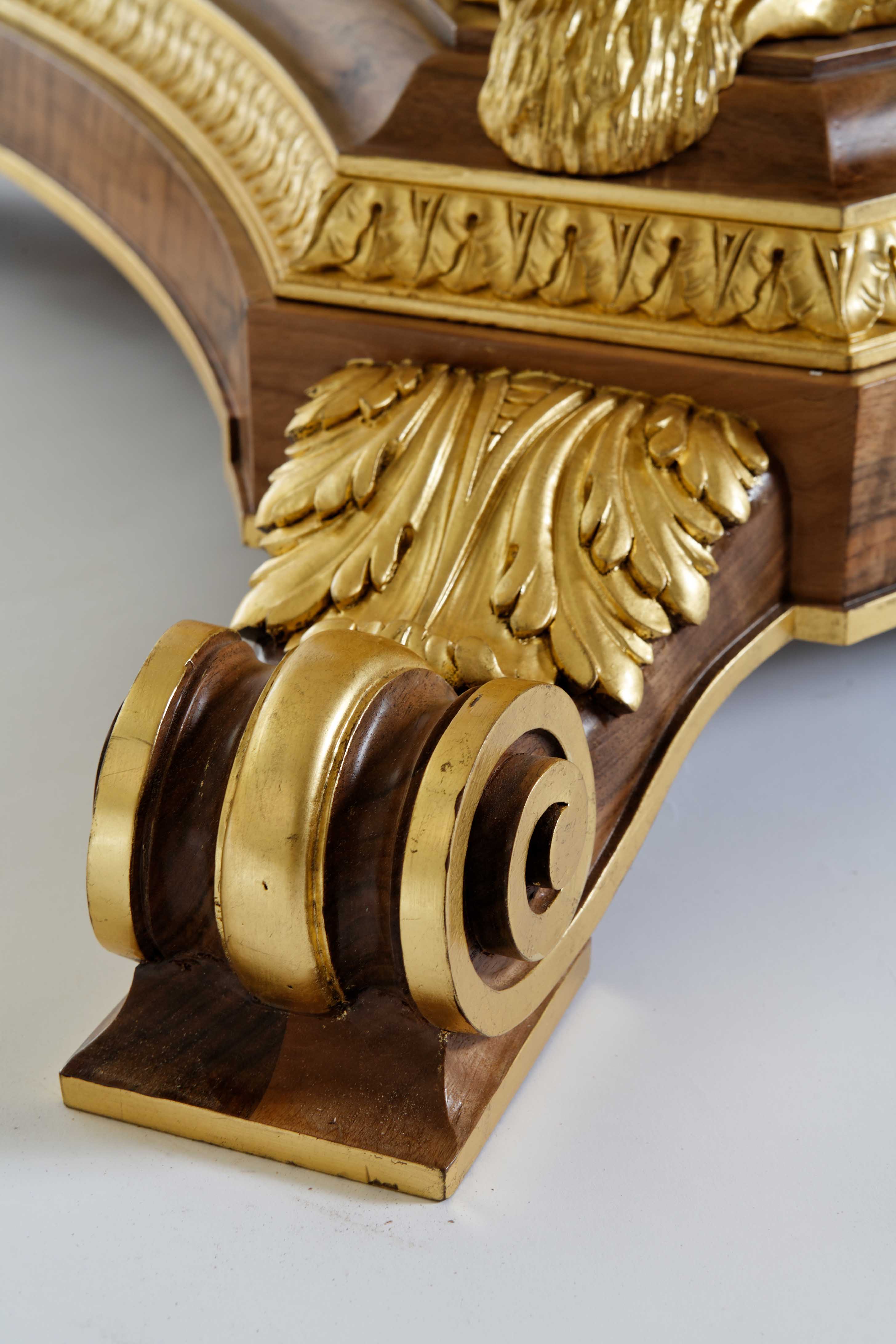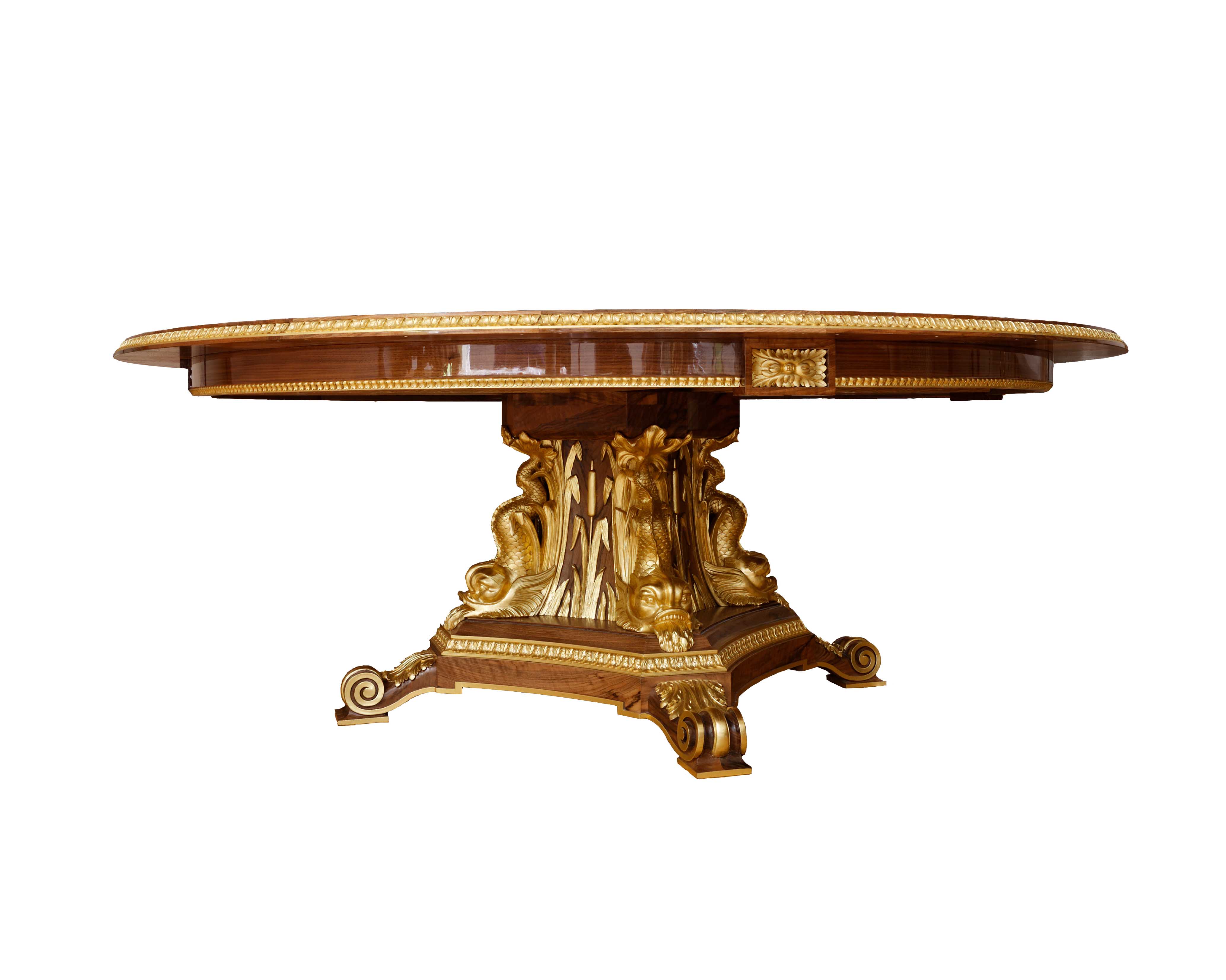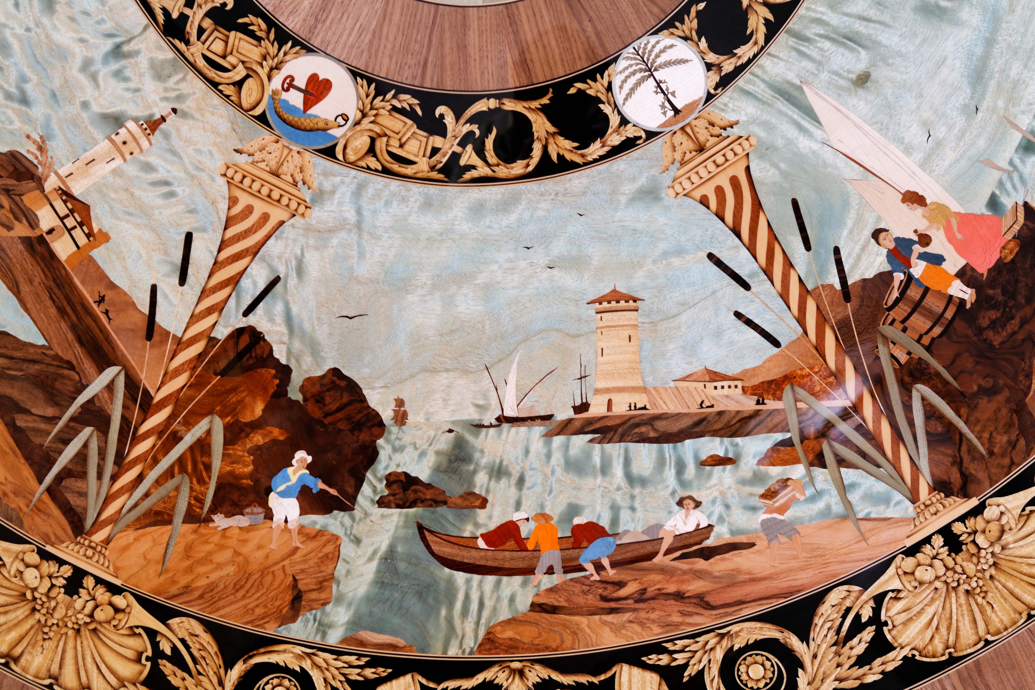 Table in solid walnut, gold leaf finishing and marquetry top inspired by 17th and 18th century French and Flemish paintings.