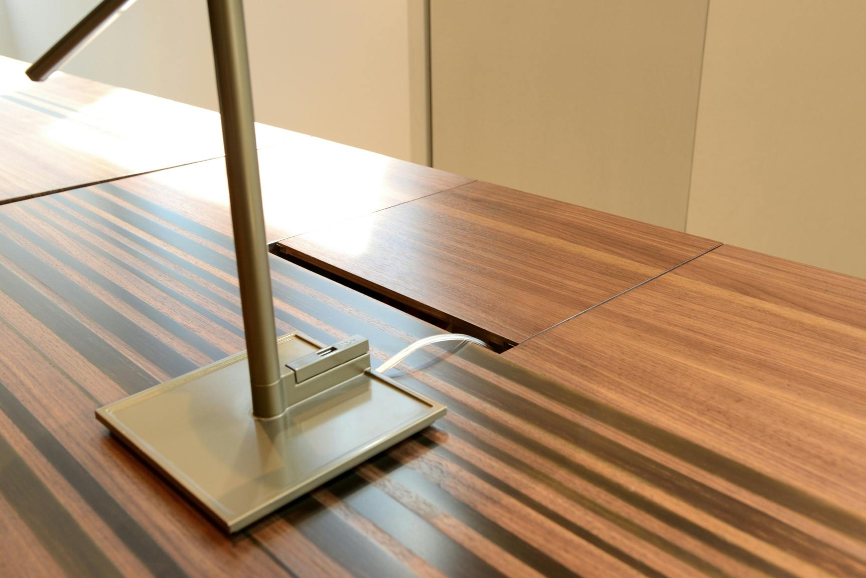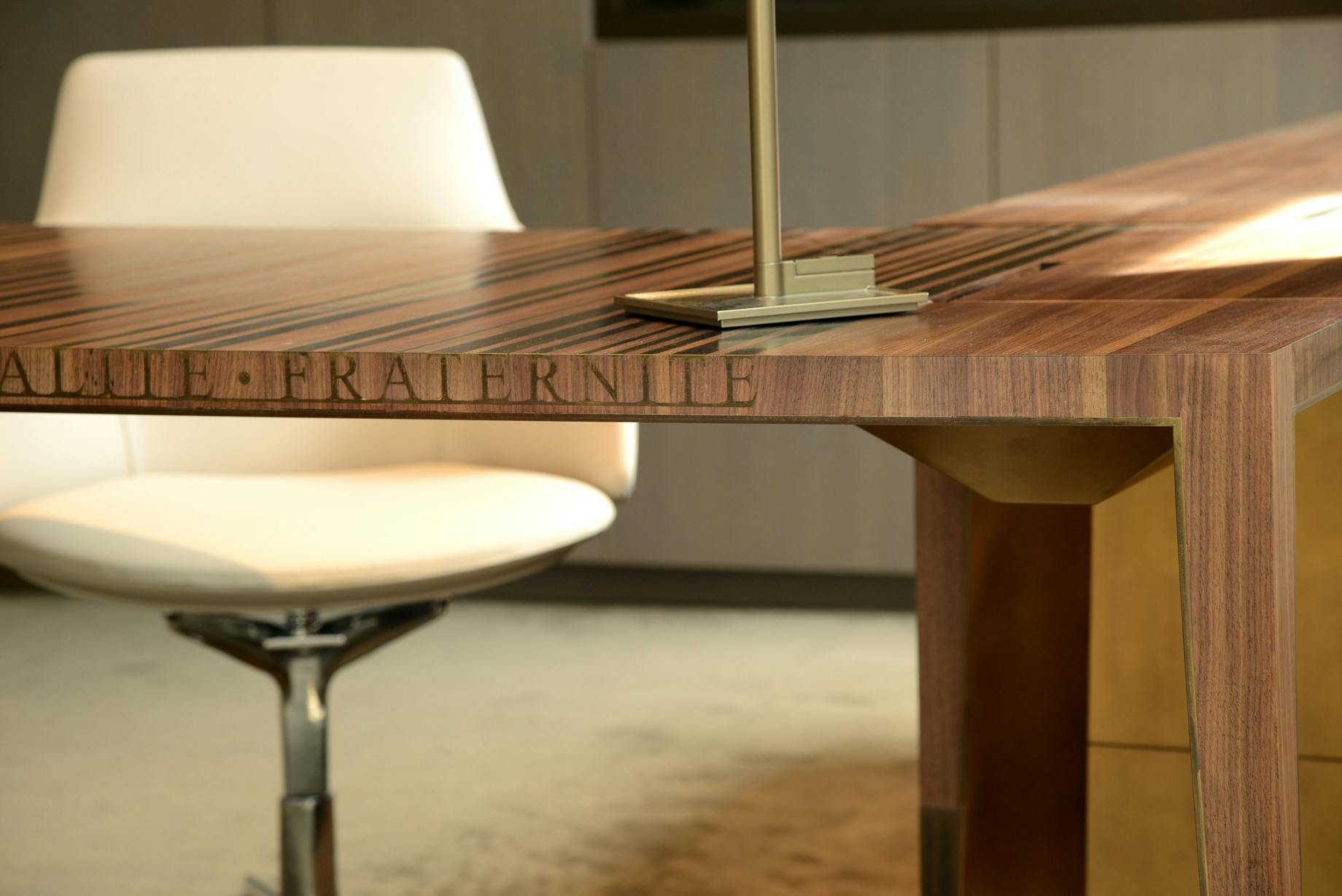 Desk made by Rinck for Industrial Orchestra in metal, wood, US walnut, brass marquetery, hand patina on brass and varnish with wiring integration.
