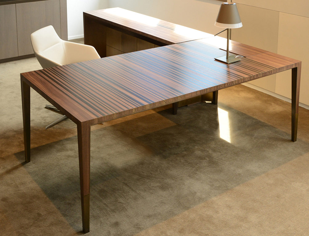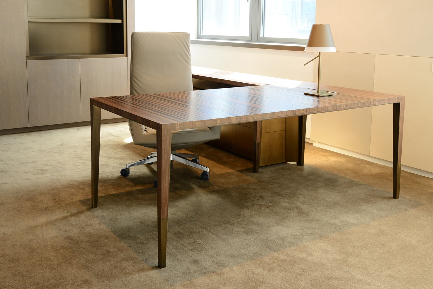 Desk made by Rinck for Industrial Orchestra in metal, wood, US walnut, brass marquetery, hand patina on brass and varnish with wiring integration.