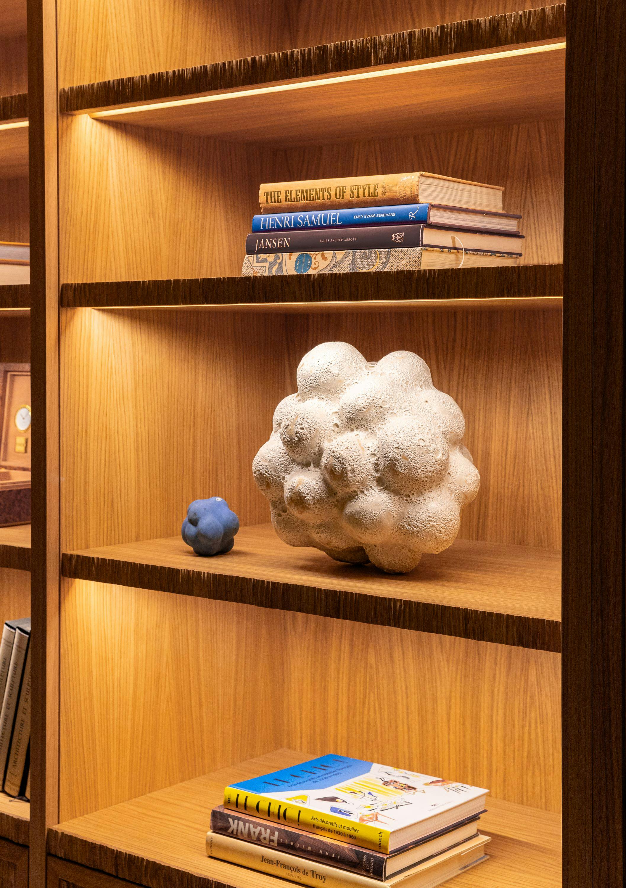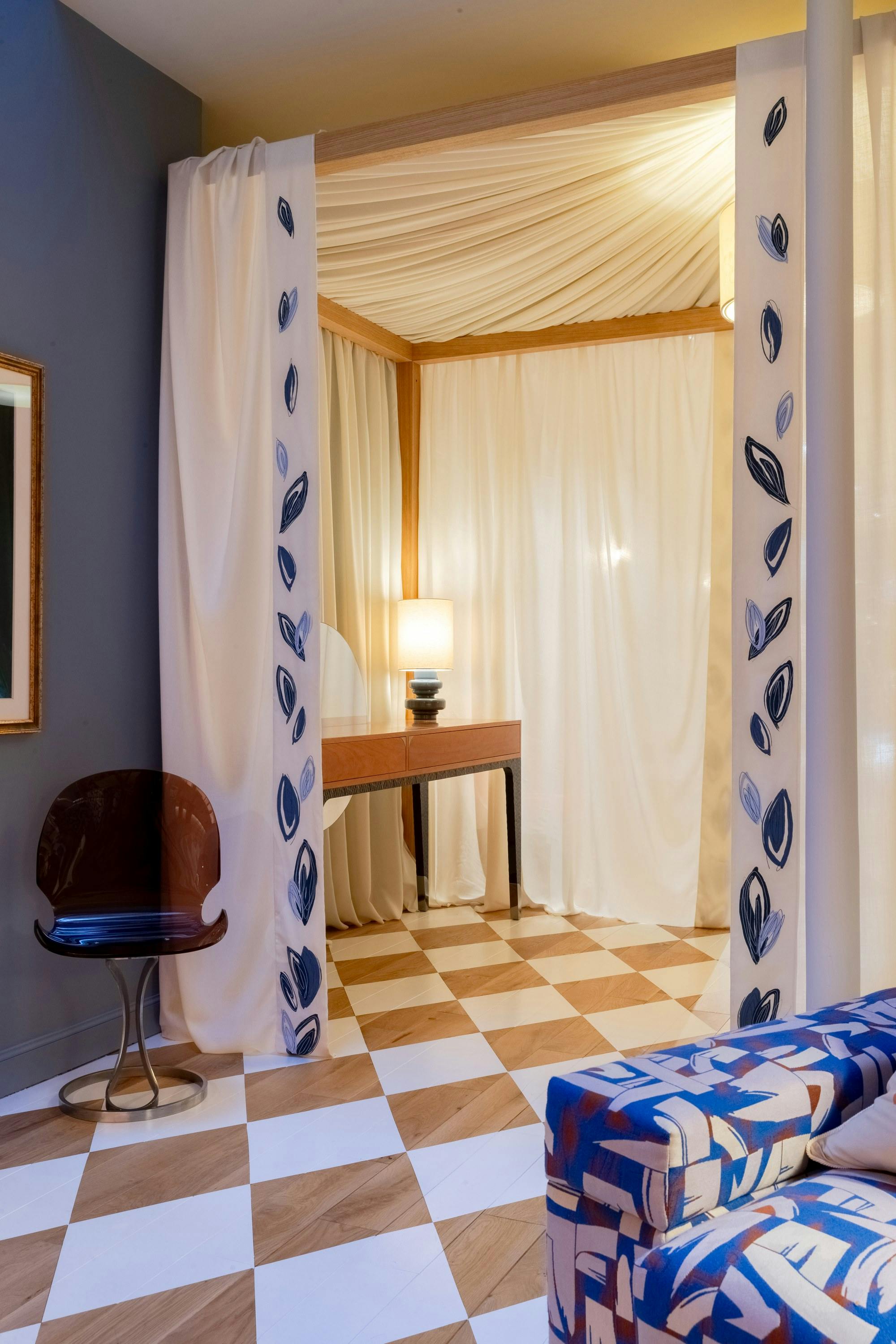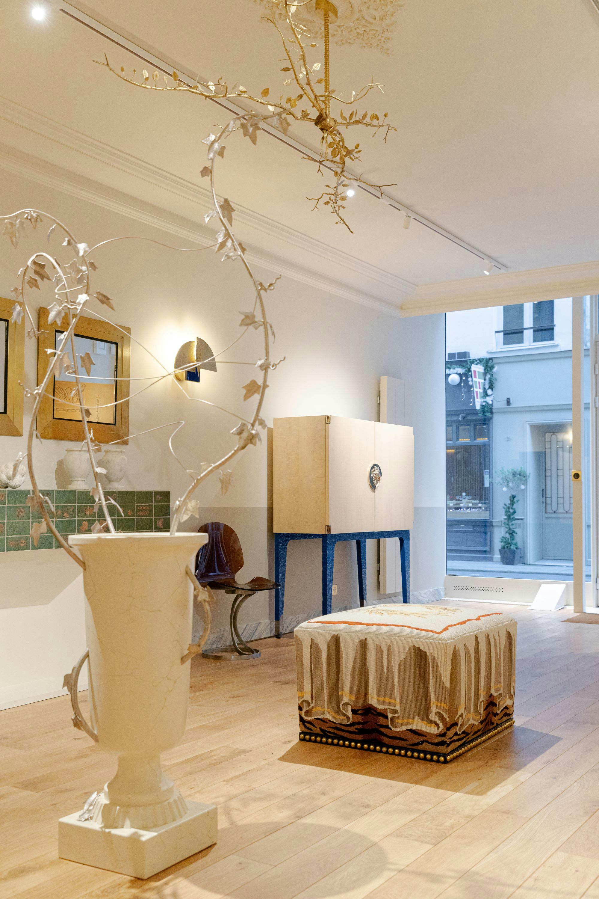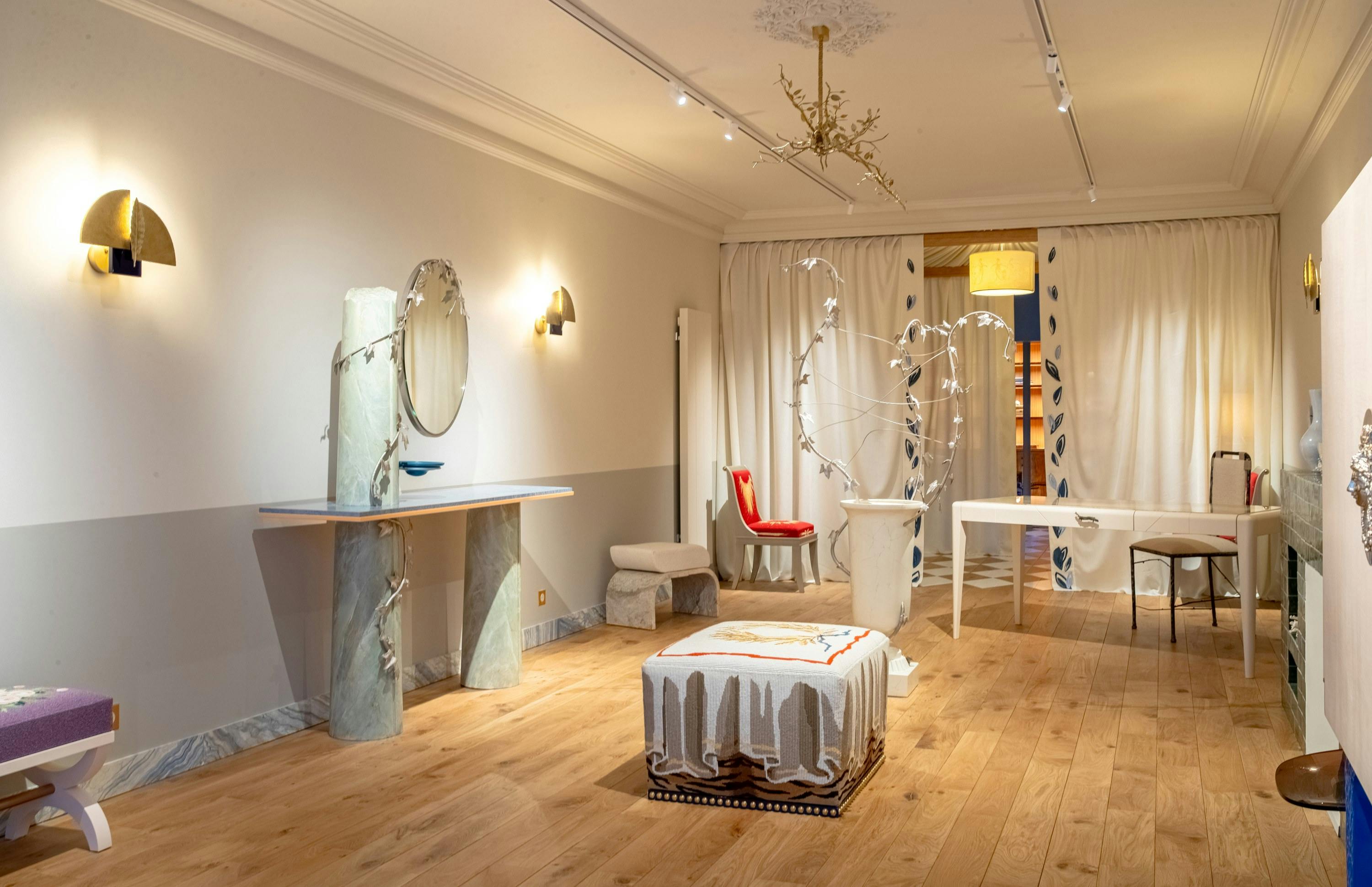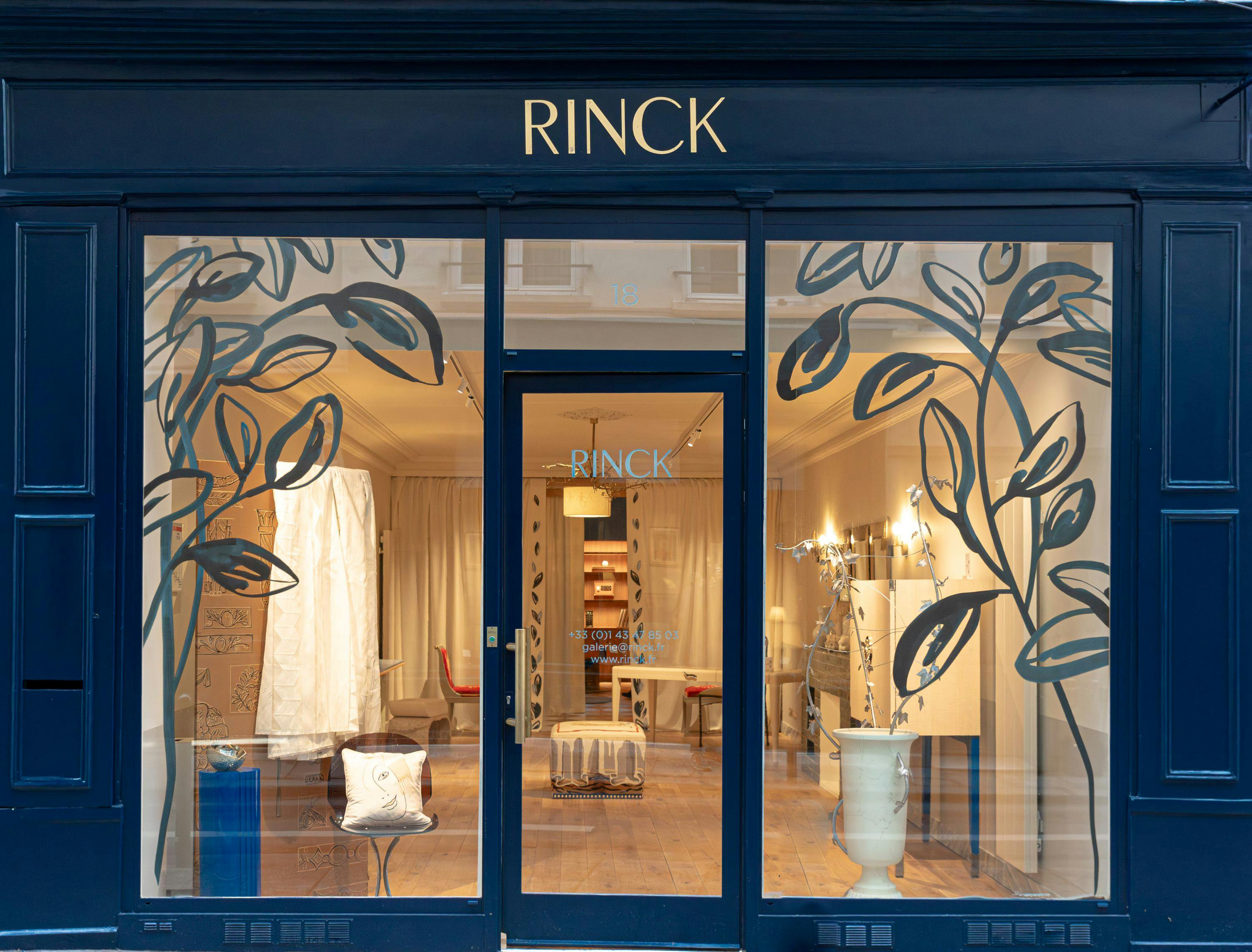 This elongated gallery is divided into three distinct spaces. First, an exhibit area showing you some of the creations released since 2020. Then a transitional space, a contemporary reimagining of the interior tents seen in the mid-20th century in so many prestigious apartments, from the Empire style to elite Paris and New York abodes. And, lastly, a private lounge bringing together the inspirations of Rinck creations from the Seventies, but also shades of Art Deco, with a gouged-wood boiserie bookcase featuring original period bronzes from the maker.