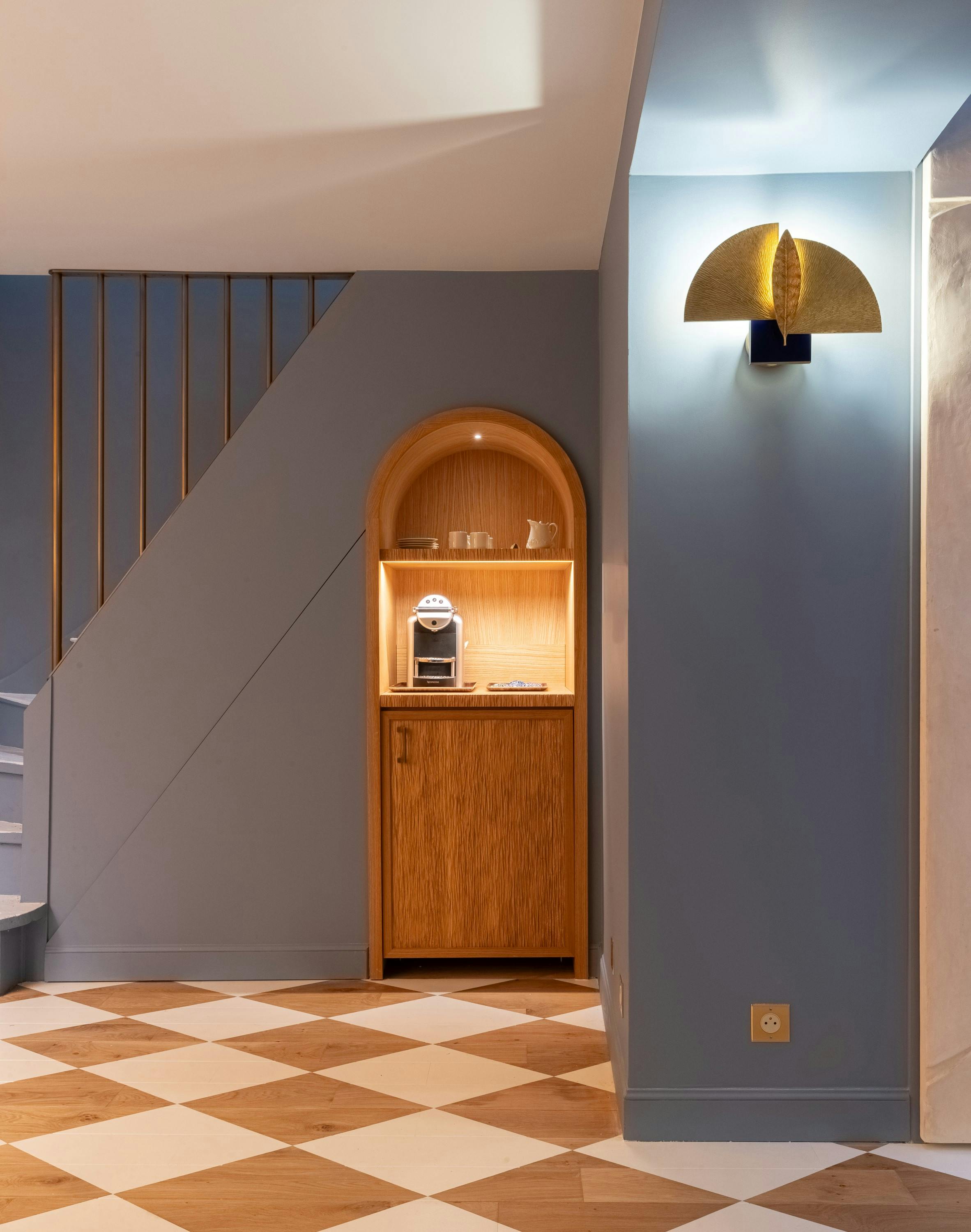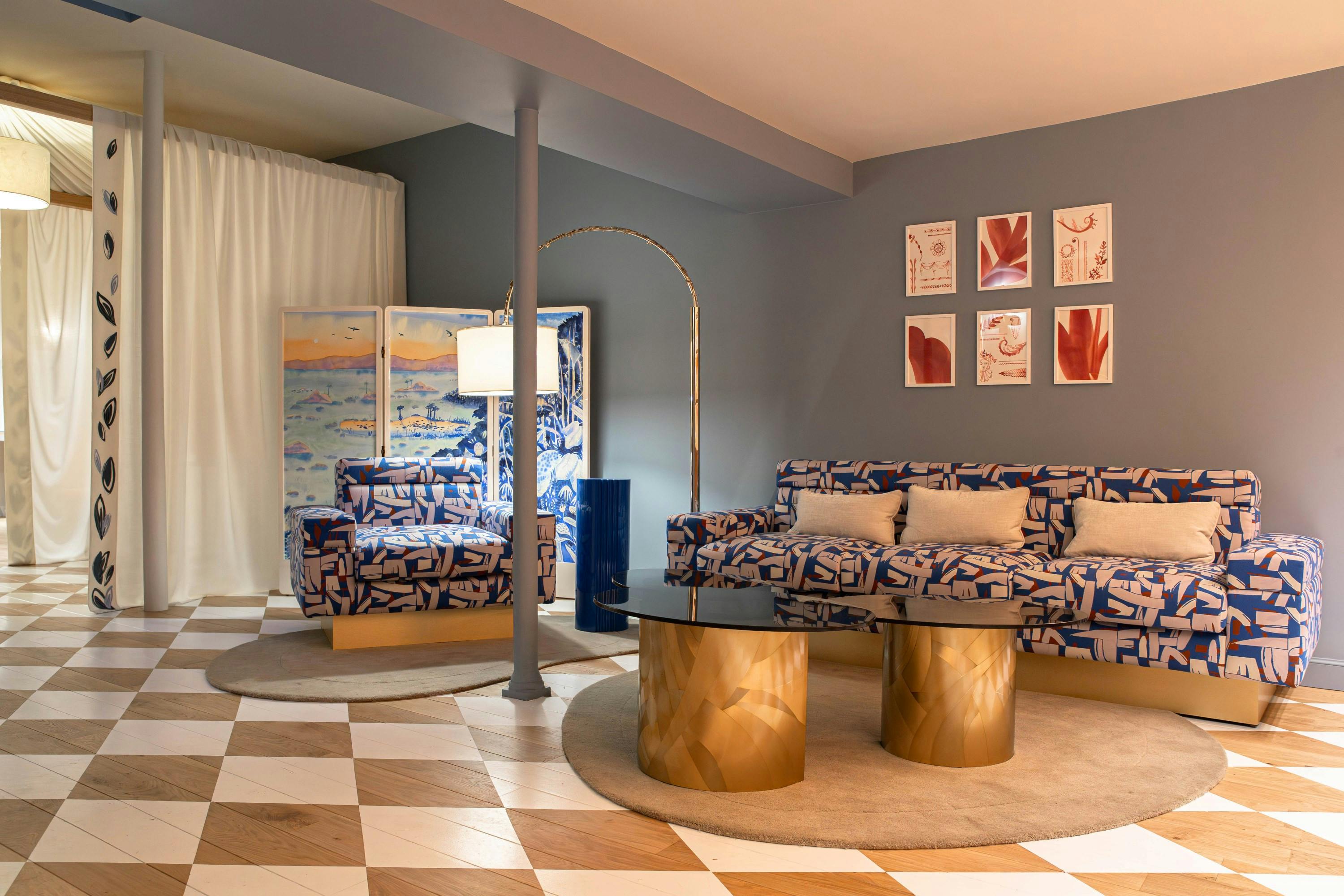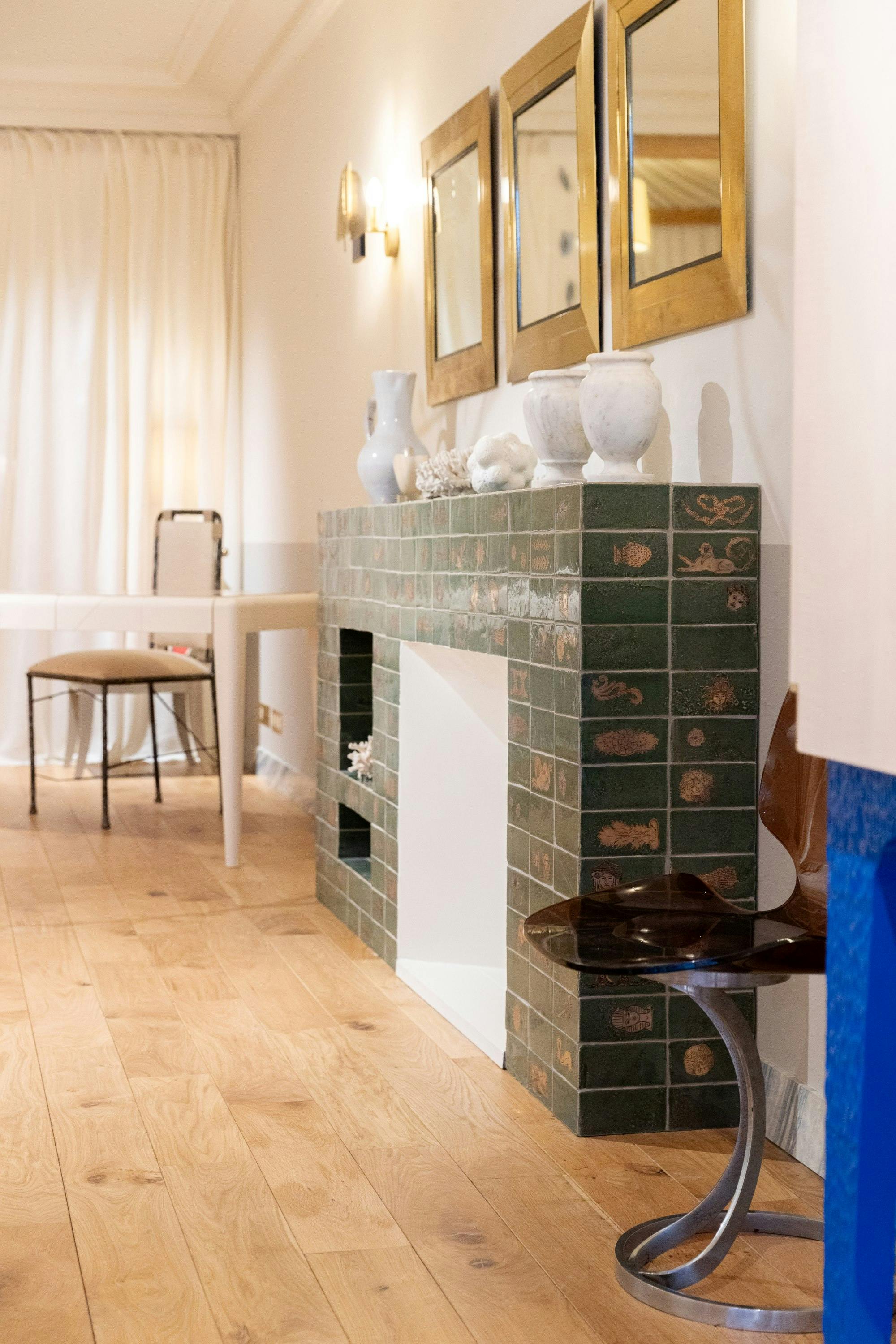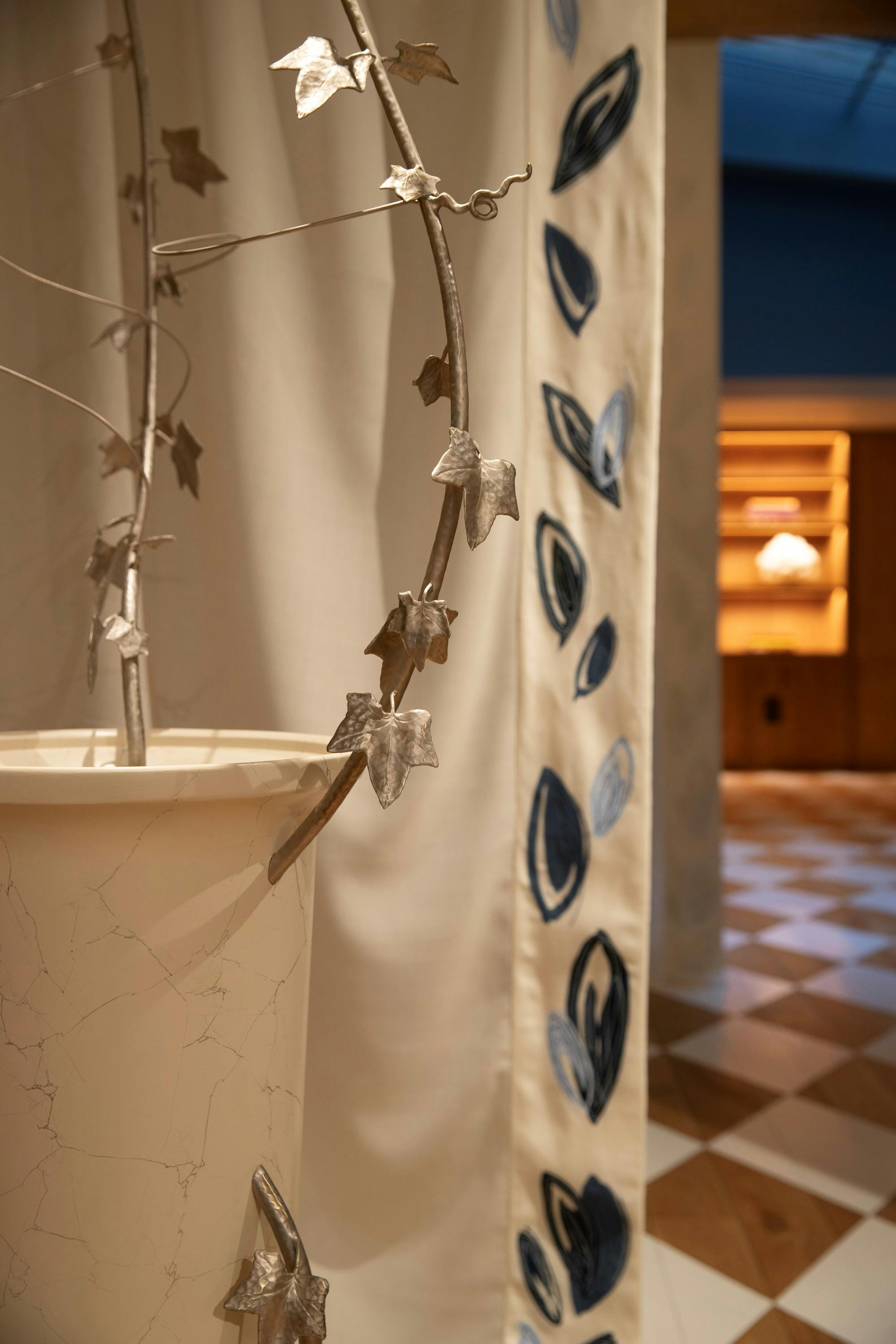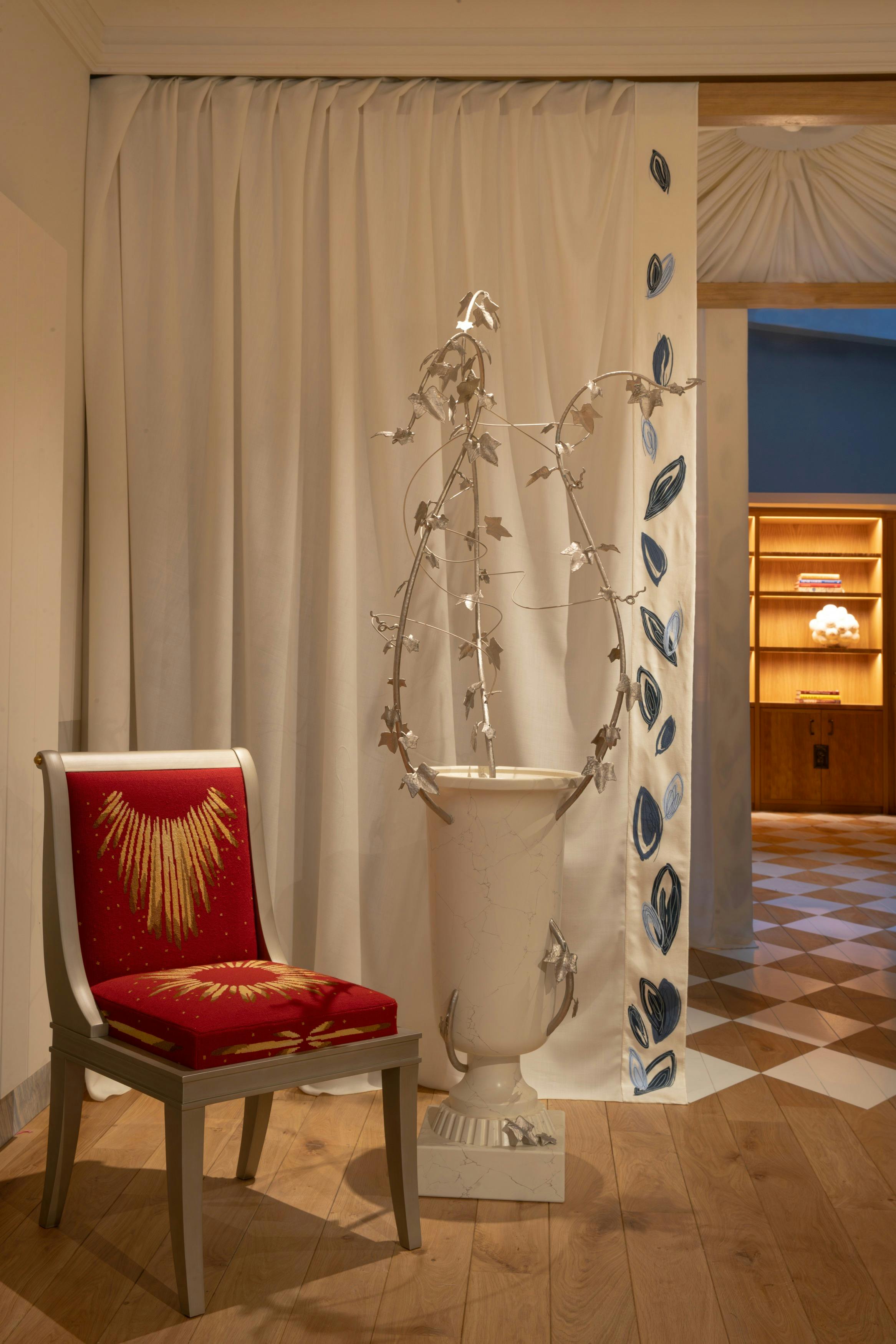 This elongated gallery is divided into three distinct spaces. First, an exhibit area showing you some of the creations released since 2020. Then a transitional space, a contemporary reimagining of the interior tents seen in the mid-20th century in so many prestigious apartments, from the Empire style to elite Paris and New York abodes. And, lastly, a private lounge bringing together the inspirations of Rinck creations from the Seventies, but also shades of Art Deco, with a gouged-wood boiserie bookcase featuring original period bronzes from the maker.