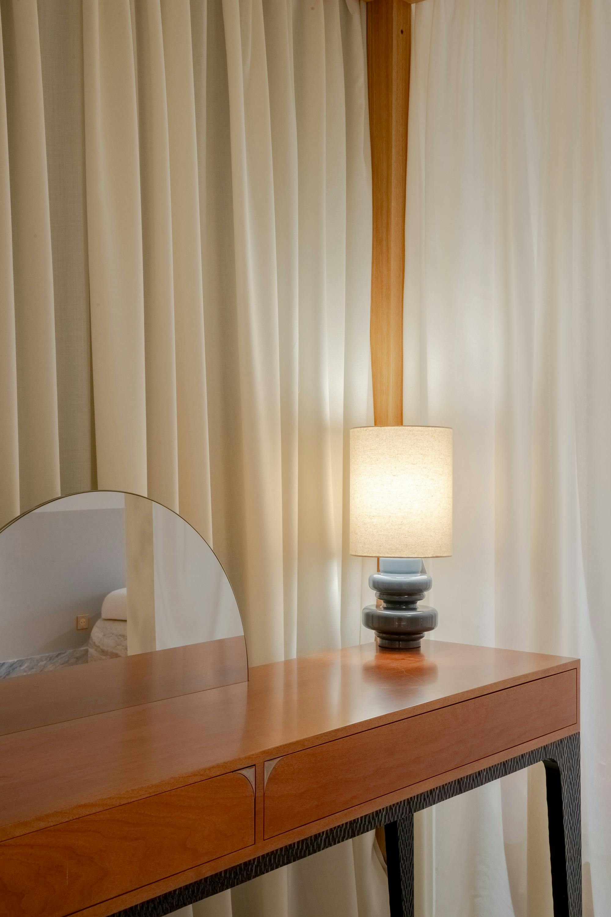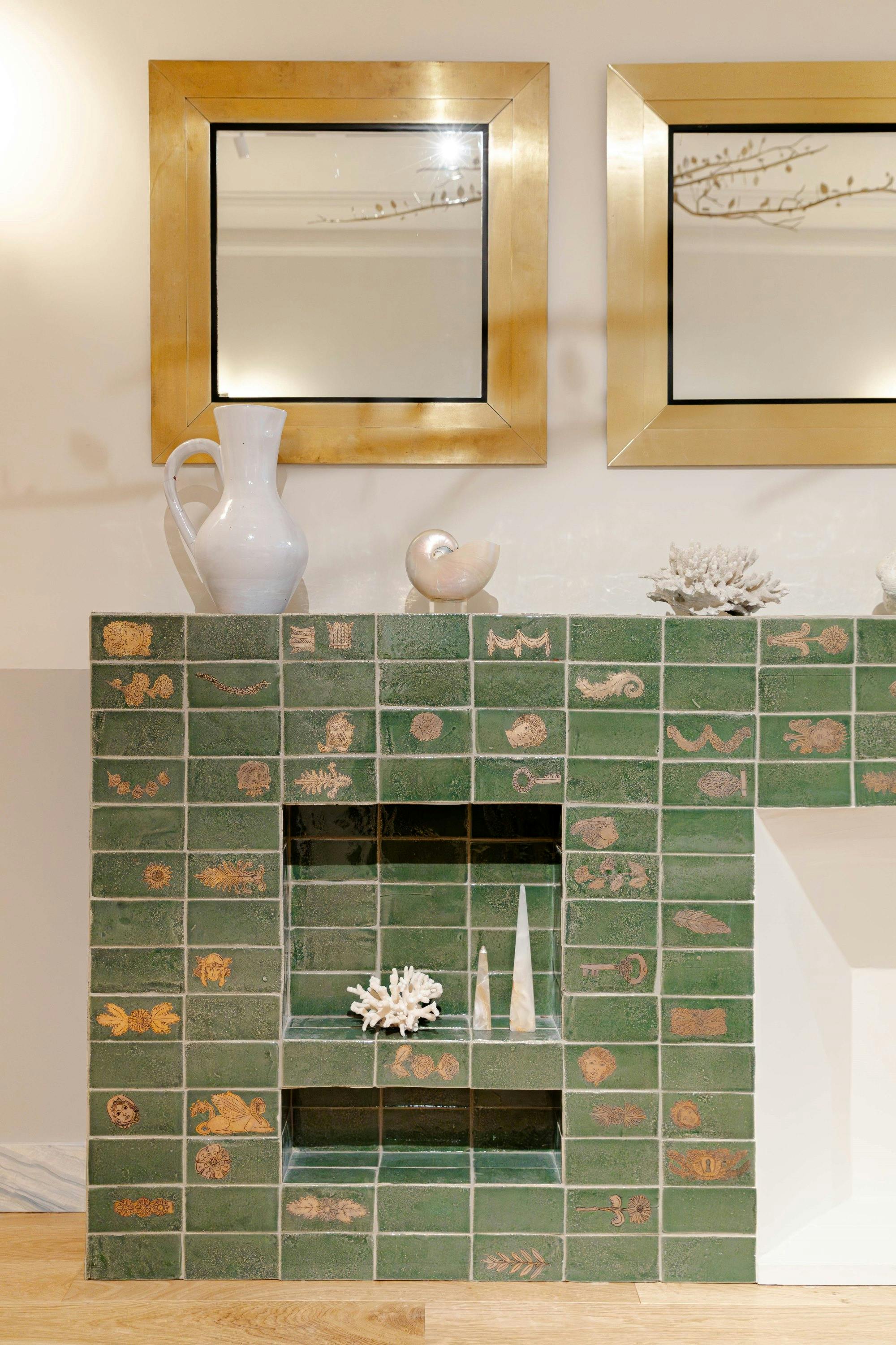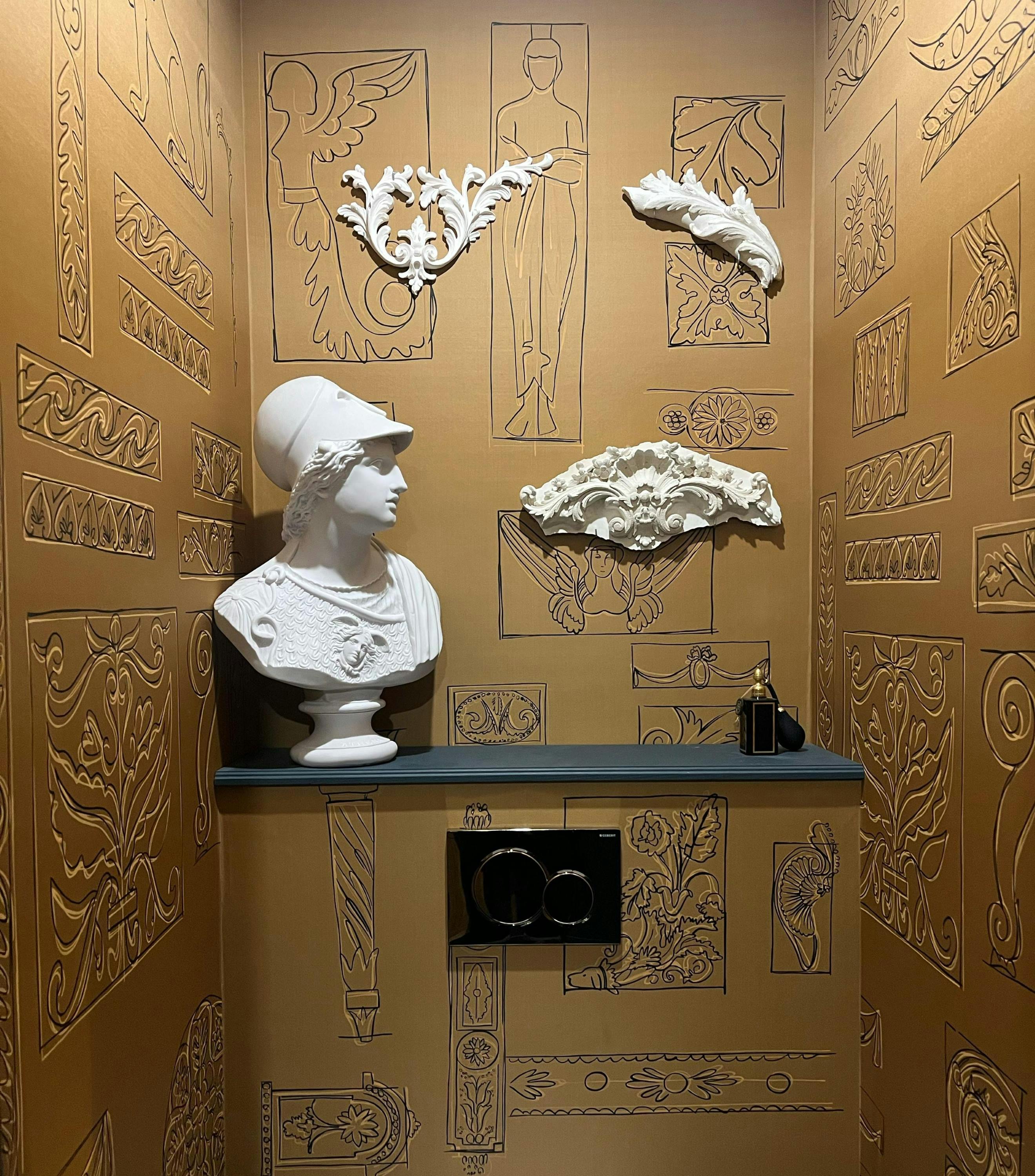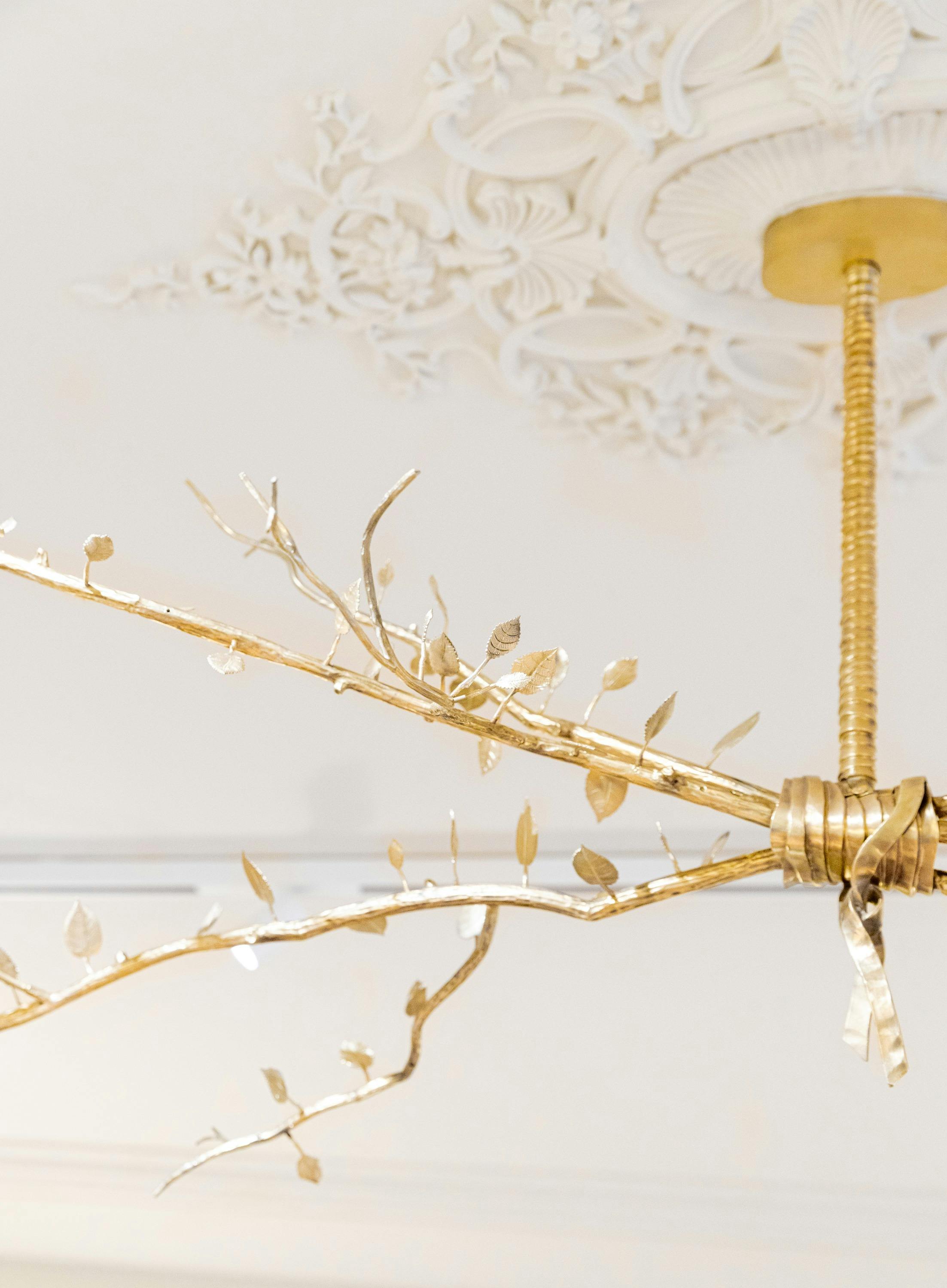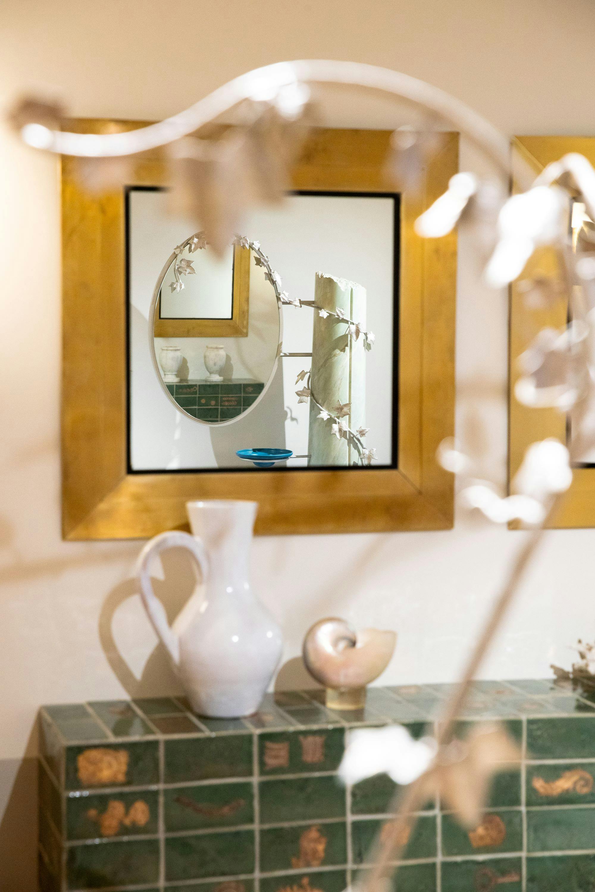 This elongated gallery is divided into three distinct spaces. First, an exhibit area showing you some of the creations released since 2020. Then a transitional space, a contemporary reimagining of the interior tents seen in the mid-20th century in so many prestigious apartments, from the Empire style to elite Paris and New York abodes. And, lastly, a private lounge bringing together the inspirations of Rinck creations from the Seventies, but also shades of Art Deco, with a gouged-wood boiserie bookcase featuring original period bronzes from the maker.