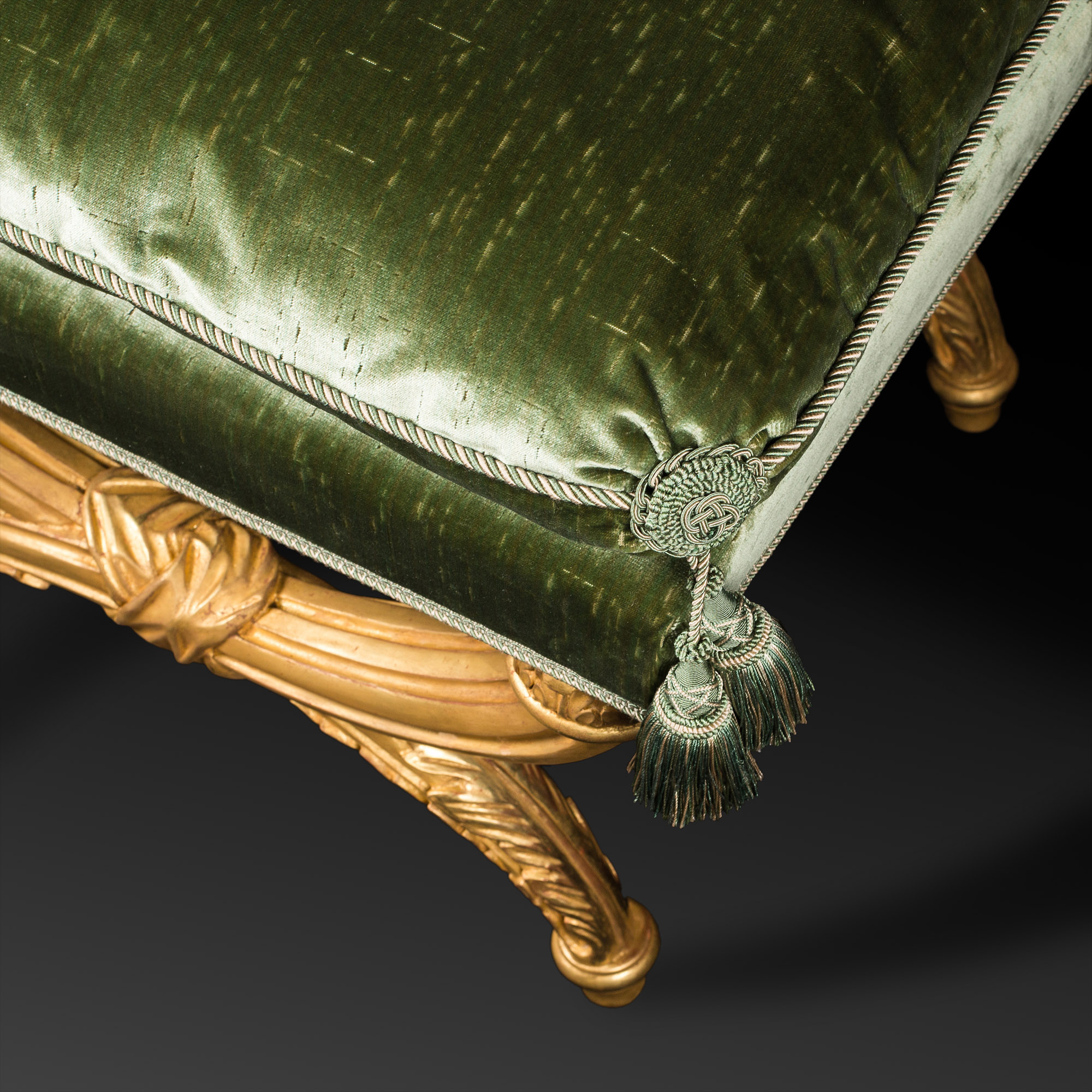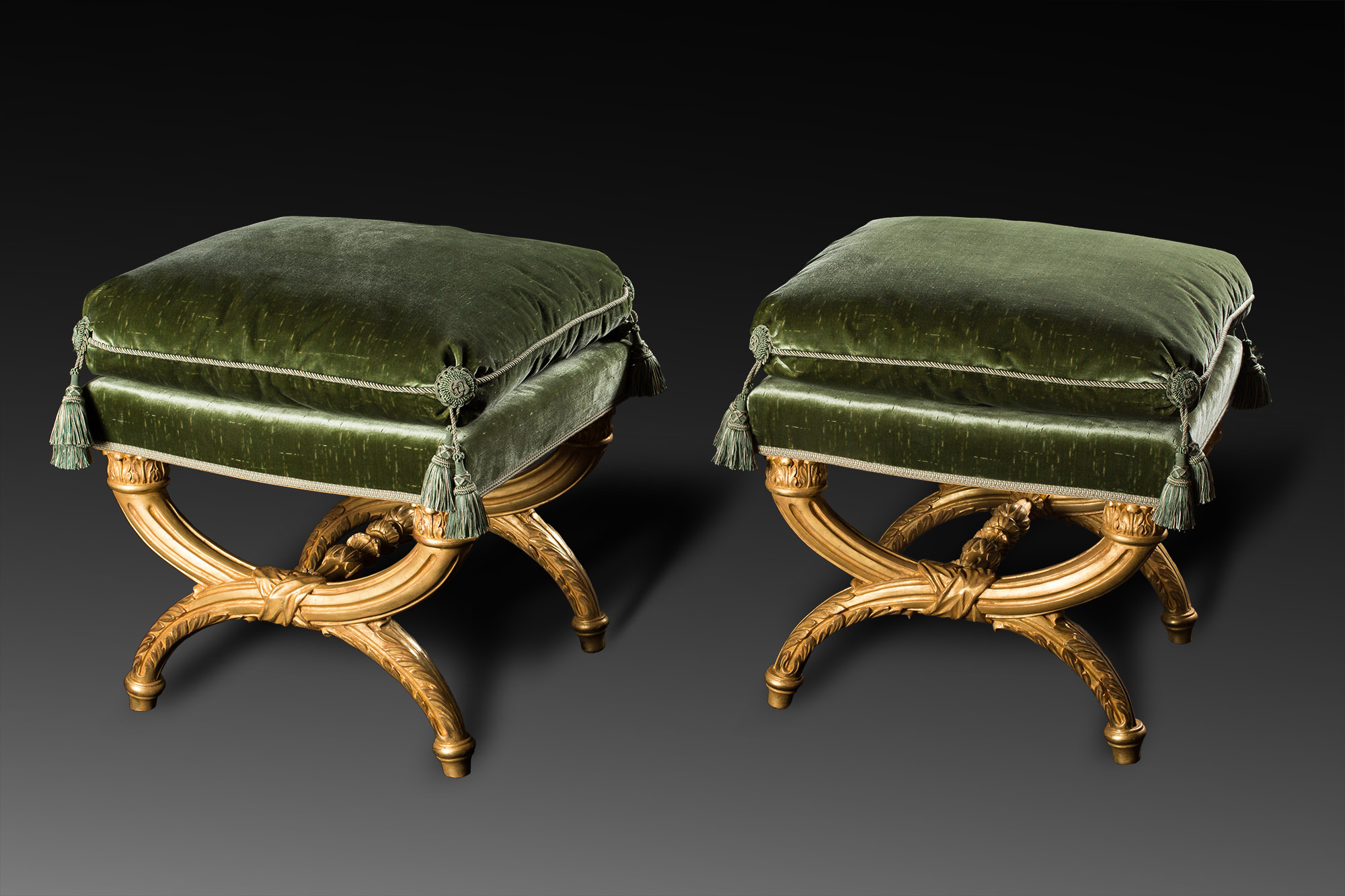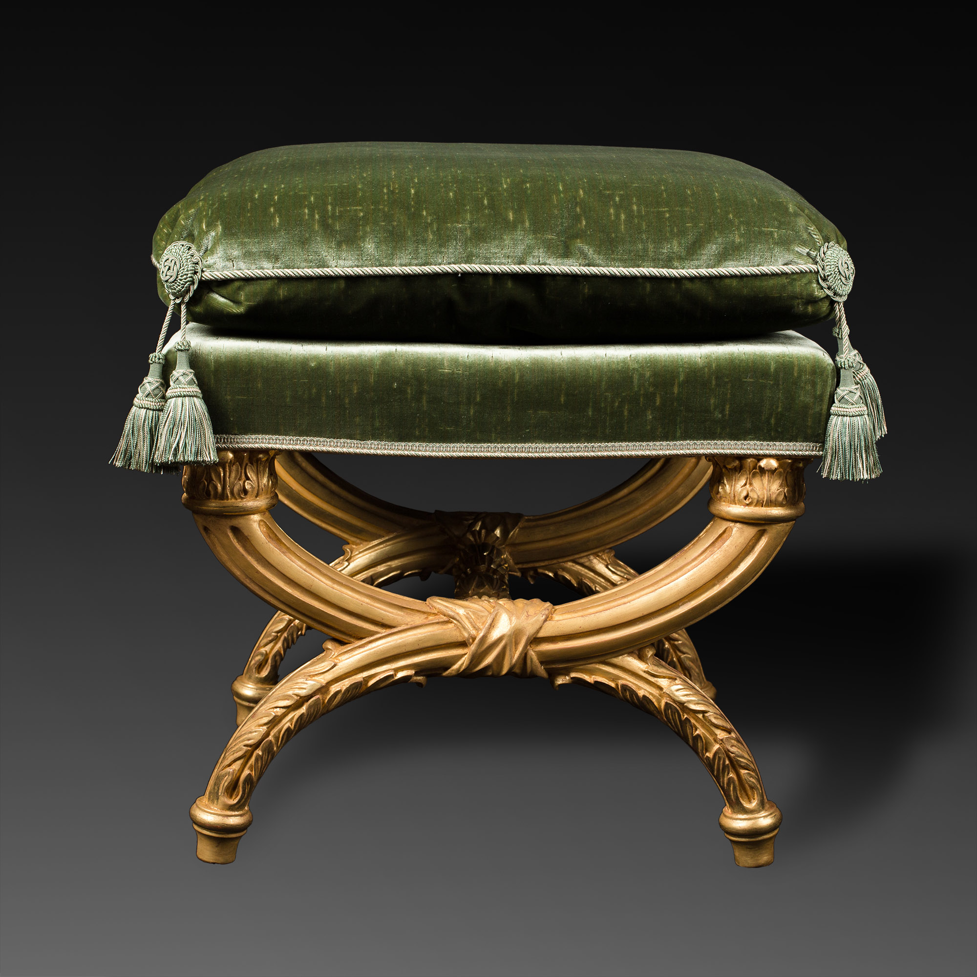 Ottoman in carved gilded wood, upholstery cushion and passementerie.