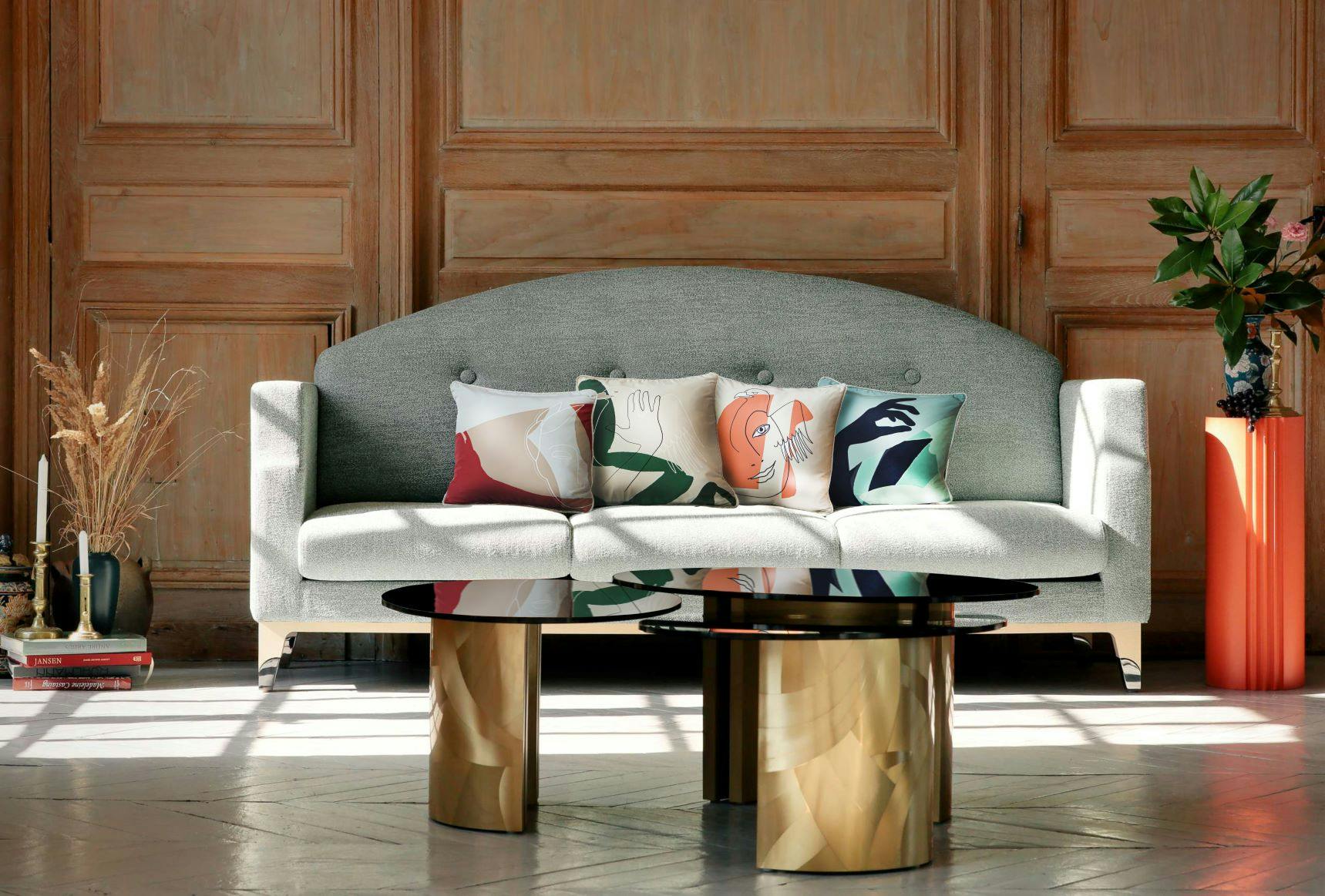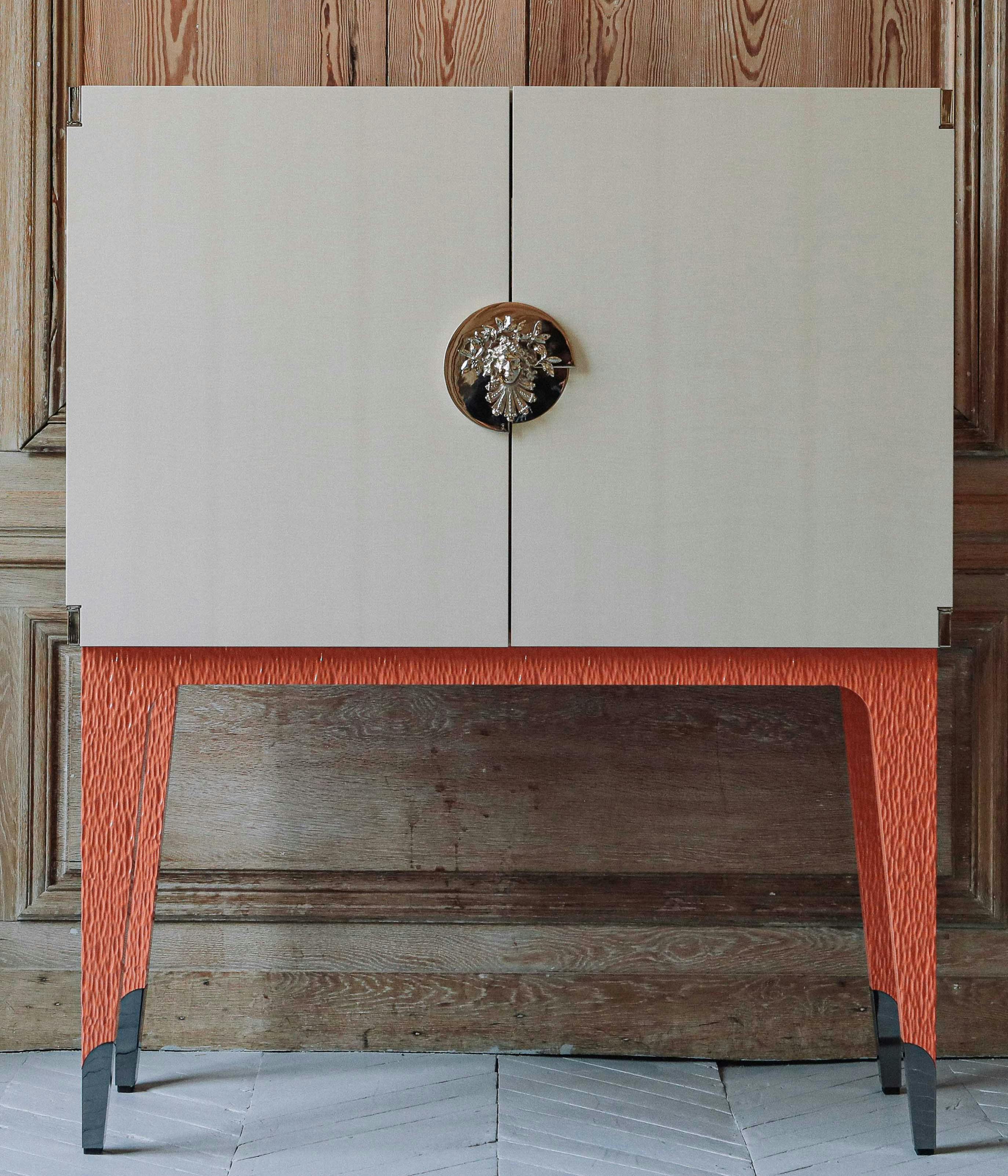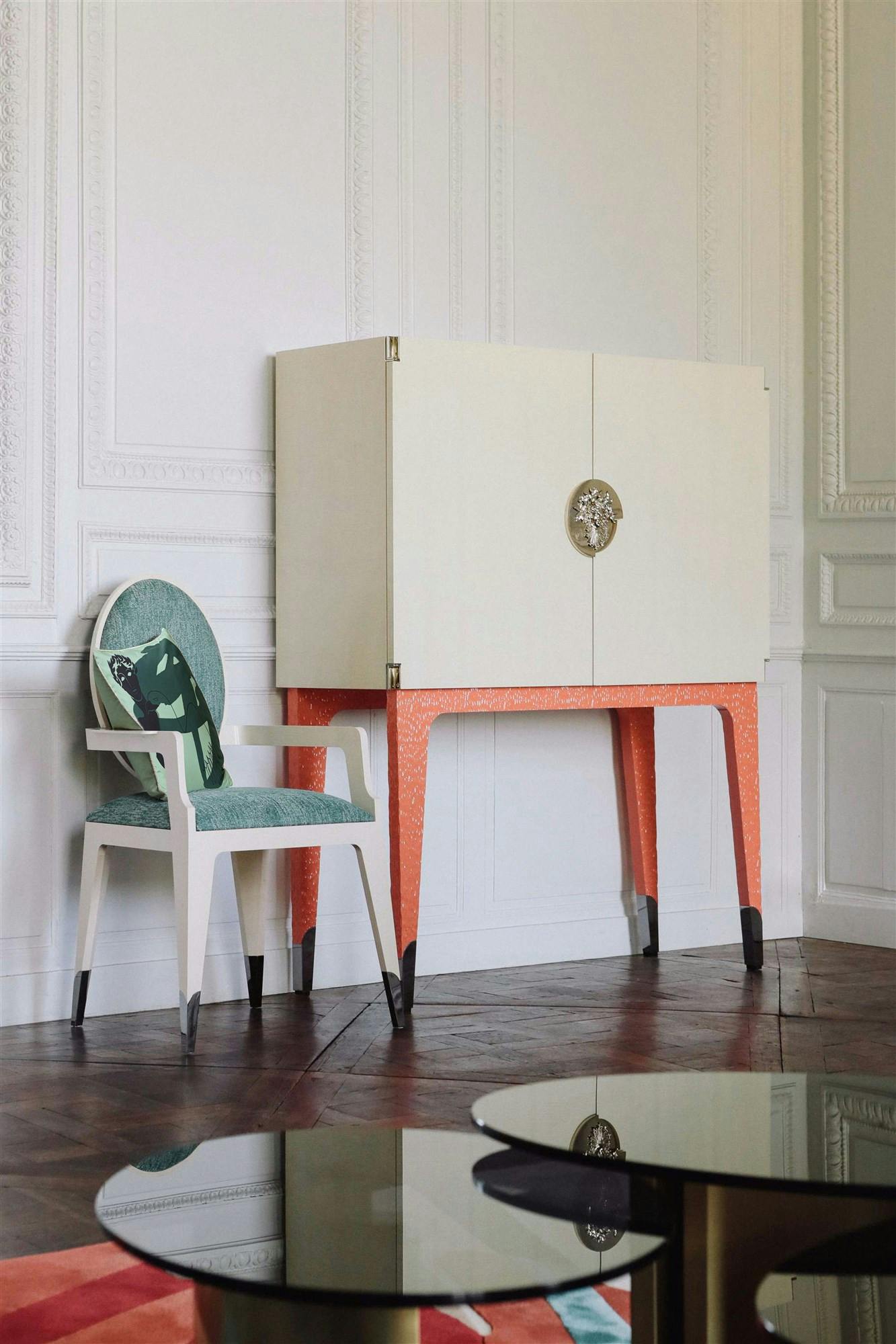 Rinck introduces Hébé: an hedonistic and feminine vision of the smoking room. The ensemble includes a liquor cabinet, a sofa and an armchair, a game table and accompanying chairs, a rug, coffee tables, accent cushions, a floor lamp, an end table, an ashtray, and also a cigar humidor or its jewelry box version.