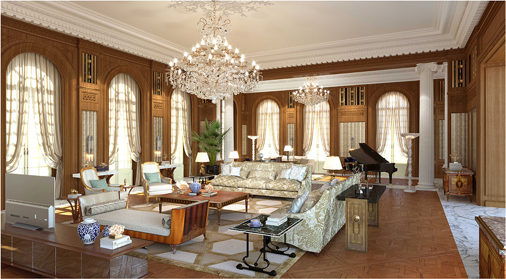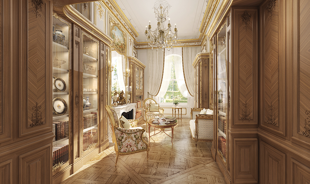 Études d’architecture Intérieure pour la rénovation d’une villa de 3000 m2 en style classique français avec des inspirations modernes dans le traitement des détails et des matériaux.