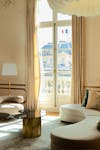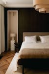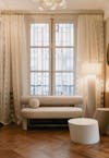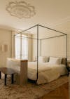 Les signes du lieu étaient là : parquet en point de Hongrie, cheminées en marbre, moulures, corniches, détails de bronze ciselé. Ils ont été préservés. Plutôt que de s’opposer à ces signes du lieu, le projet a préféré le dialogue : un vocabulaire contemporain, calme, dominé par le noyer de fil, le frêne, le chêne blanchi, des vernis satinés, des tonalités douces. Un mobilier volontairement minimal, pensé en retrait, laisse respirer les volumes.