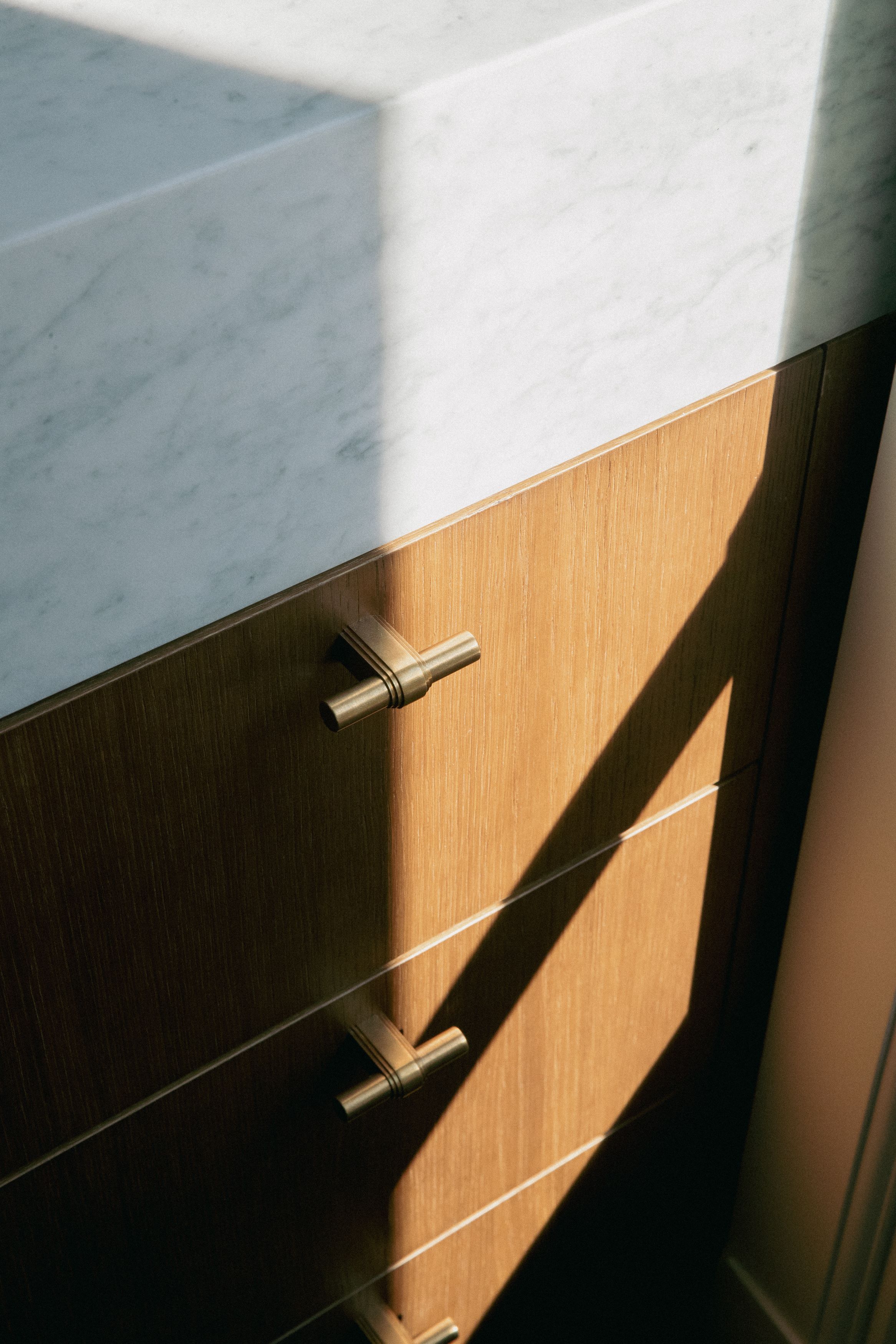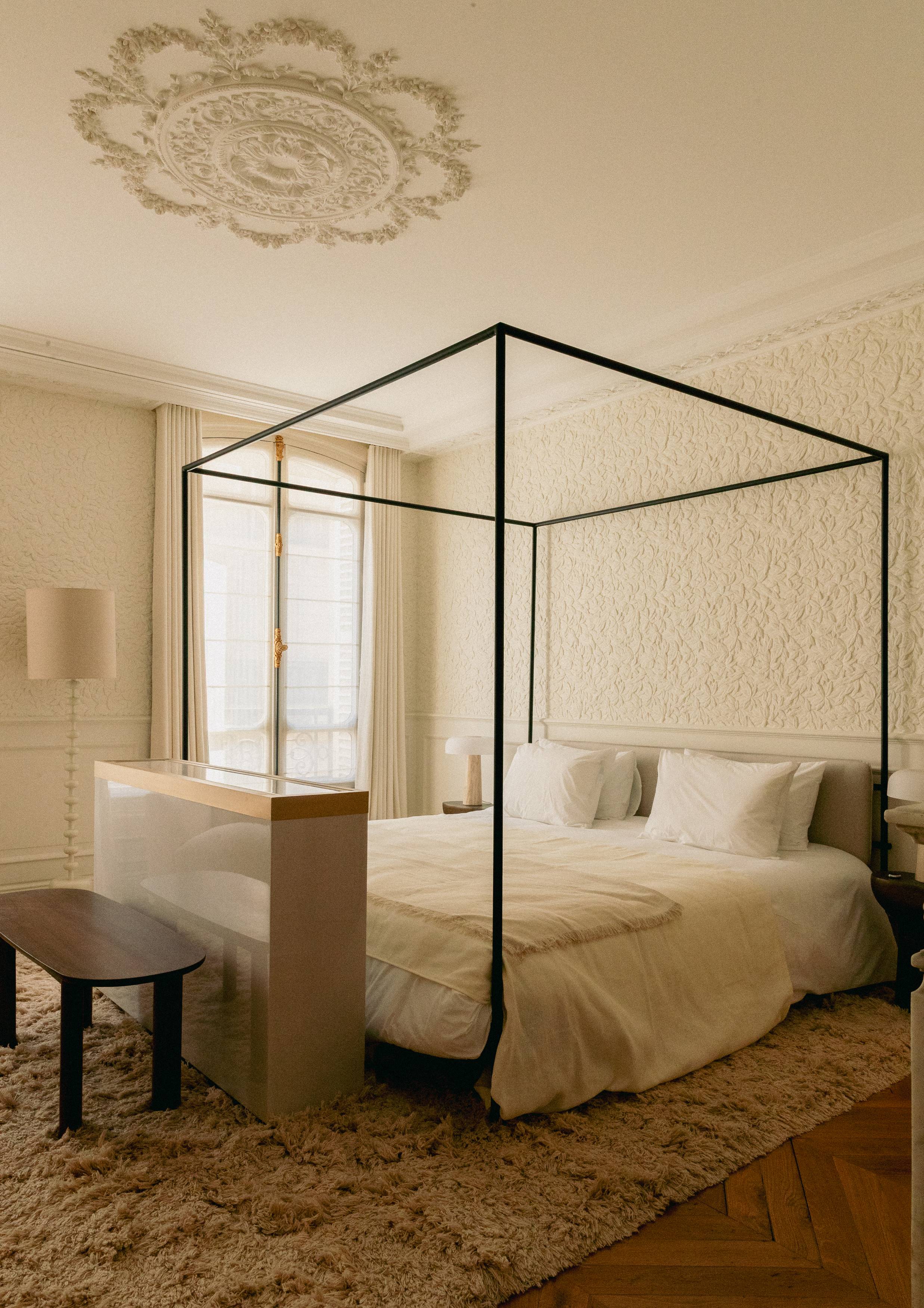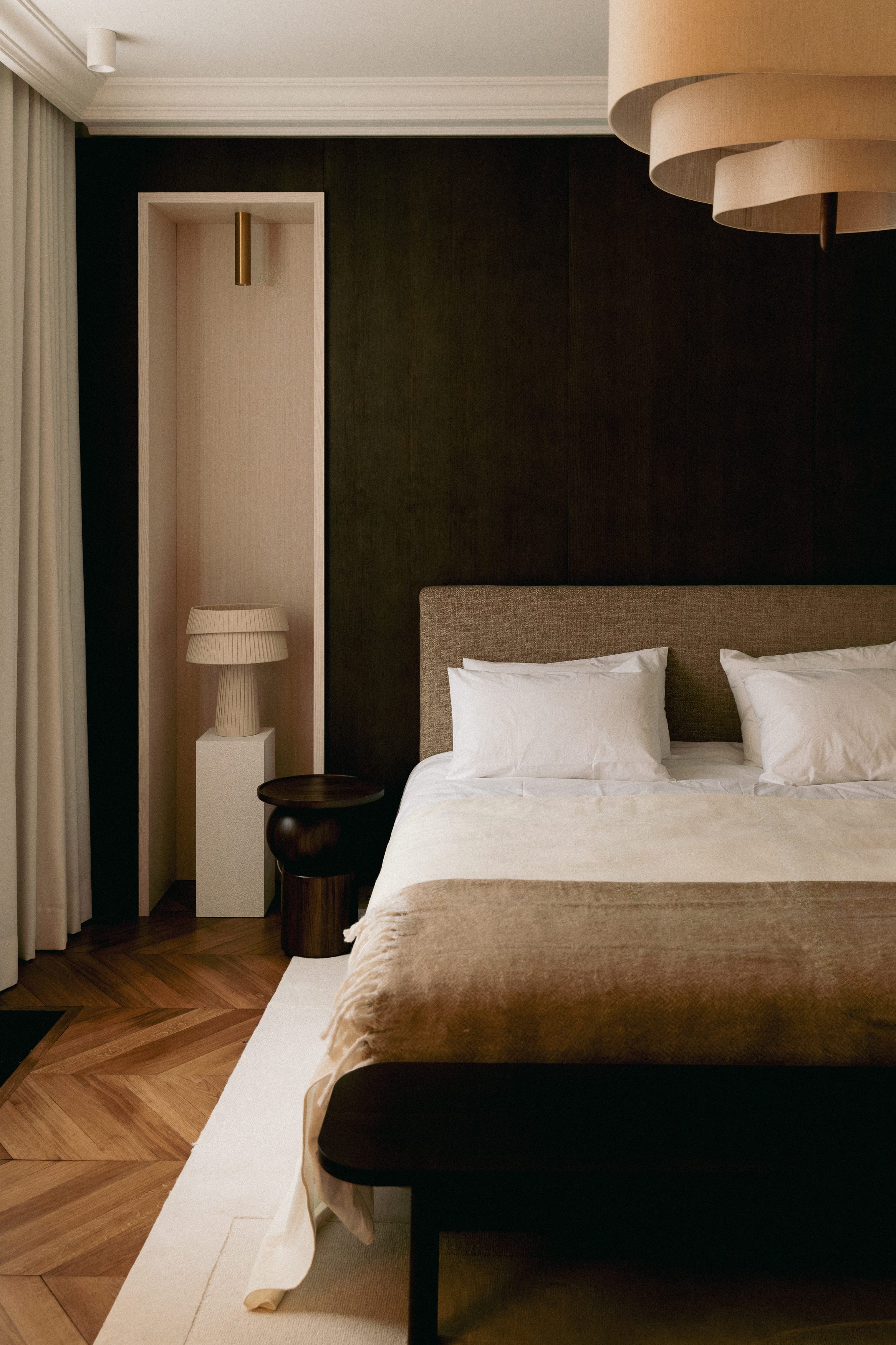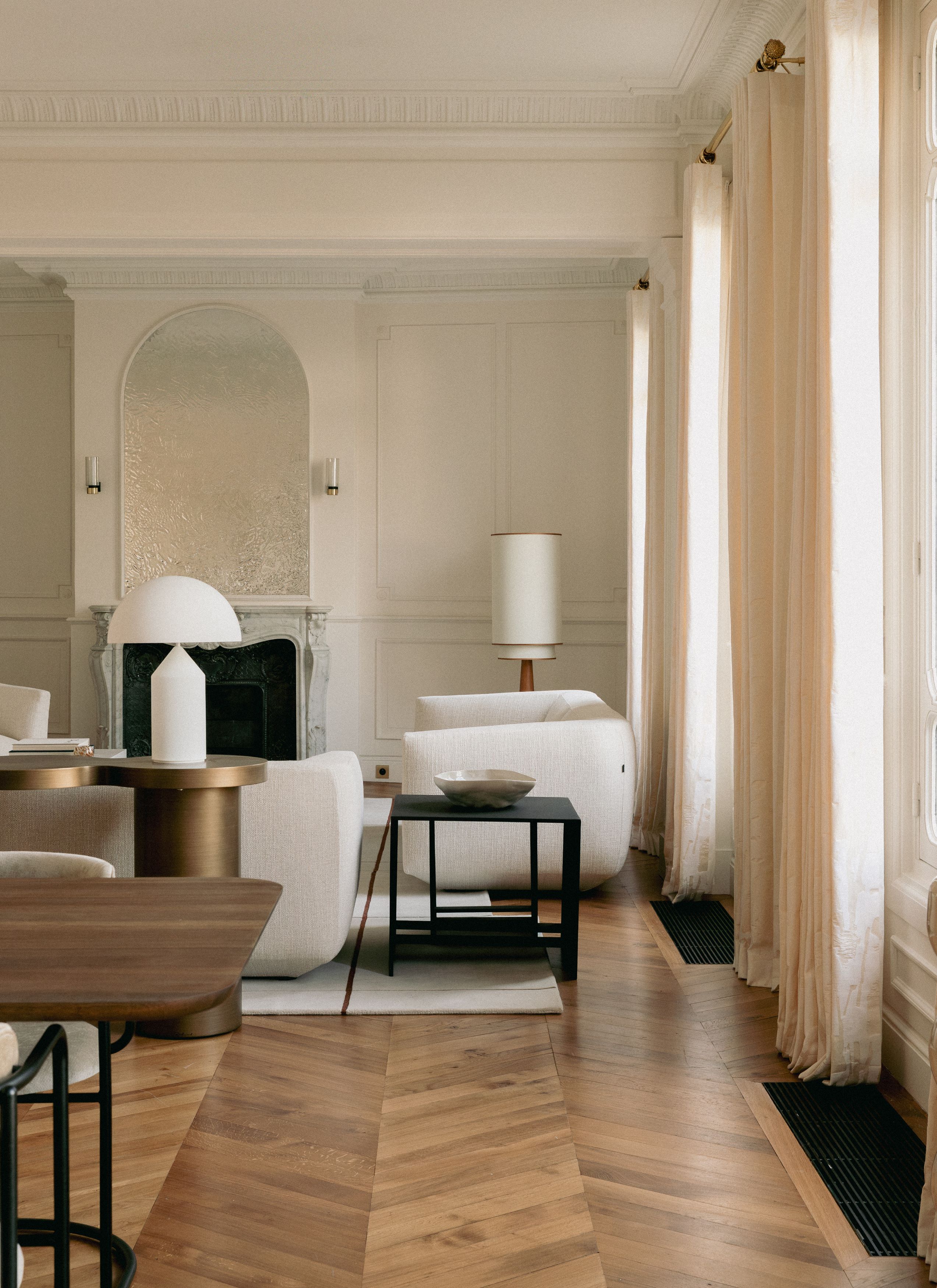 Les signes du lieu étaient là : parquet en point de Hongrie, cheminées en marbre, moulures, corniches, détails de bronze ciselé. Ils ont été préservés. Plutôt que de s’opposer à ces signes du lieu, le projet a préféré le dialogue : un vocabulaire contemporain, calme, dominé par le noyer de fil, le frêne, le chêne blanchi, des vernis satinés, des tonalités douces. Un mobilier volontairement minimal, pensé en retrait, laisse respirer les volumes.