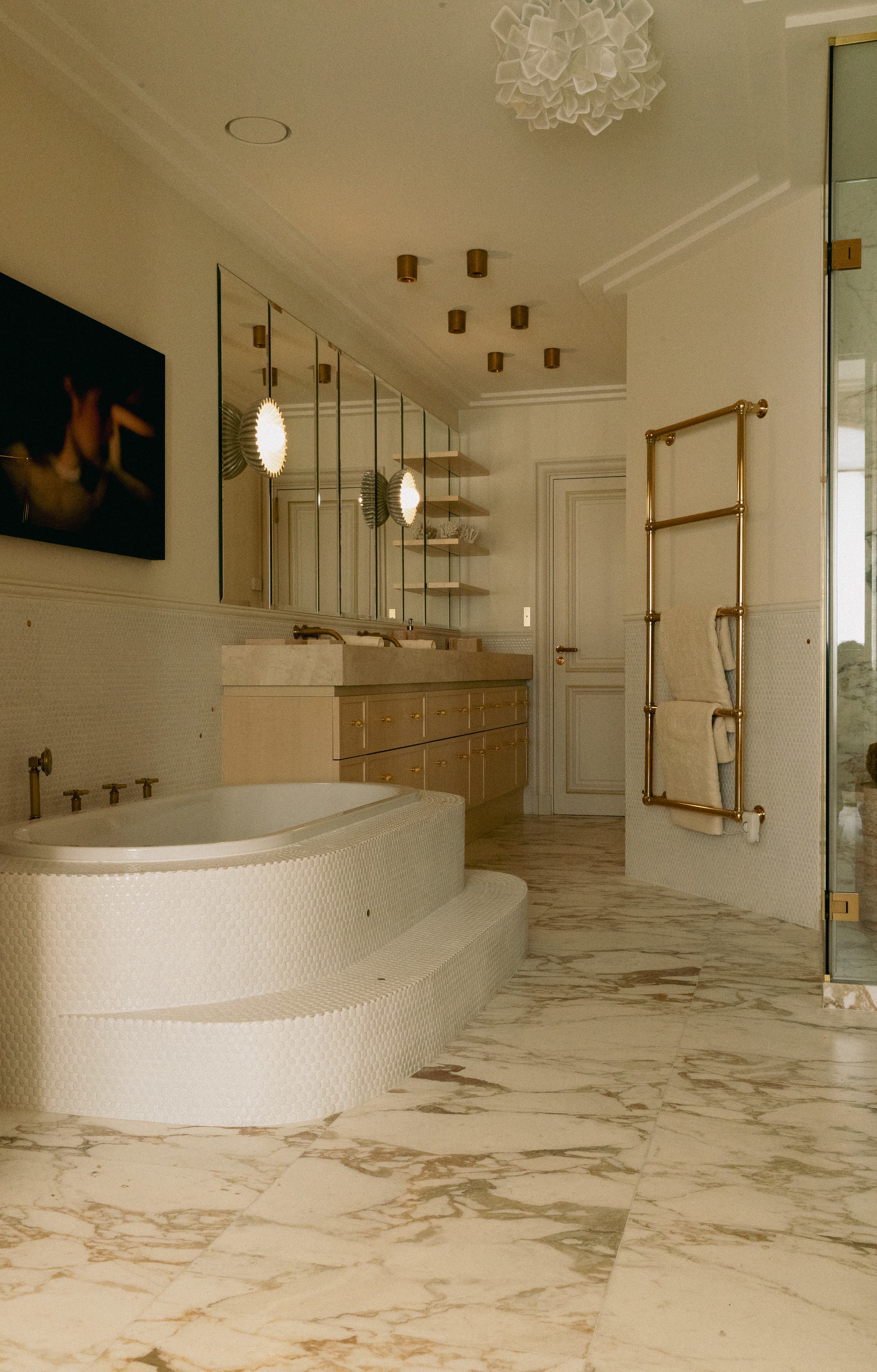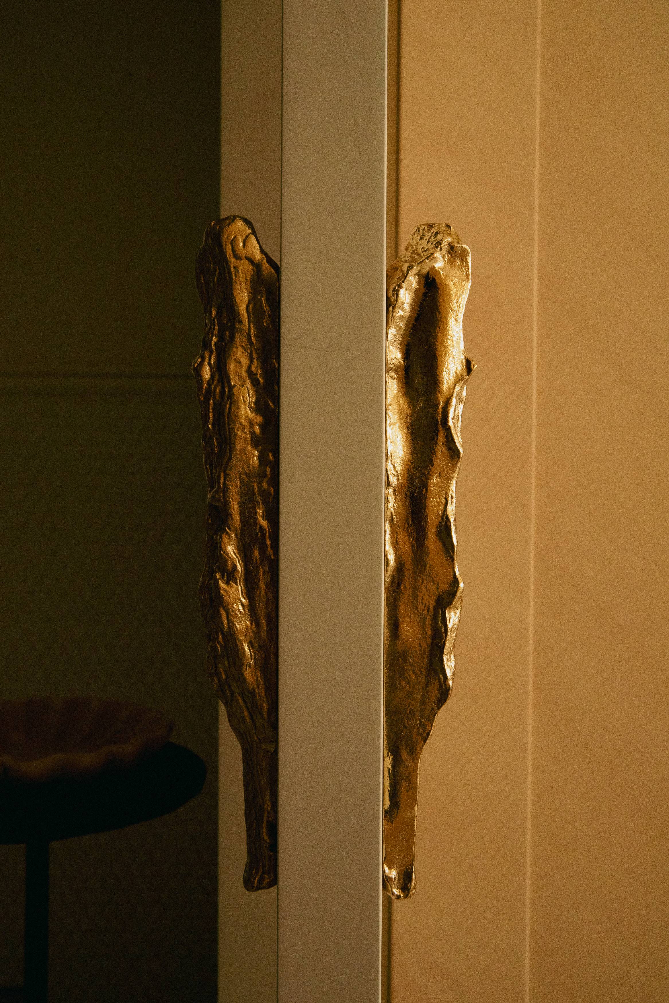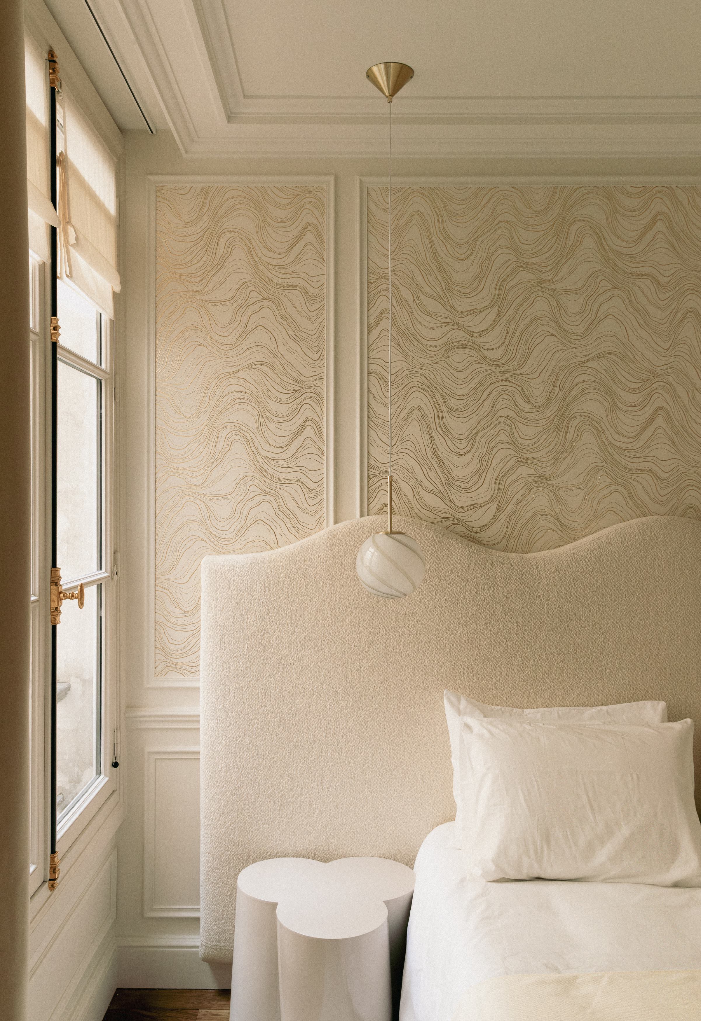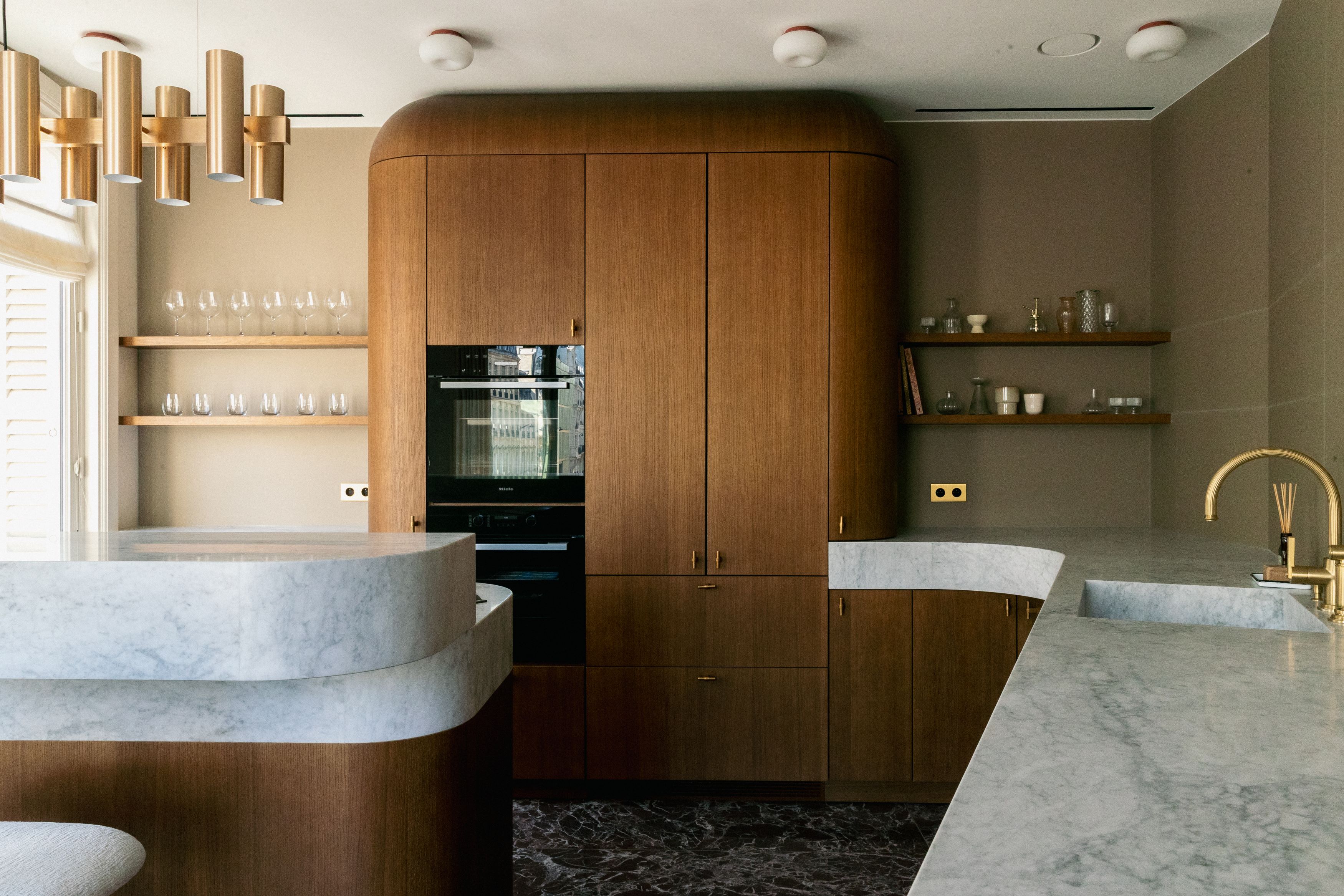 Les signes du lieu étaient là : parquet en point de Hongrie, cheminées en marbre, moulures, corniches, détails de bronze ciselé. Ils ont été préservés. Plutôt que de s’opposer à ces signes du lieu, le projet a préféré le dialogue : un vocabulaire contemporain, calme, dominé par le noyer de fil, le frêne, le chêne blanchi, des vernis satinés, des tonalités douces. Un mobilier volontairement minimal, pensé en retrait, laisse respirer les volumes.