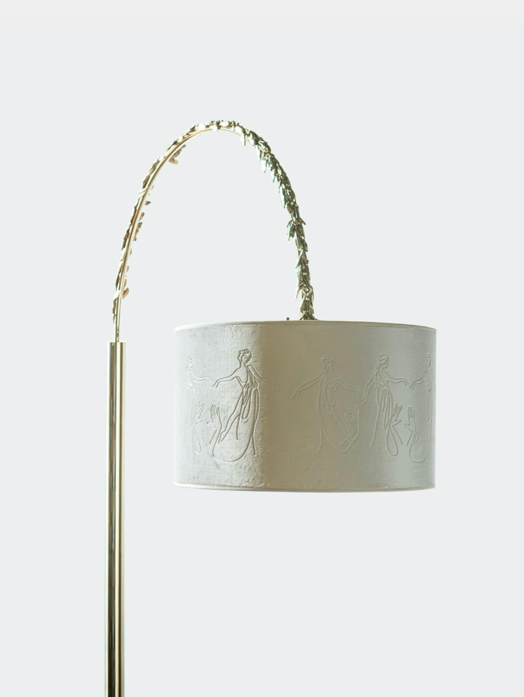Véritable pièce d’orfèvrerie, le lampadaire voit sa base recouverte d’une longue branche de myrte, plante symbole de la déesse Hébé, et un abat-jour représentant les muses dansantes, compagnes de la divinité. Une pièce d’exception offrant une lumière douce et pleine de détails ciselés.