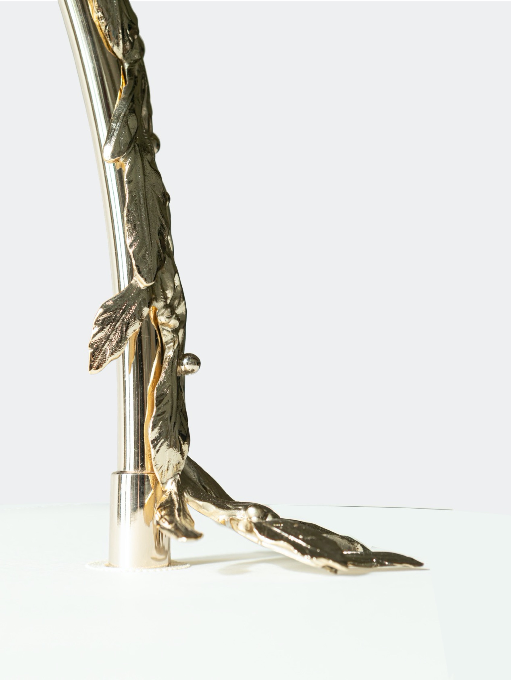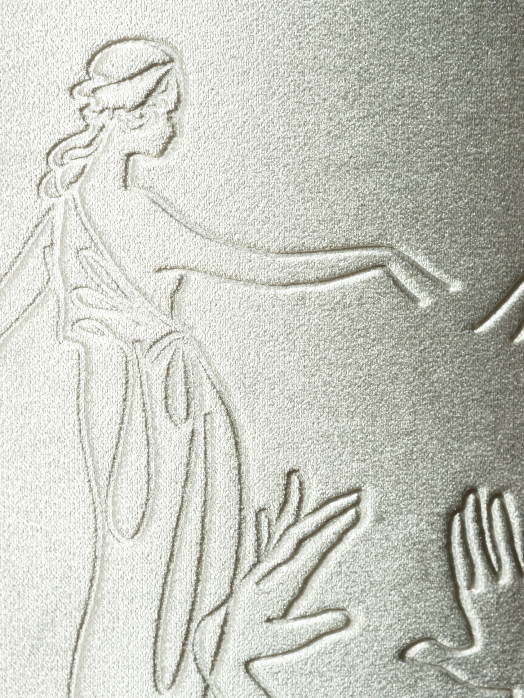 Véritable pièce d’orfèvrerie, le lampadaire voit sa base recouverte d’une longue branche de myrte, plante symbole de la déesse Hébé, et un abat-jour représentant les muses dansantes, compagnes de la divinité. Une pièce d’exception offrant une lumière douce et pleine de détails ciselés.