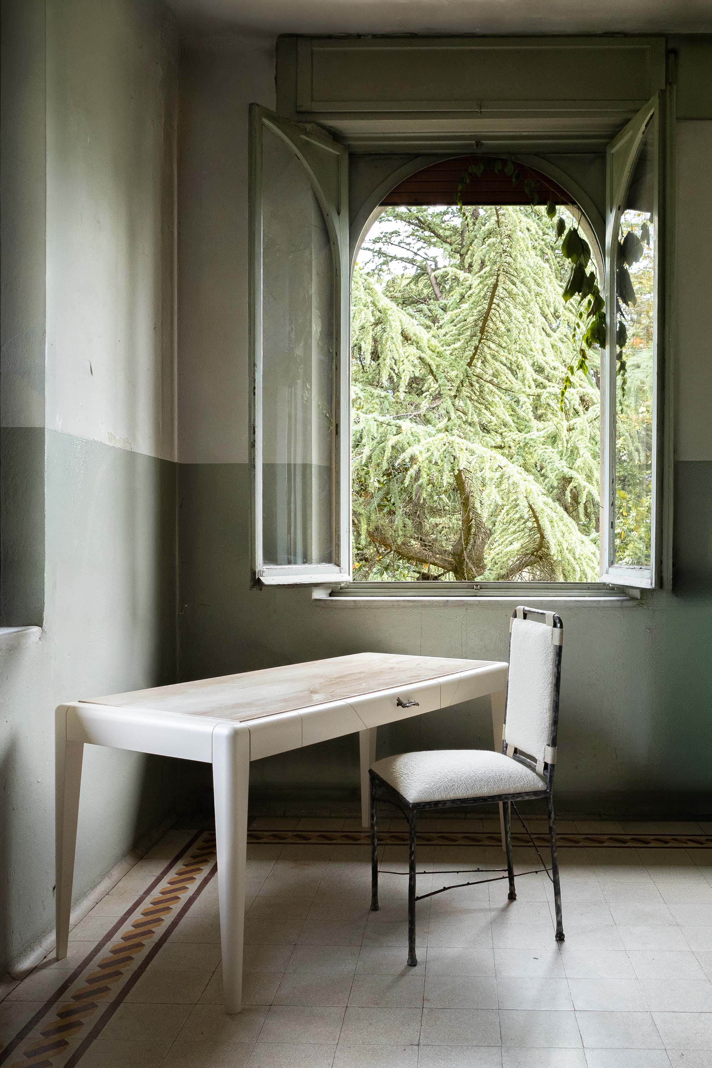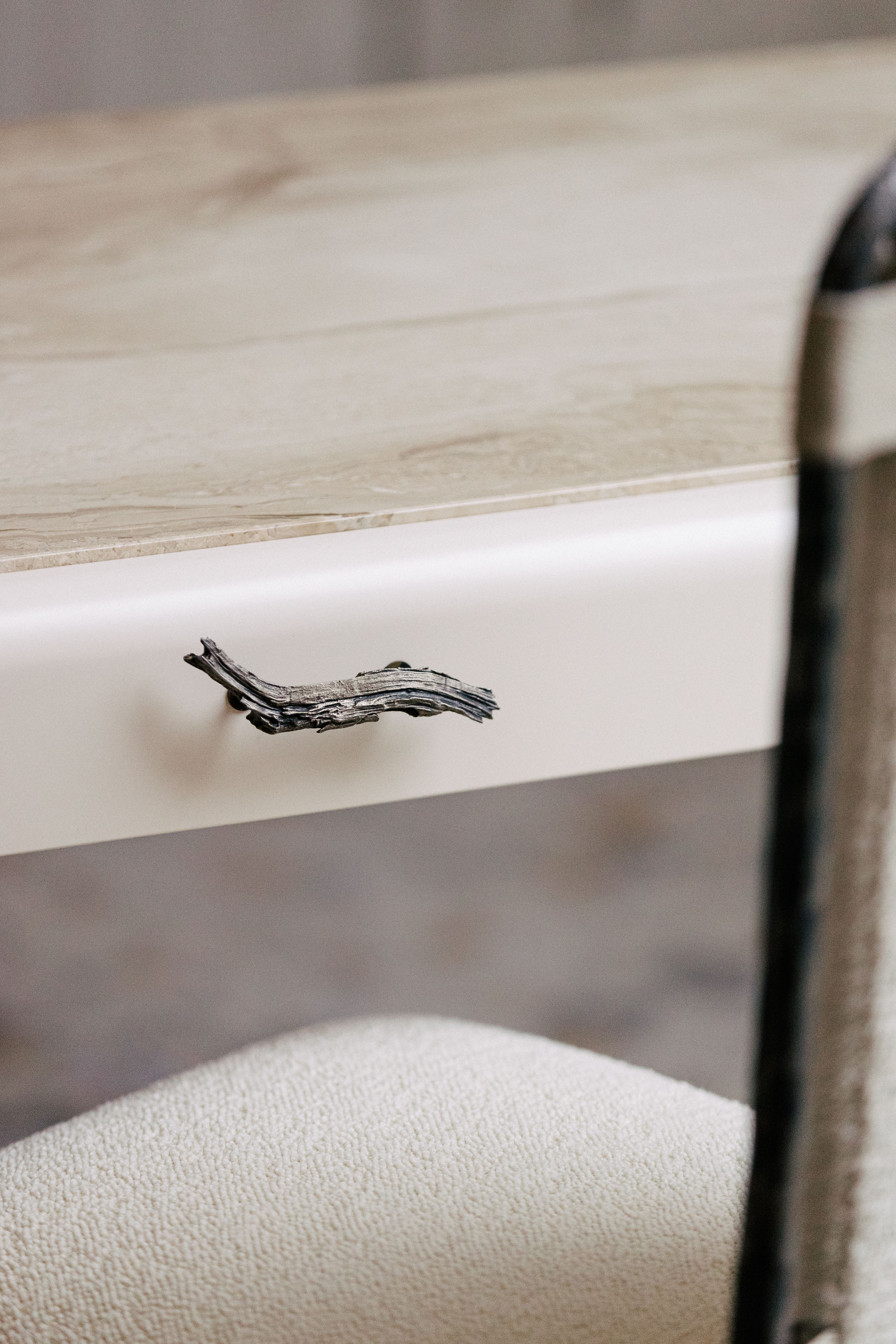 Avec ses pieds gainés et son cadre laqué, le bureau de la collection Amarante affirme son esprit résolument Art Déco. Ses lignes sobres et son plateauen marbre massif de Perlato d’Olympe lui donnent son élégance naturelle. La poignée de son tiroir principal, en bronze, a été moulée à partir d’une réelle branche. Ciselée dans les ateliers de Rinck, ce détail ornemental introduit un élément venant faire écho à la nature.