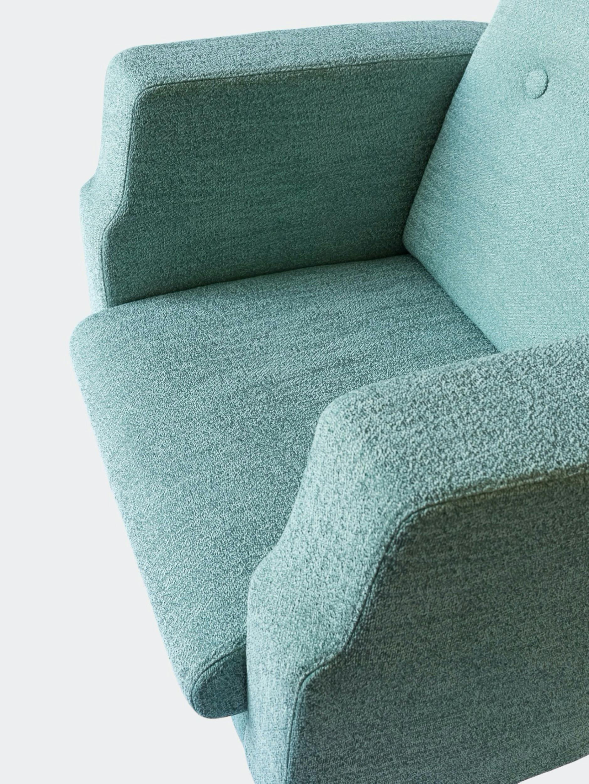 Reprenant la fonction du fauteuil Club pour mieux en détourner les codes, le fauteuil de la collection Hébé propose une esthétique courbe et généreuse, et un tissu rappelant ceux des tailleurs pour dames. Un cocon souligné par le contraste de son piètement, dont la finesse est inspirée des tables Rinck dessinées dans les années 30, à l’époque Art Déco. Cette pièce se marie parfaitement avec le canapé de la collection, ainsi qu’avec la gamme de coussins développés pour l’occasion.