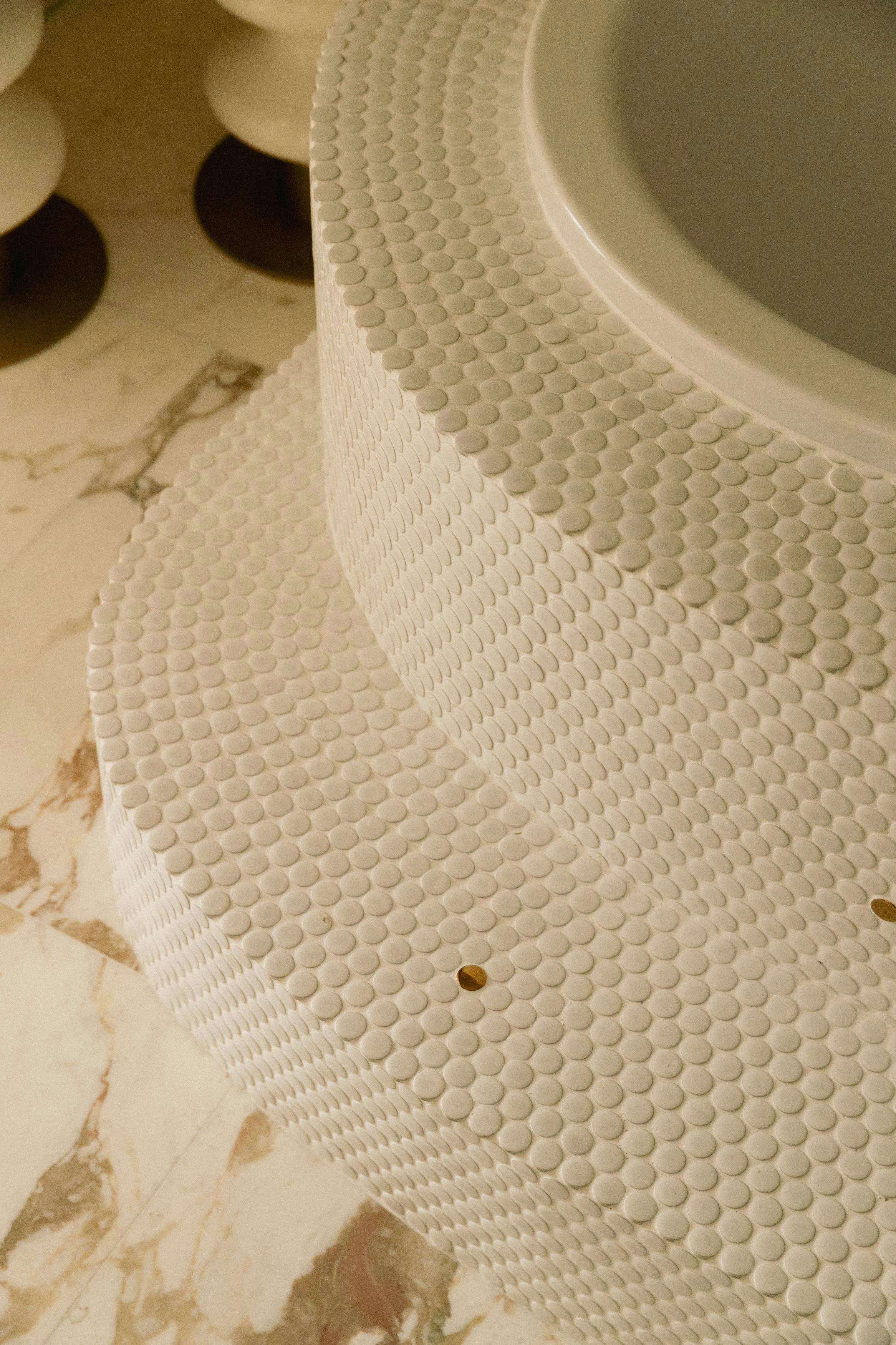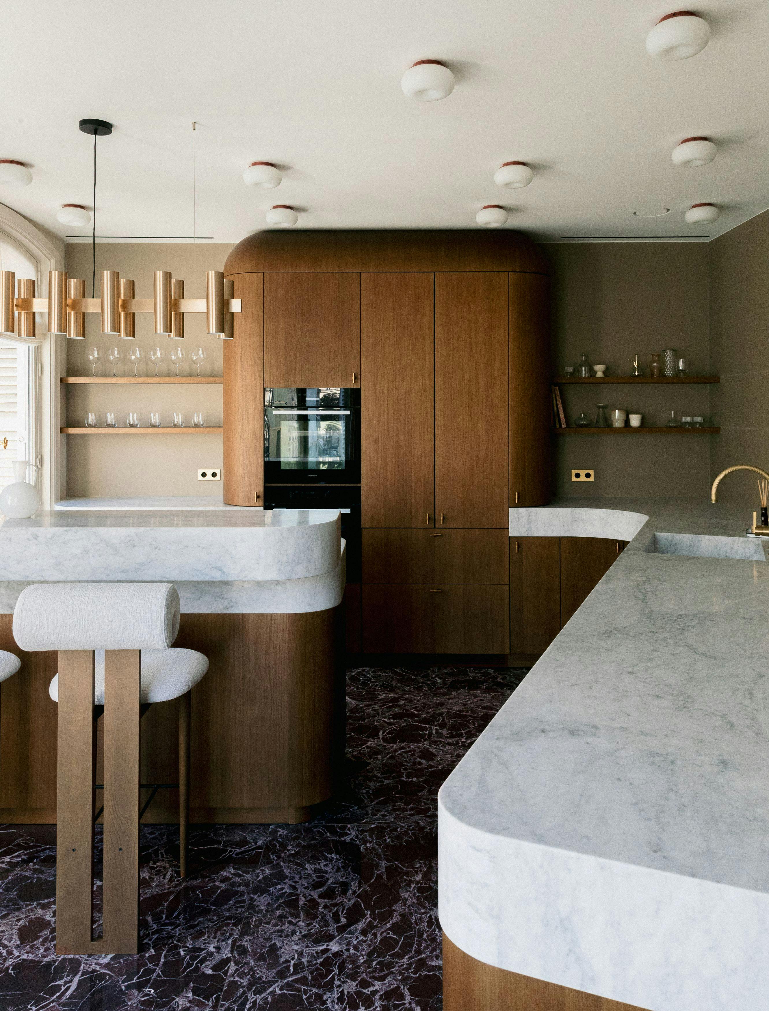 Ainsi, l’ensemble du projet repose sur une palette de matériaux sélectionnés pour leur capacité à structurer la lumière et à souligner la douceur des volumes. Le marbre de Carrare habille la cuisine, tandis que le Calacatta Oro sublime la salle de bain master. Les mosaïques artisanales, les parquets en chêne, le verre décoratif, les feuilles d’or, les miroirs sur mesure et la laque mate complètent cet univers texturé et raffiné.