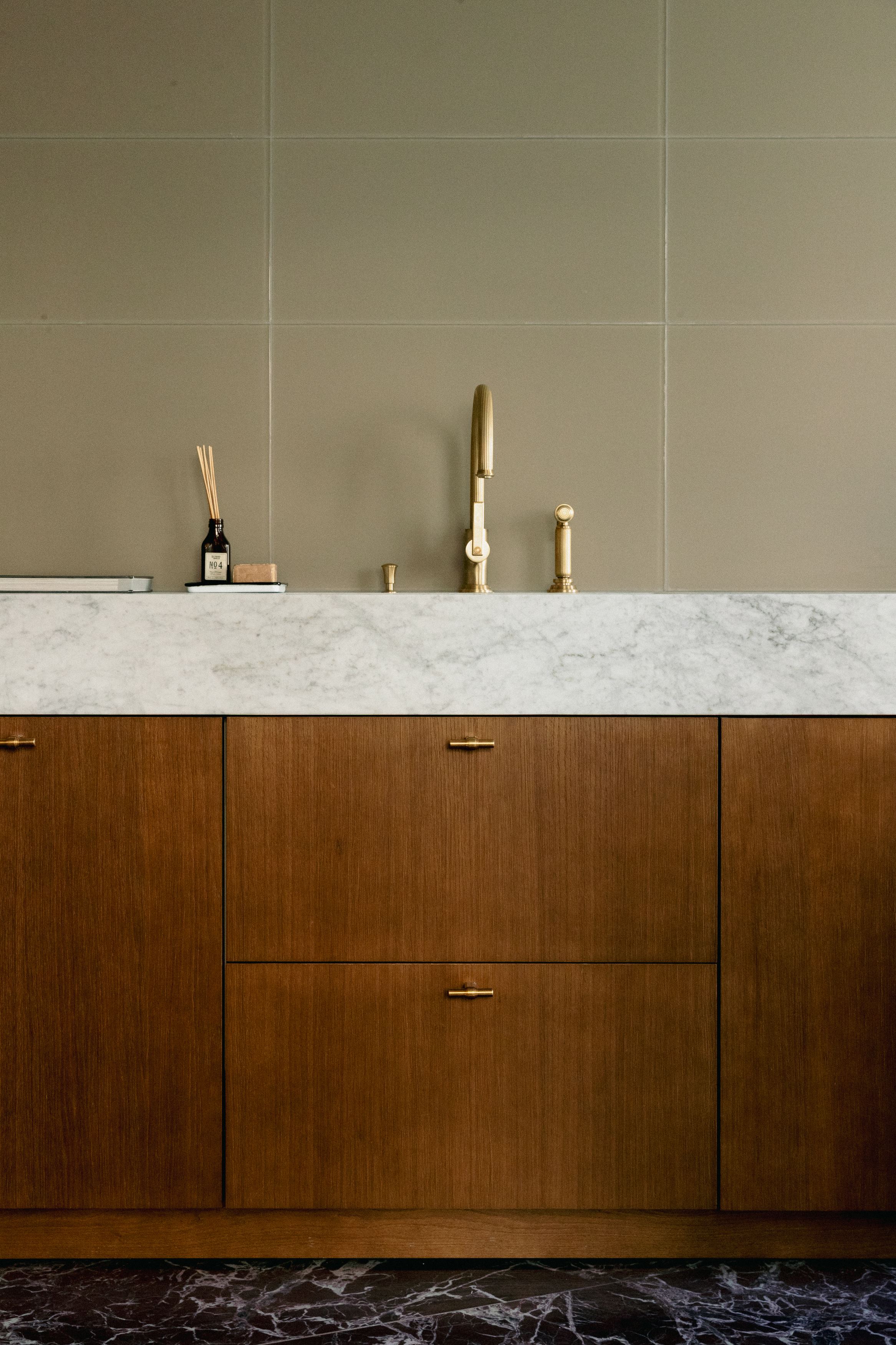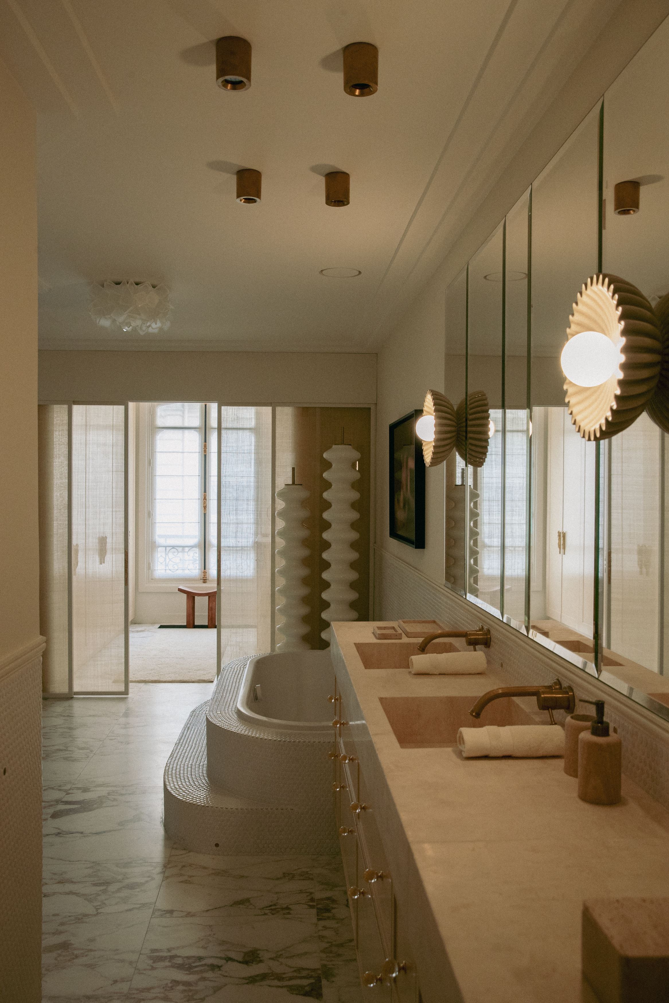 Ainsi, l’ensemble du projet repose sur une palette de matériaux sélectionnés pour leur capacité à structurer la lumière et à souligner la douceur des volumes. Le marbre de Carrare habille la cuisine, tandis que le Calacatta Oro sublime la salle de bain master. Les mosaïques artisanales, les parquets en chêne, le verre décoratif, les feuilles d’or, les miroirs sur mesure et la laque mate complètent cet univers texturé et raffiné.